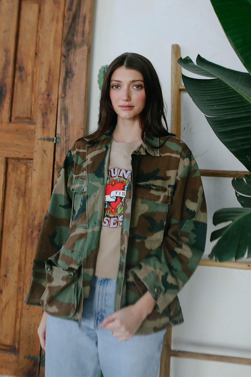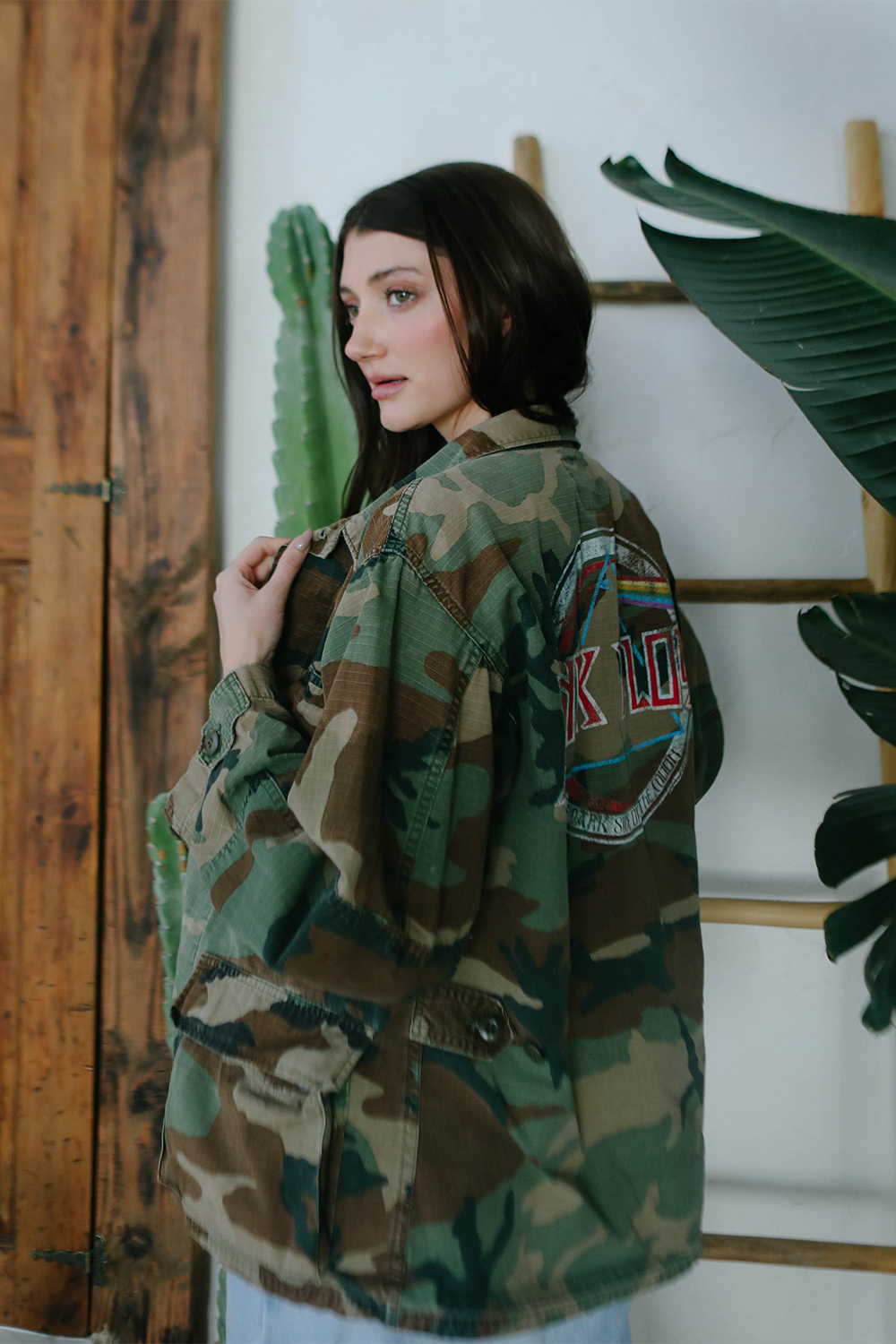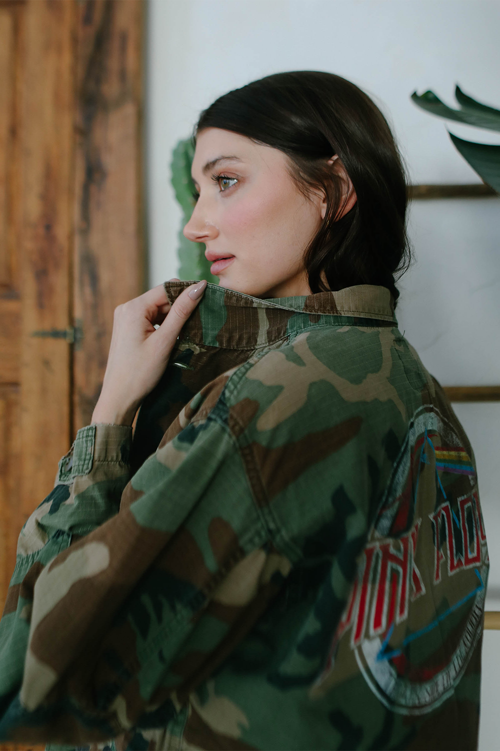 You won't find another one like this. Our upcycled authentic military camo army jacket is true vintage from the 1970s. Each piece is entirely unique and has its own history. Featuring Pink Floyd's iconic Dark Side of the Moon graphic, this jacket is a must for any fan of rock music and authentic military grade apparel.