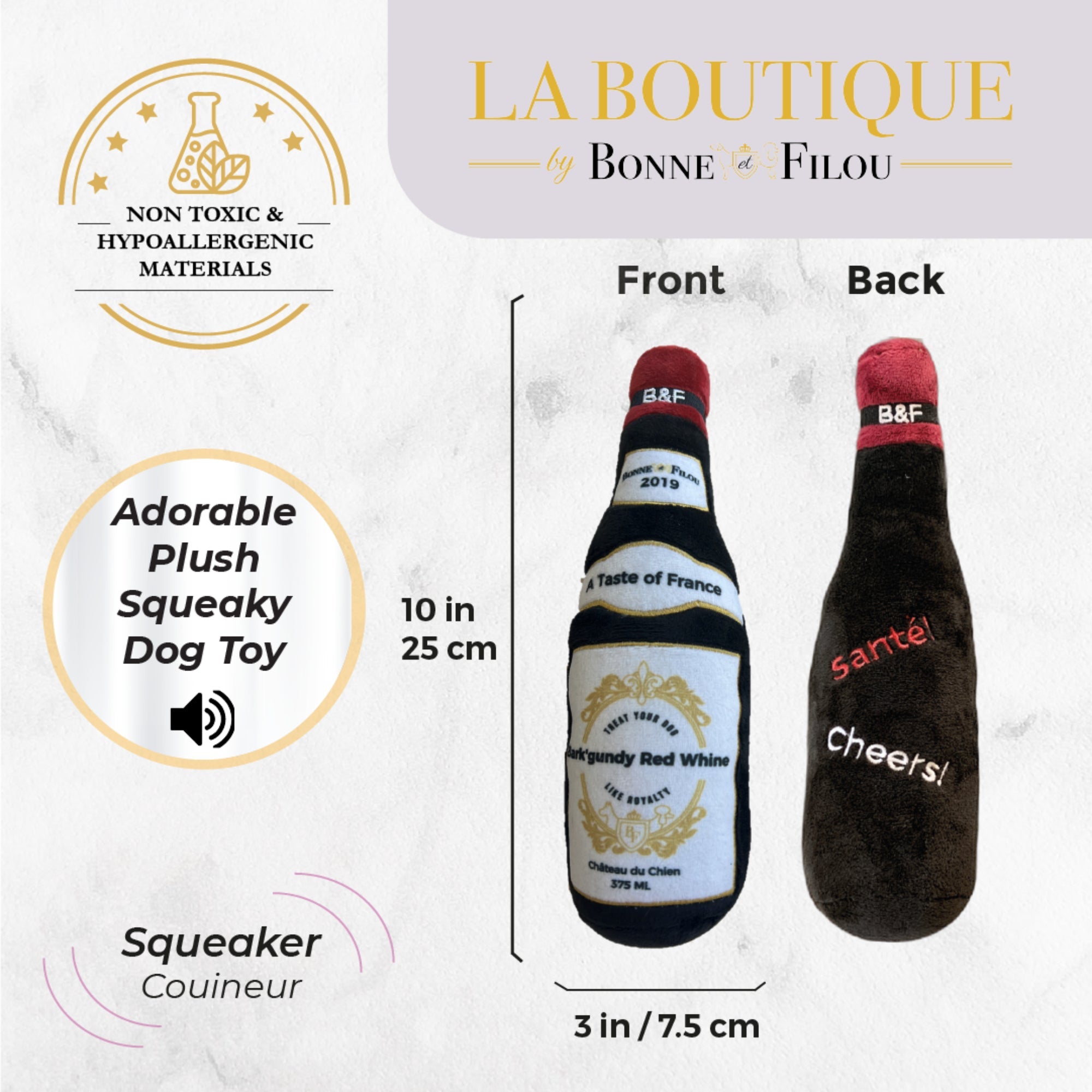 (1) Bottle of our exclusive Bark’gundy Red Whine (with squeaker) - every Pampered Pup should have their own whine bottle, don't you think? Santé (Cheers)!