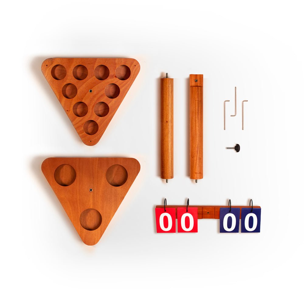 This finely-crafted Portable Scoring Tower features stained, handcrafted mahogany and premium solid wood. It packs up easily for games on the go with minimal assembly. The cup holders are perfect for your drinks, and the sturdy base includes three stakes and rubber feet for stabilizing your tower on soft or hard surfaces.