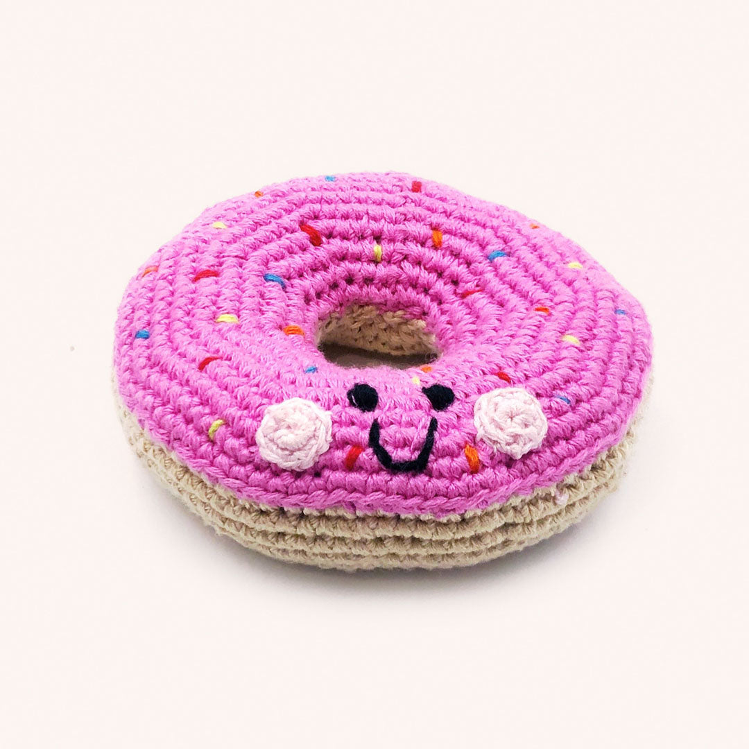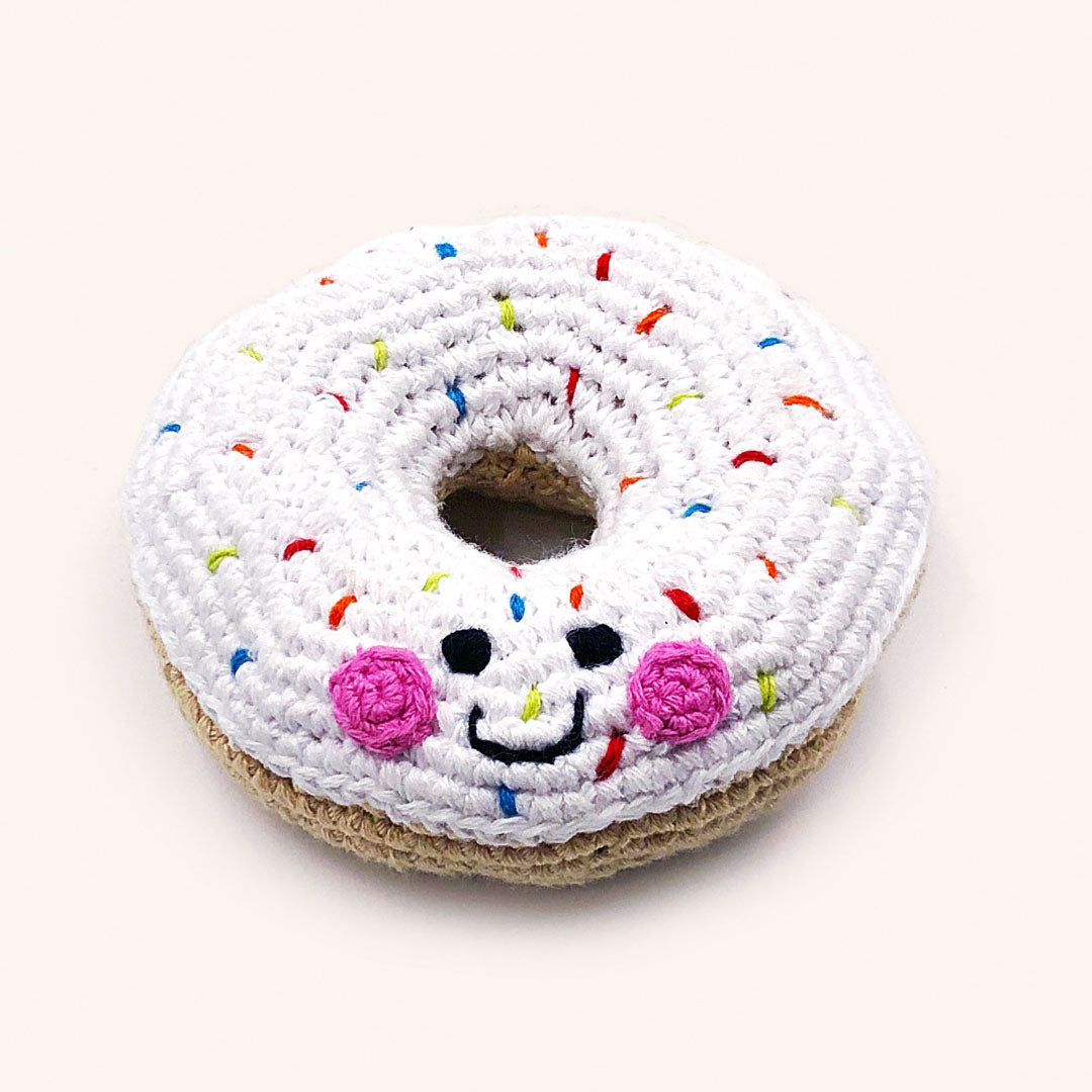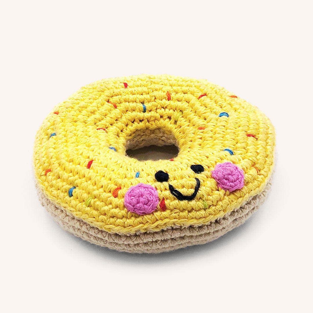 This life-size soft doughnut baby toy looks tantalizing enough to eat! Covered with multicolored sprinkles, each rattle makes a soft jingle when shaken. Handmade with soft cotton yarn, this playful rattle is lightweight and full of hours of imaginative, sweet fun!