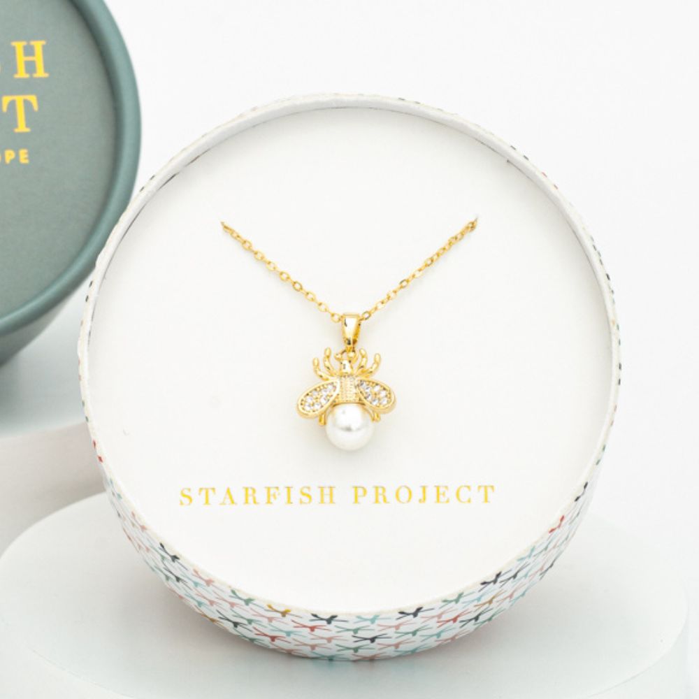 Our 14K plated gold Queen Bee Pearl Necklace is the perfect accessory to add a little sparkle, fun, and elegance to any look! Not only will you shine with pearl and zircon accents, but you'll also make a positive impact on the lives of the Starfish Project women.