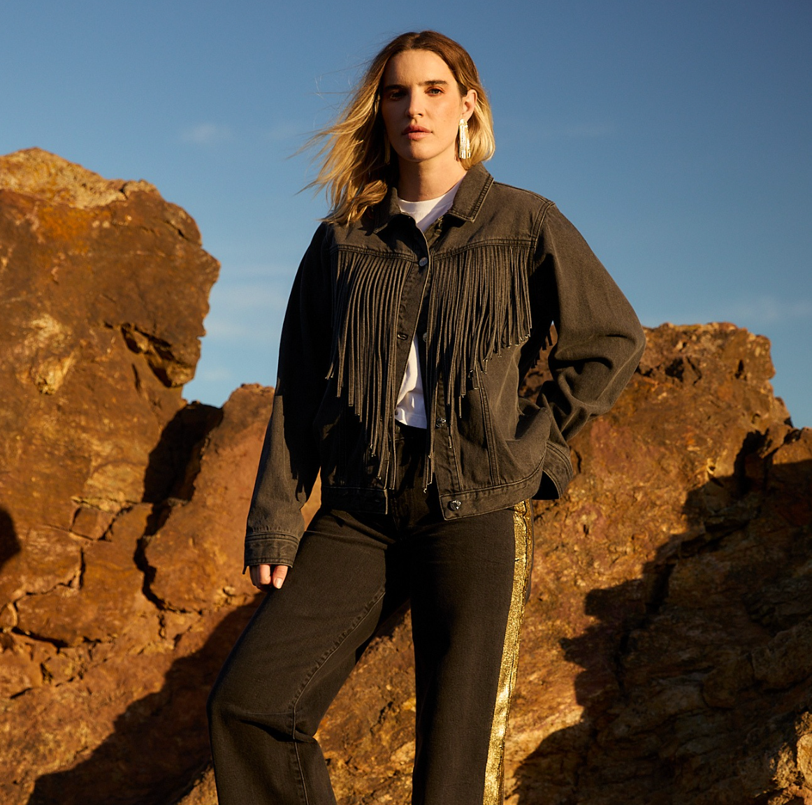Glam up your holiday style with our Rebel Wide Leg in Carbon Wash with a gold tuxedo stripe. These jeans are designed to make a statement, featuring a stunning gold foil stripe running down the out seam of both legs. With a flattering high rise, contour waist band they offer a comfortable yet sophisticated fit. Relaxed through the hip and opens up into a dramatic, wide leg opening. Your perfect piece for every holiday party!