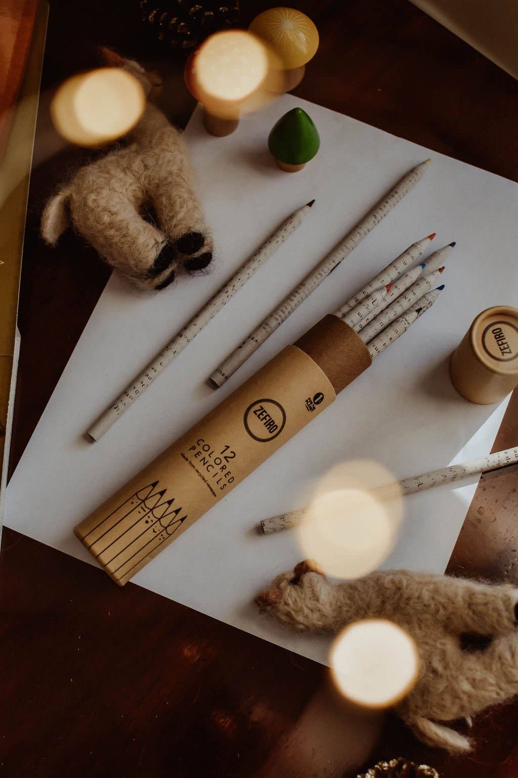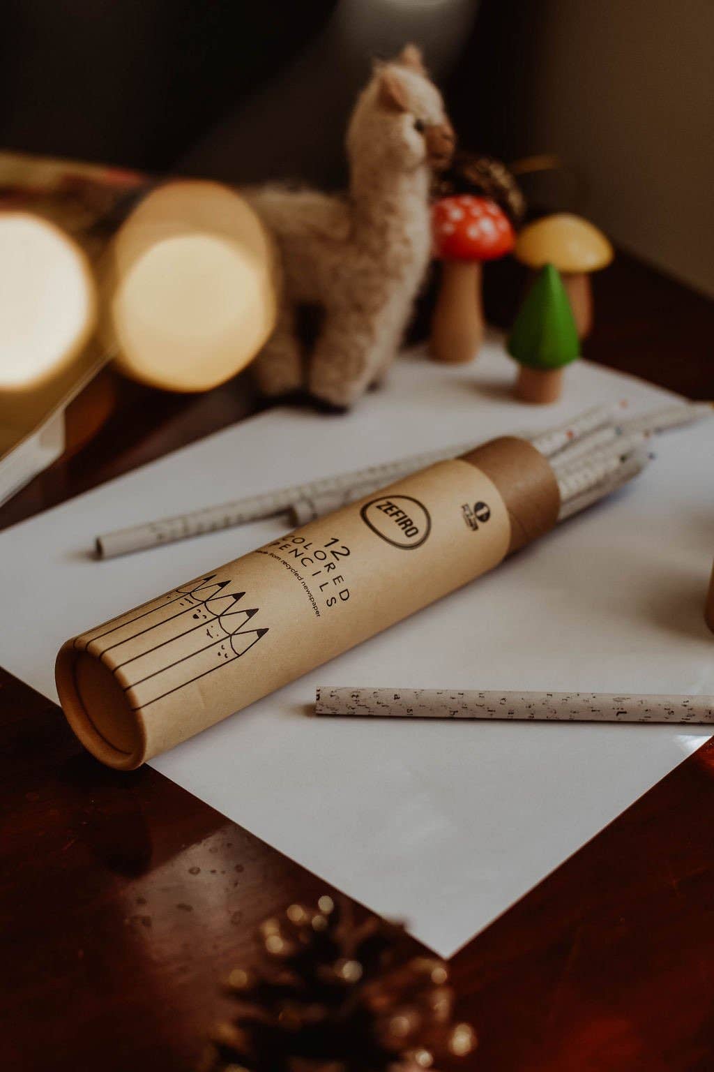 - Set of 12 colored pencils made from 100% recycled newspapers