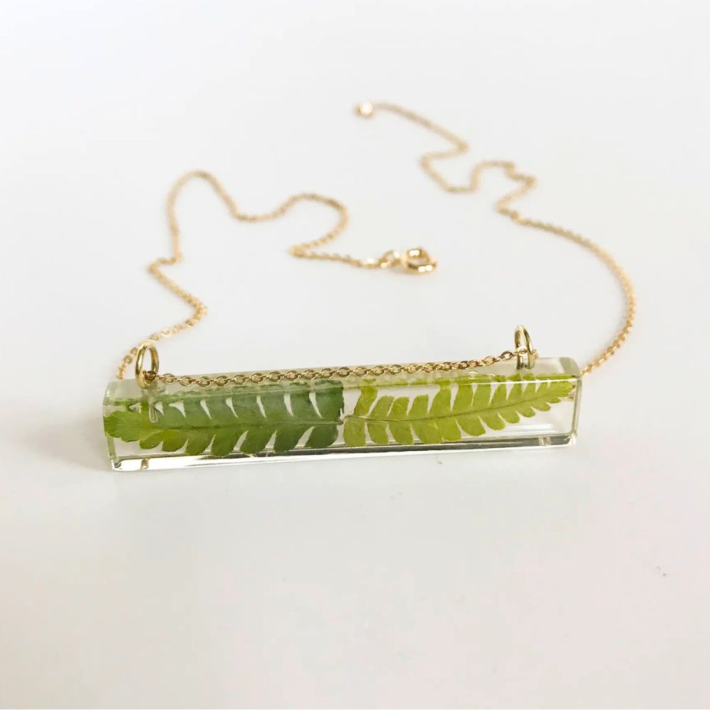 Hand-cast botanical long bar pendant features real fern suspended in clear eco-resin. Due to the handmade nature of this item, each is unique and will vary.
