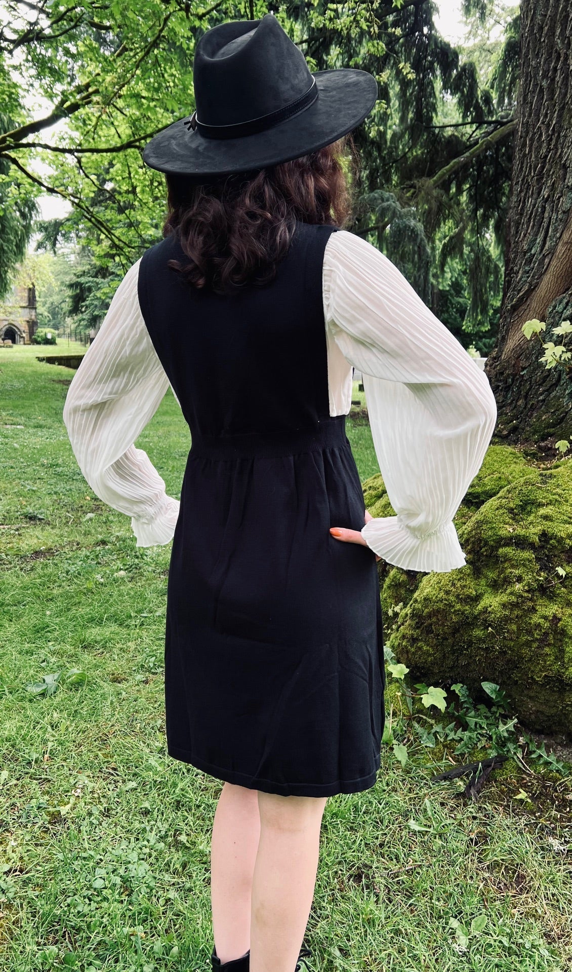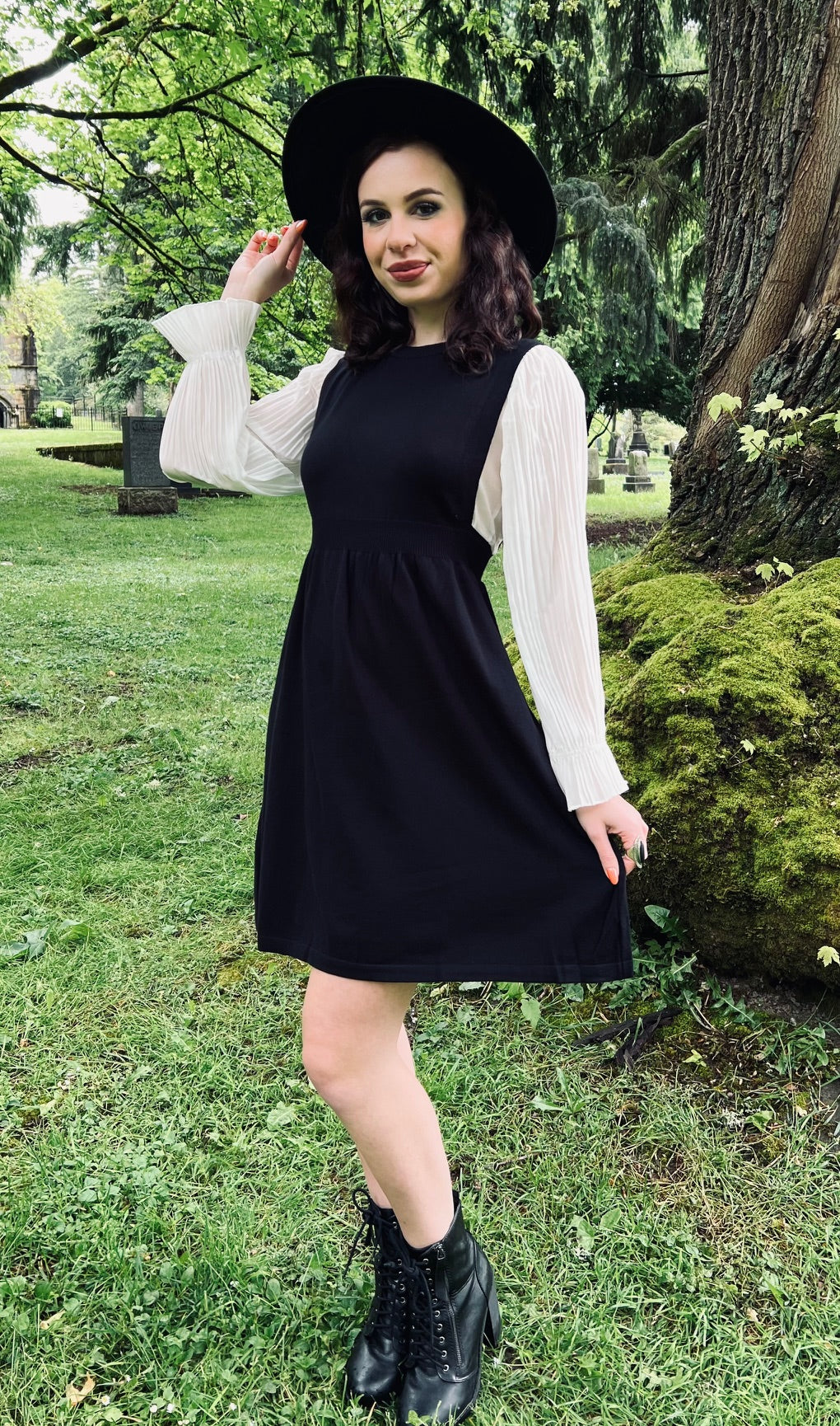 Equal parts studious and spellbound, the Rue Dress brings dark academia charm with a gothic twist. Designed to look like your favorite layered combo — billowy blouse and classic pinafore — this one-piece wonder makes getting dressed feel like magic. Soft knit fabric keeps you warm through long library hours or stormy cemetery strolls, while the illusion of a pinafore adds a touch of vintage schoolgirl mischief. Pair with knee-high boots, lace gloves, and a well-worn copy of Poe for maximum effect.