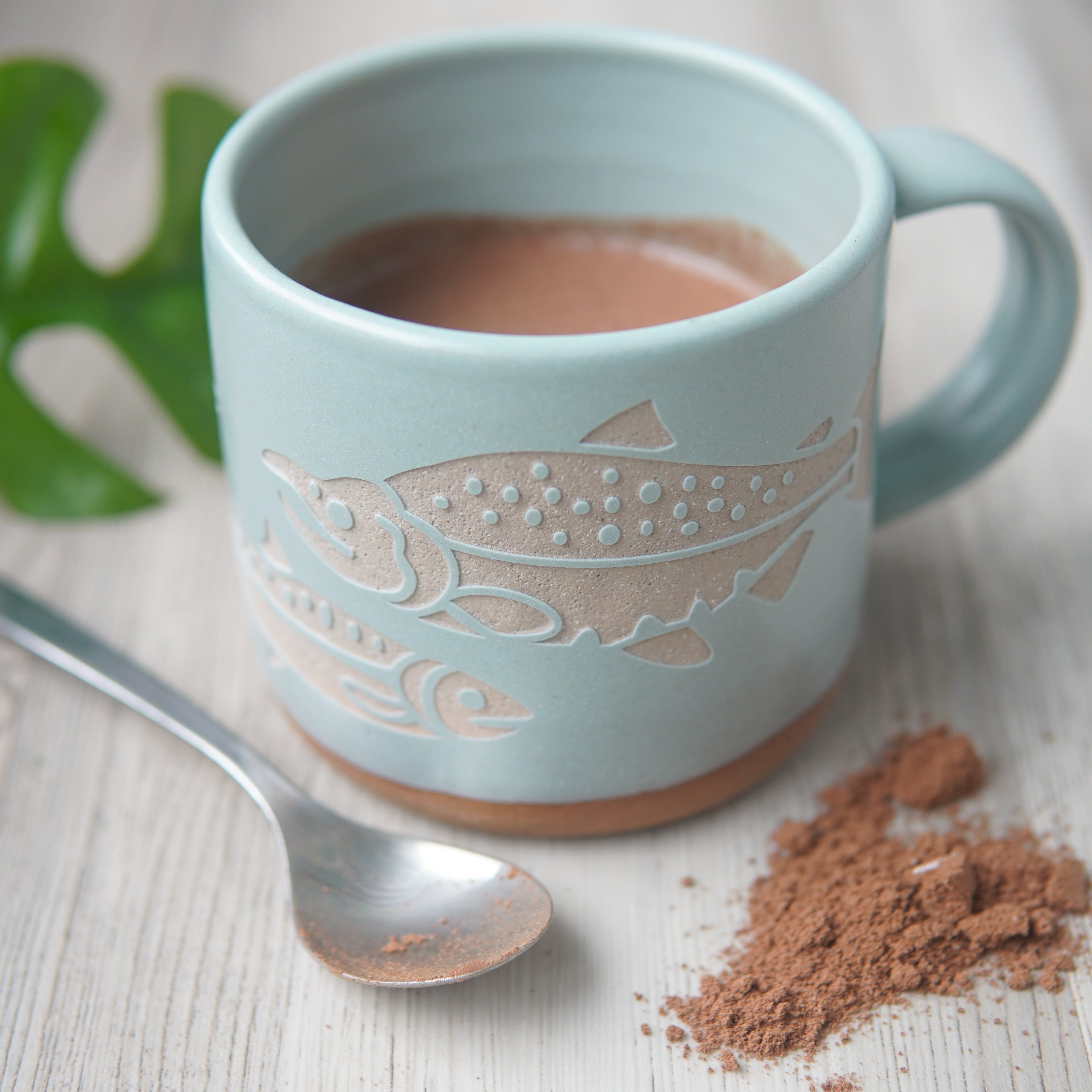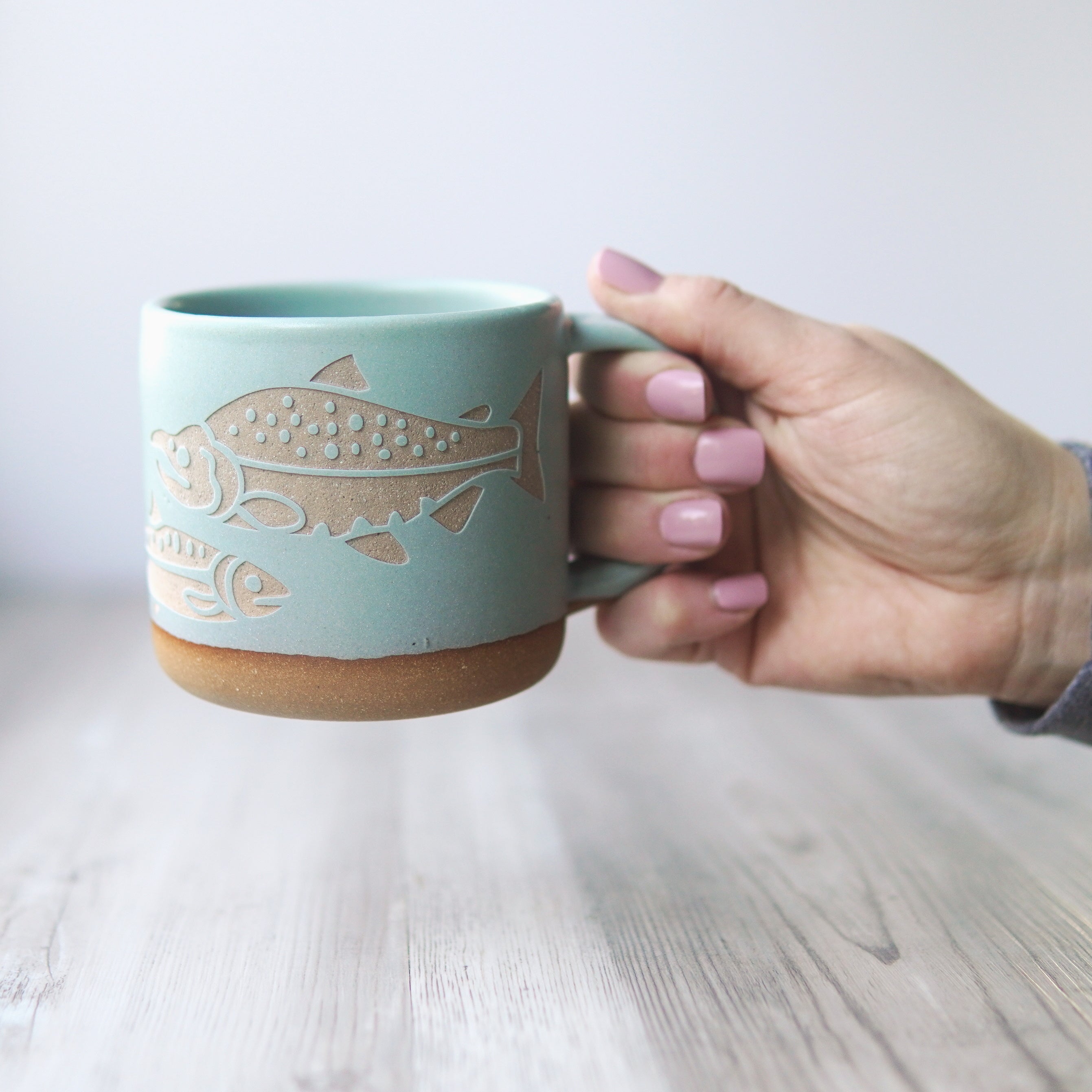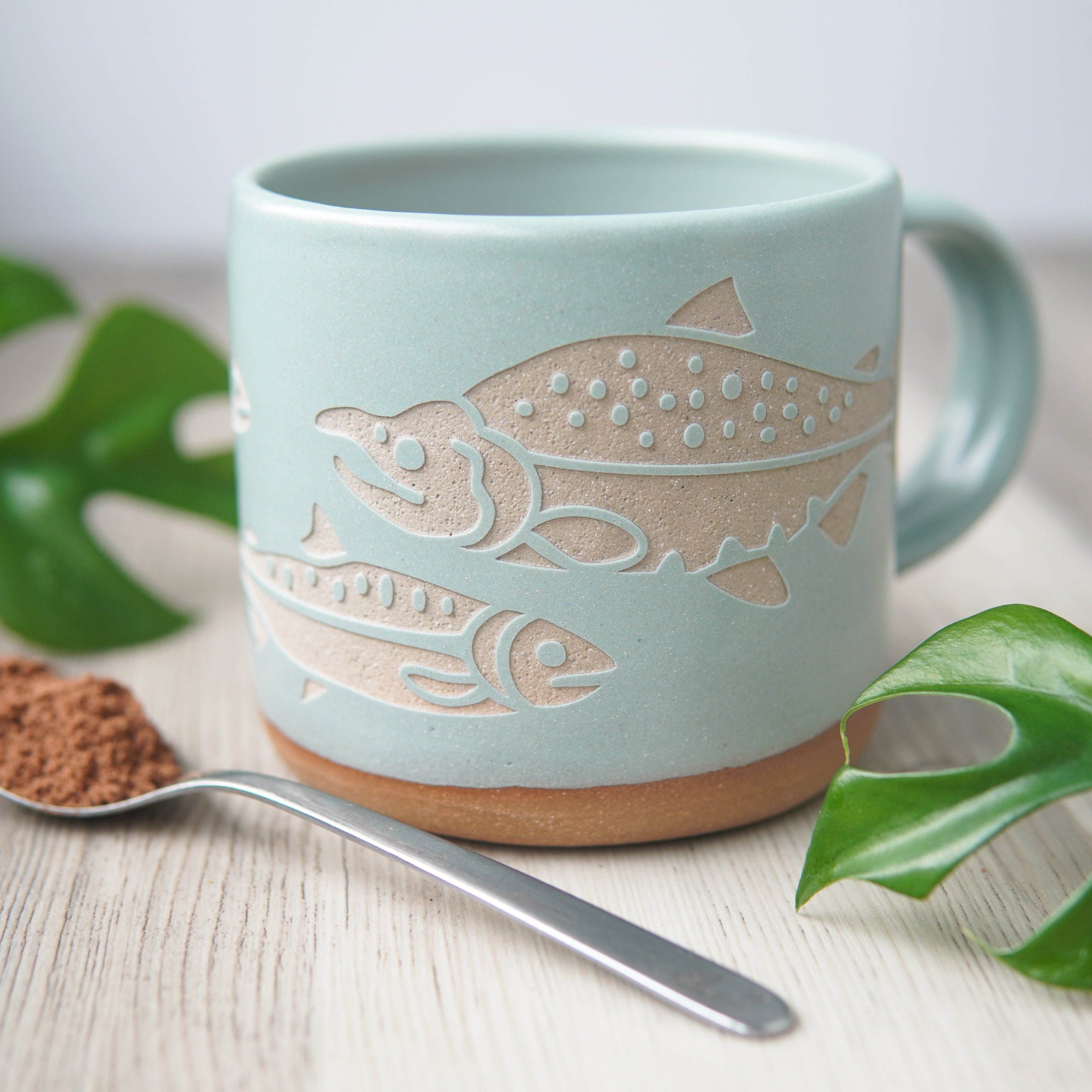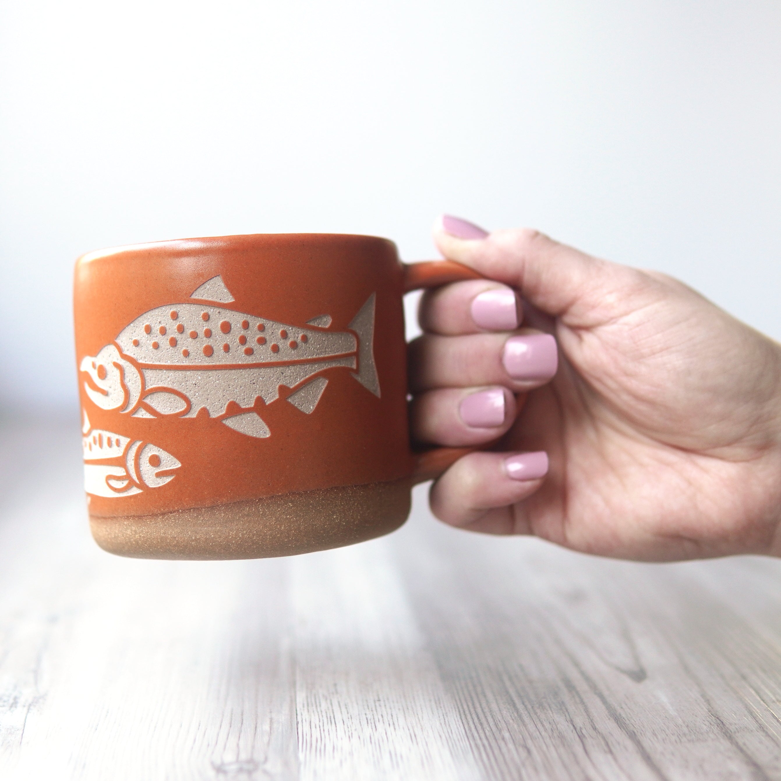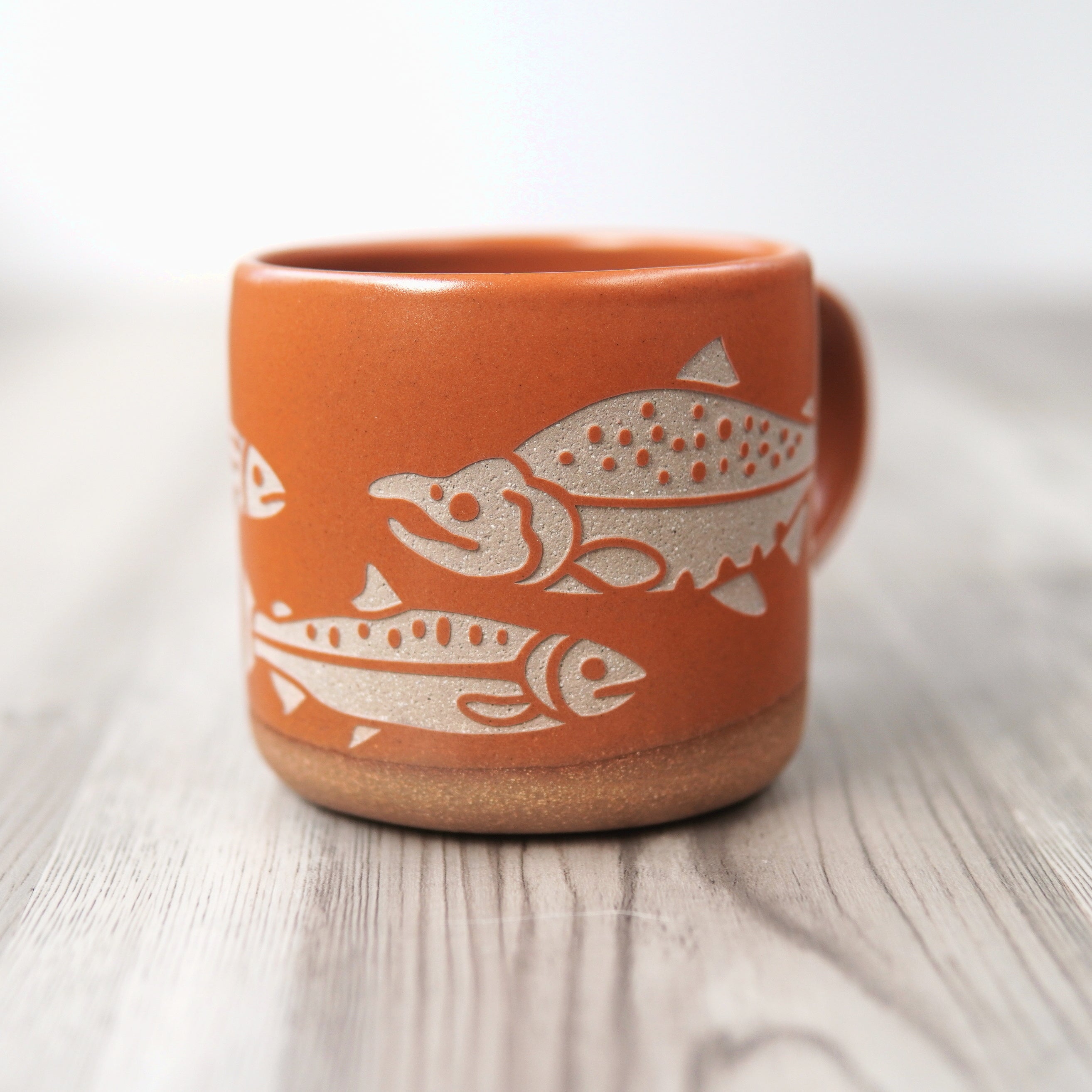 Our engraved salmon mugs bring rustic charm to your home or fishing cabin. Perfect for folks who like to fish, especially dads and grandfathers. The wraparound design shows salmon in different stages of development, with a full-grown sockeye salmon swimming back upstream to spawn.