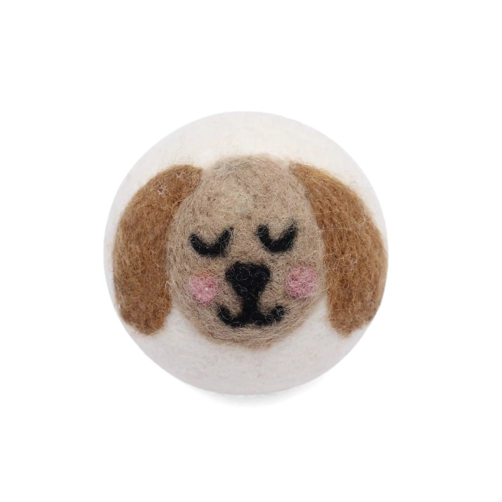 These hand felted dryer balls are beautifully finished with happy dog faces. The set includes a Corgi, a brown dog and a dark brown dog.