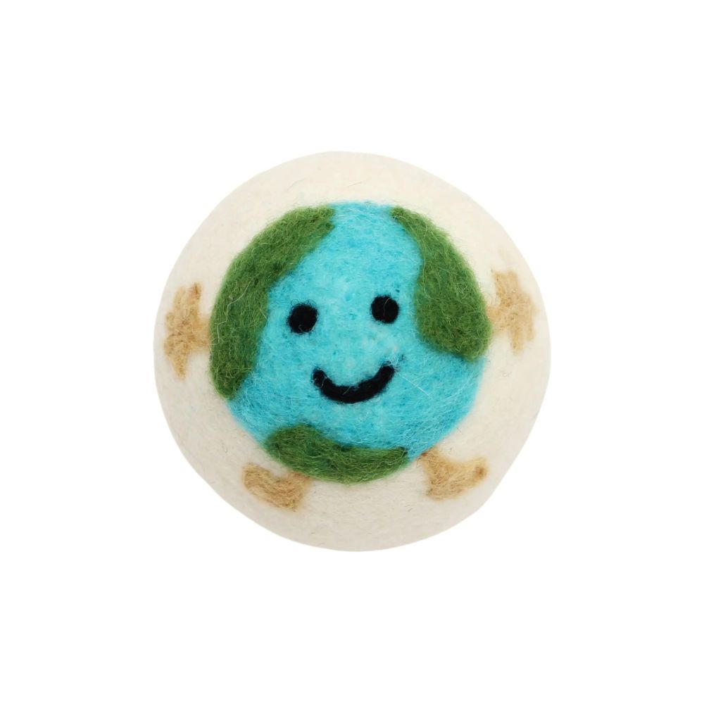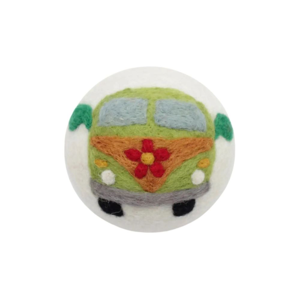 These hand felted dryer balls are beautifully finished with fun nostalgic symbols that take us back to yesteryears. The set includes a colorful love, a hippie flower power bus, and a happy planet Earth.