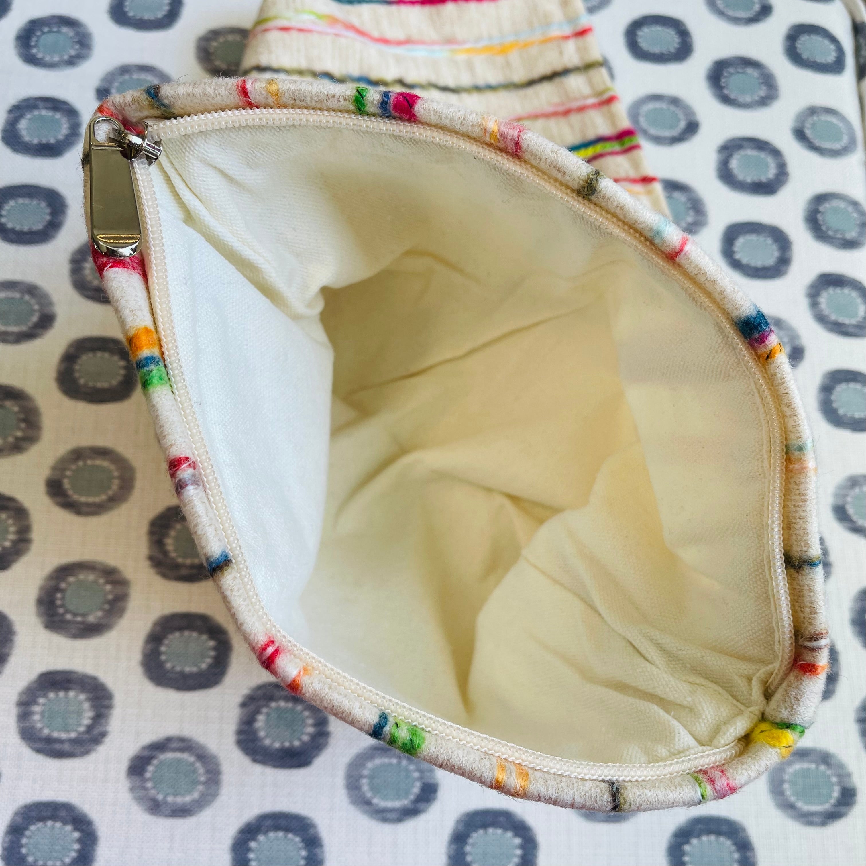 Three (3) bright woven stripe zip pouches with plenty of rainbow color to liven up your day. These bags are made by hand and each one is unique, please expect variations in color and pattern. Each canvas bag has a lined interior and measures: