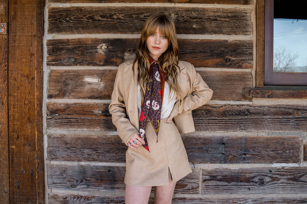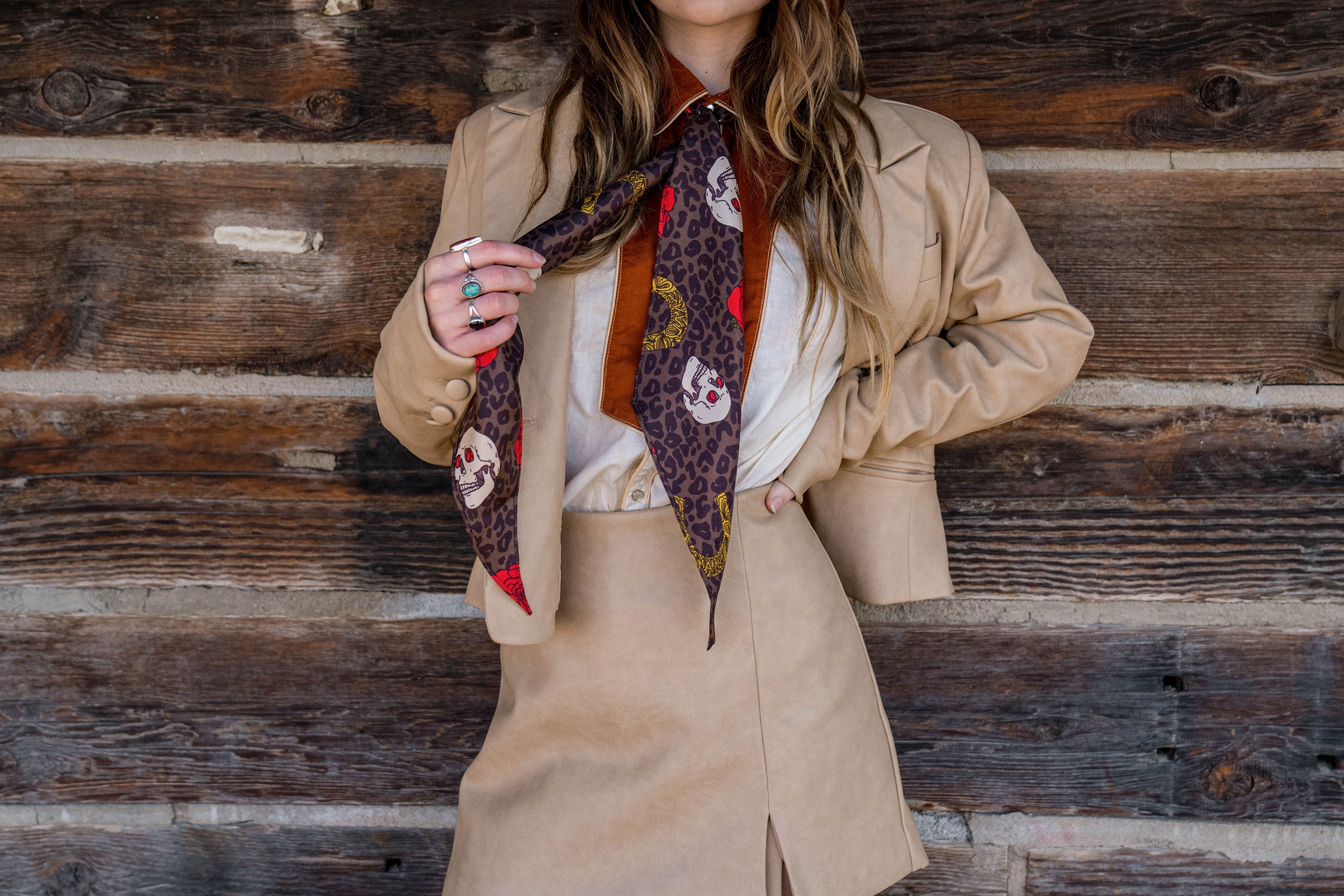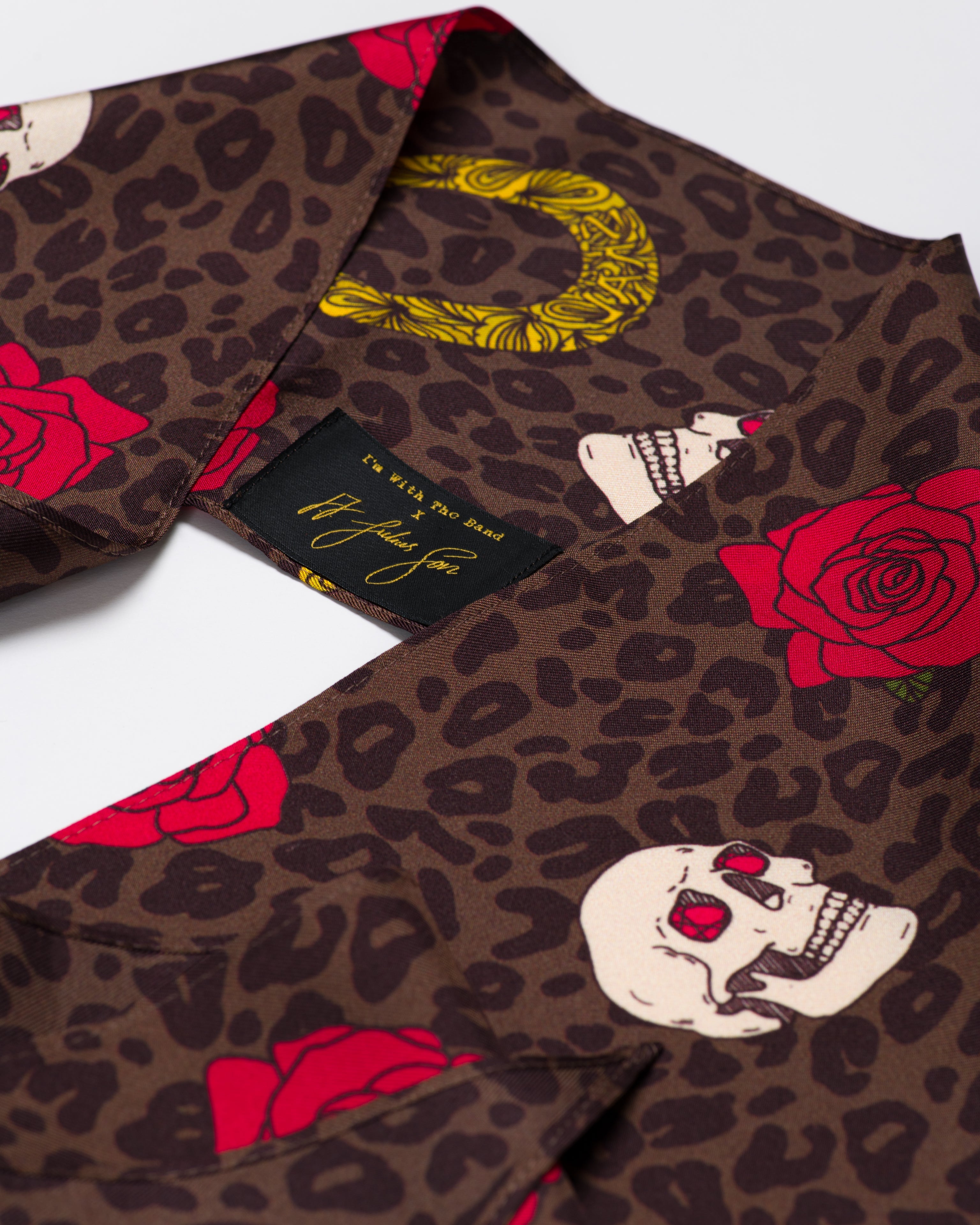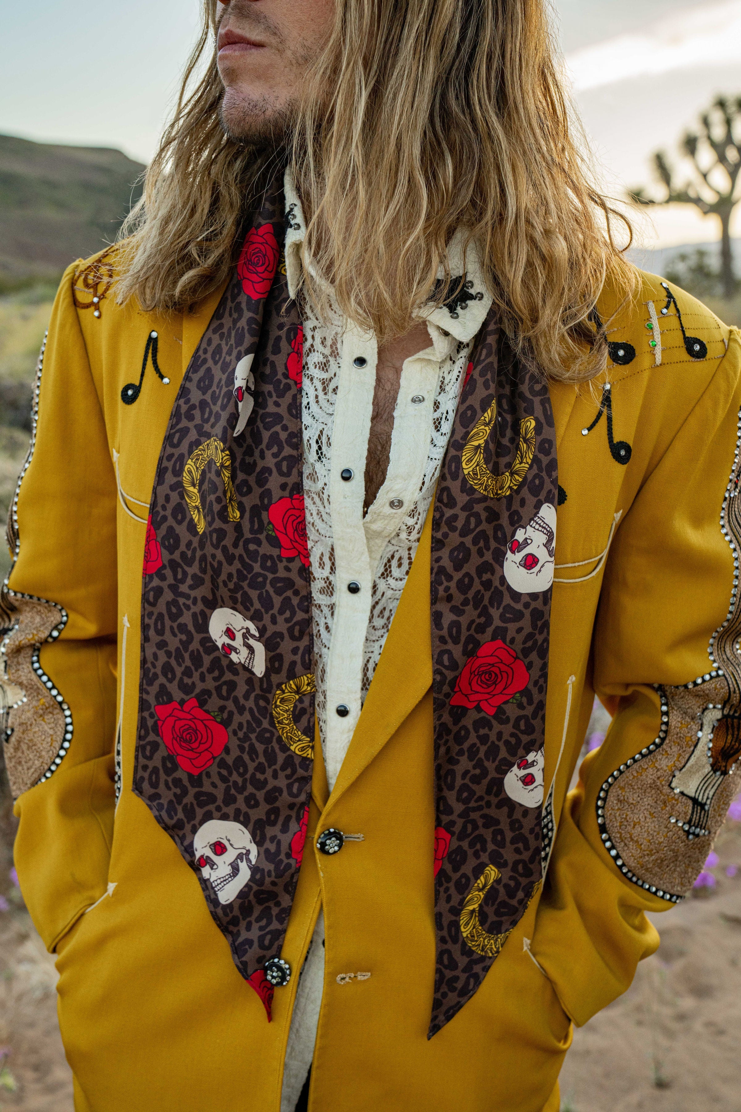 Crafted in collaboration with JJ Julius Son of KALEO. This piece features hand drawn custom designed artwork by Dawn Aquarius. Set atop a dark leopard background and inspired by iconic rock and roll elements, western charm and a favorite Icelandic phrase intertwined within the horseshoe. Made from 100% silk twill, featuring a delicate baby hem and made in an extremely limited quantity.