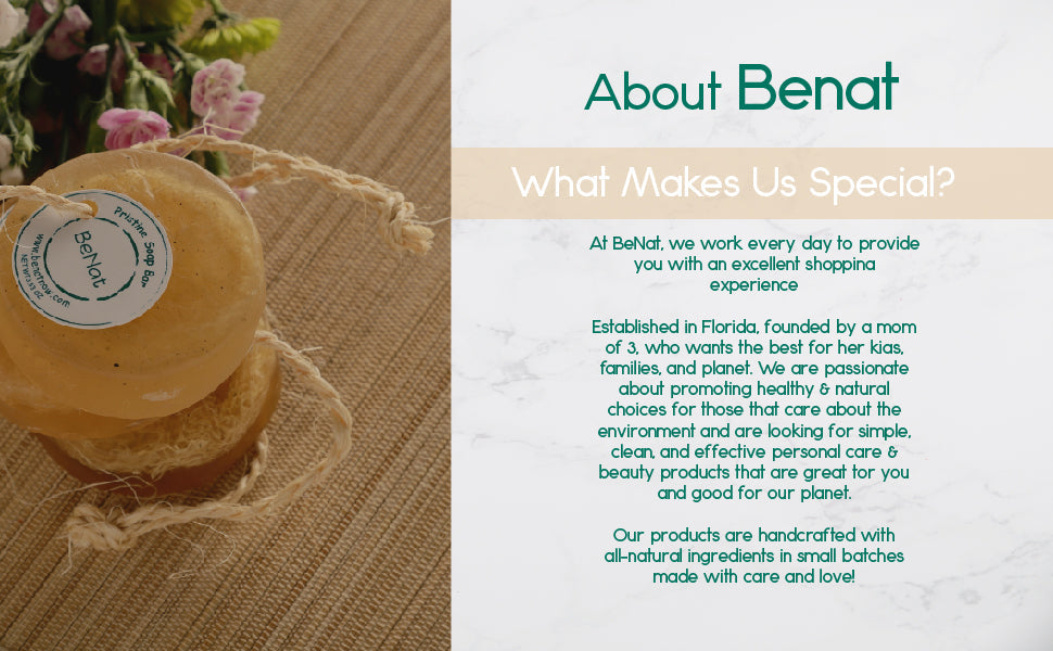 Healthy-looking skin requires the best products in your daily routine. BeNat´s Loofah Soap on a rope. Our Artisanal Bar Collection is the best way to cleanse and soothe your face and body. Enriched with natural ingredients like chamomile, chia, honey, wheat, olive, lemon peel, grey clay, green tea, bamboo extract, parsley, oat, coconut, and almond oil.