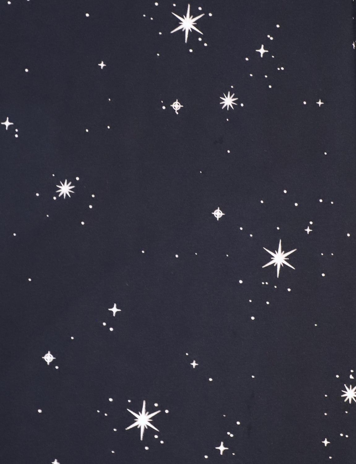 Show off your inner starlet! Our Solar Organic Wrap Dress transforms a classic navy wrap dress into a showstopper. A white hand-screened star design dances across the rich navy jersey cotton fabric, adding a touch of whimsy and celestial magic.