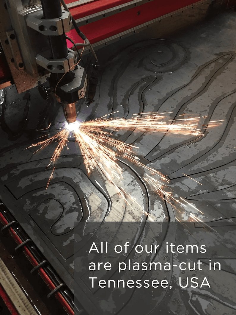 Your item is plasma cut using 16 gauge steel, approximately the thickness of a quarter coin, for a durable yet lightweight piece. The metal is left untreated to maintain its natural finish so it is best kept dry. Because of this, each item may vary slightly in coloration and markings, having it's own unique characteristics.