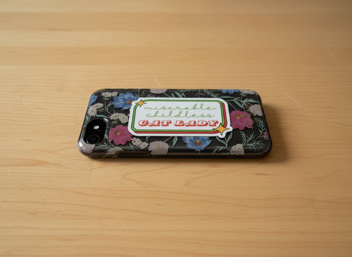 Celebrate your feline devotion with this waterproof sticker featuring a cheeky nod to cat moms everywhere. Measuring 3 inches wide, it's ideal for personalizing laptops, water bottles, or gift-giving to fellow cat enthusiasts. A fun way to embrace the childless cat lady lifestyle with pride and humor.