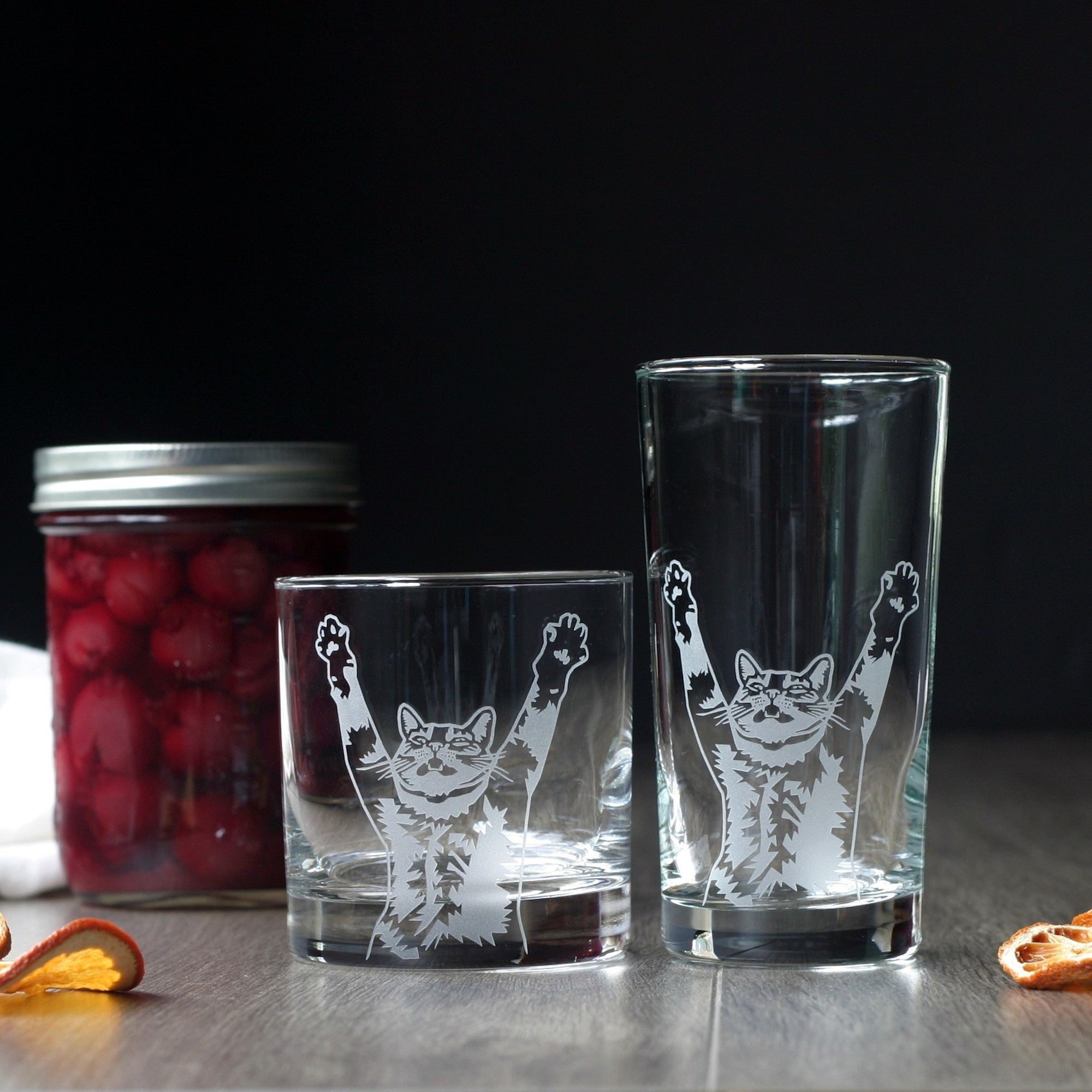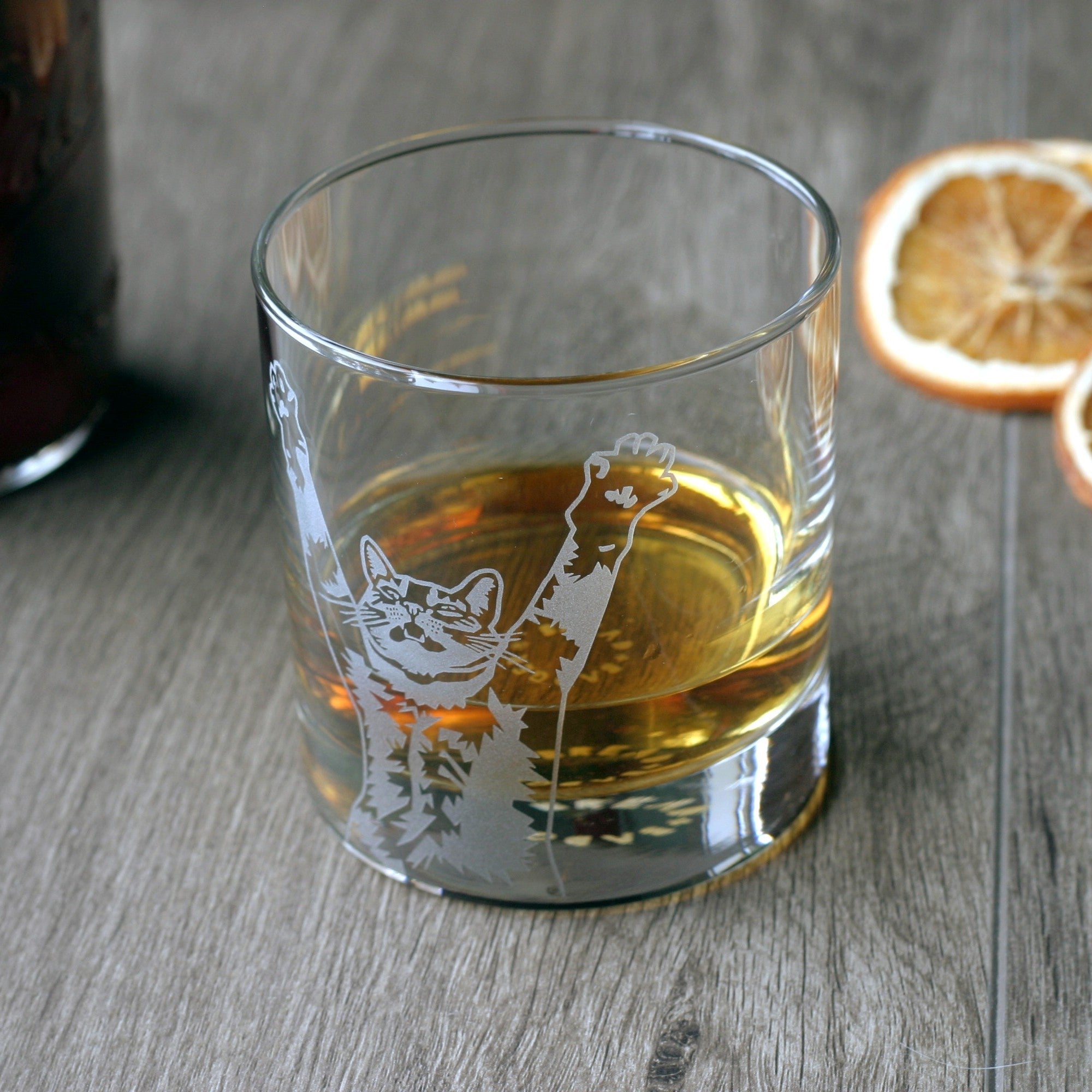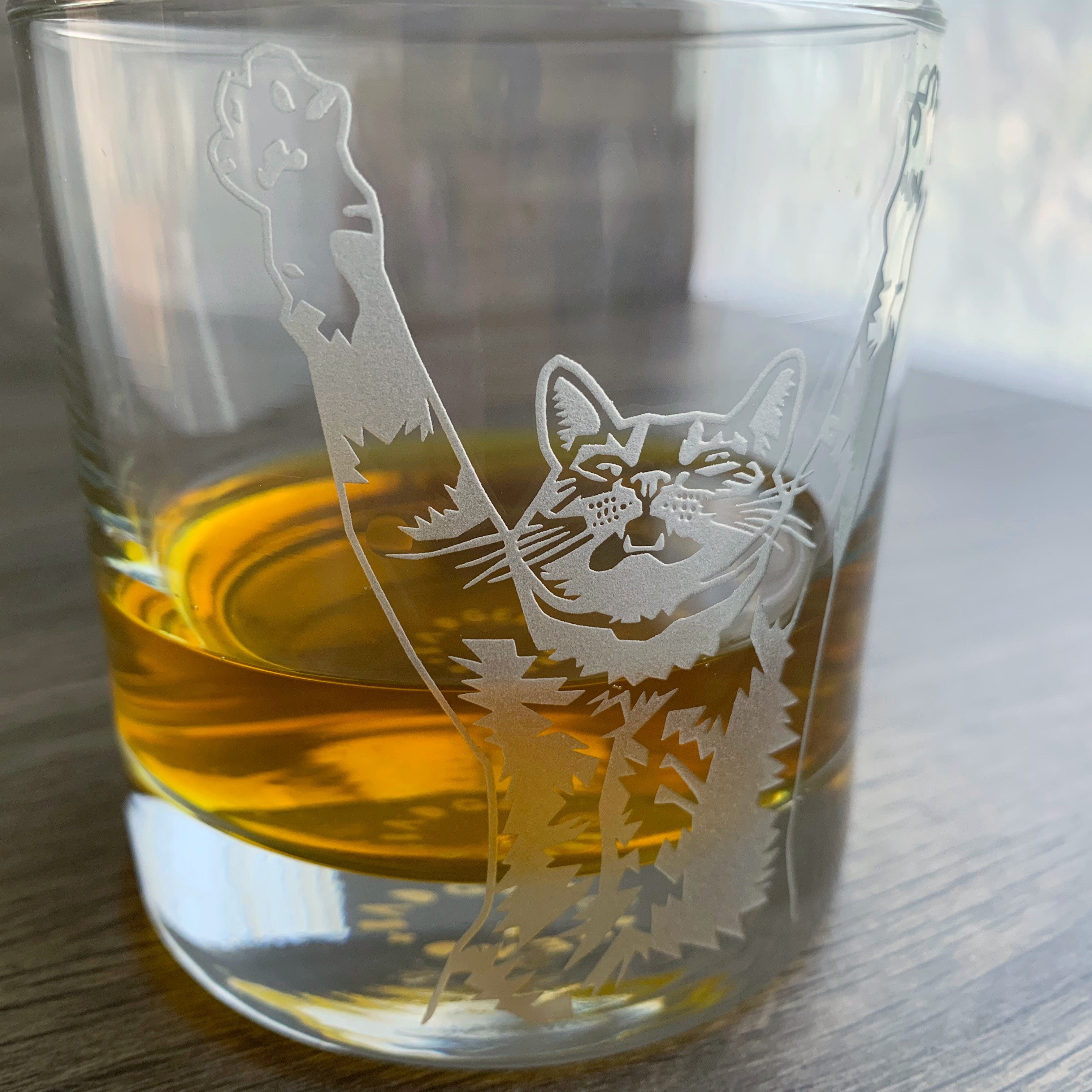 Stretch Cat Lowball Glass - etched cocktail barware