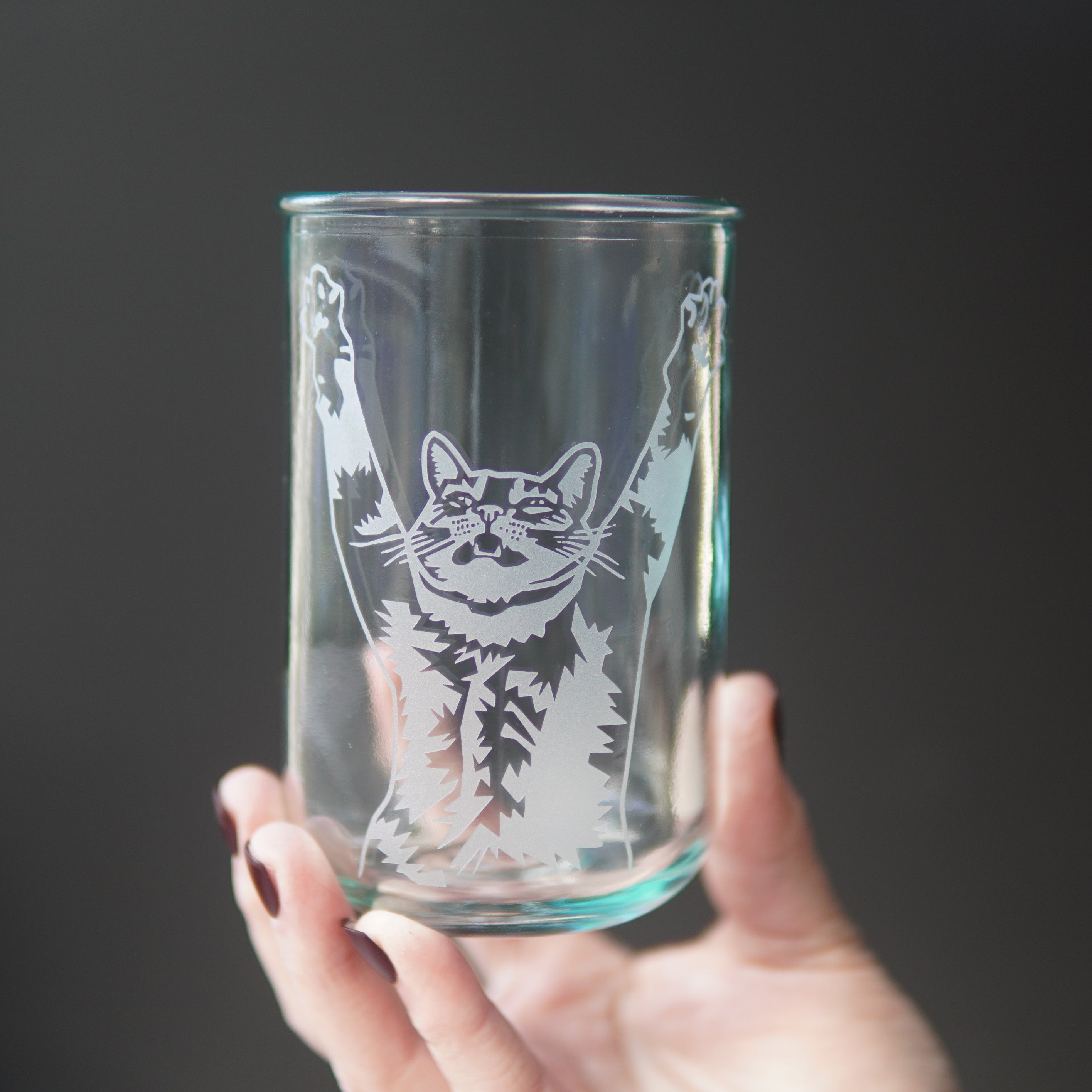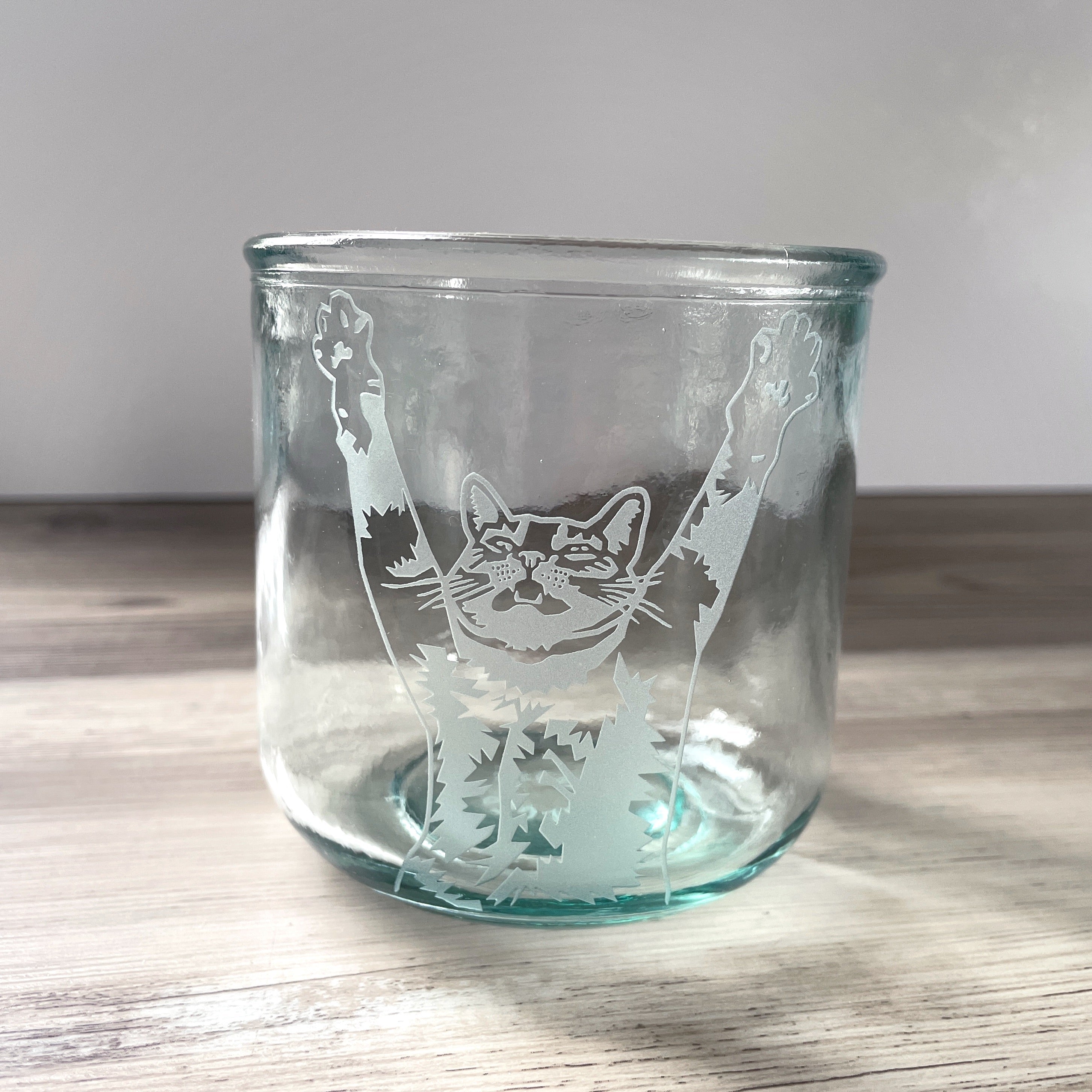 Our etched stretching cat recycled glass tumblers bring rustic charm to your kitchen or den, whether you're into yoga, or just throwing your hands in the air and screaming.