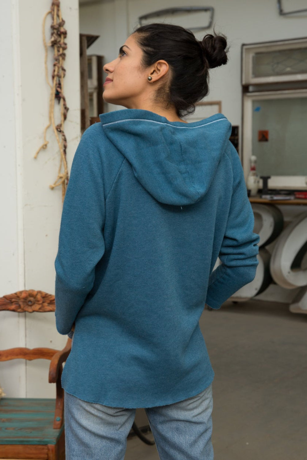 Our blue hoodie sweater features contrast hemline stitching and a classic raglan shape for simple, effortless wear. This casual wardrobe staple is perfect for transitional weather and cool beach nights. As a must-have for any modern capsule wardrobe, this pullover layers perfectly beneath structured jackets and vests.
