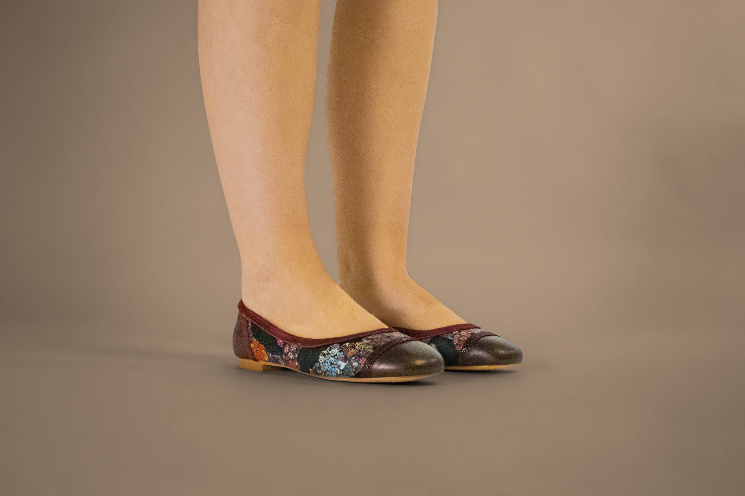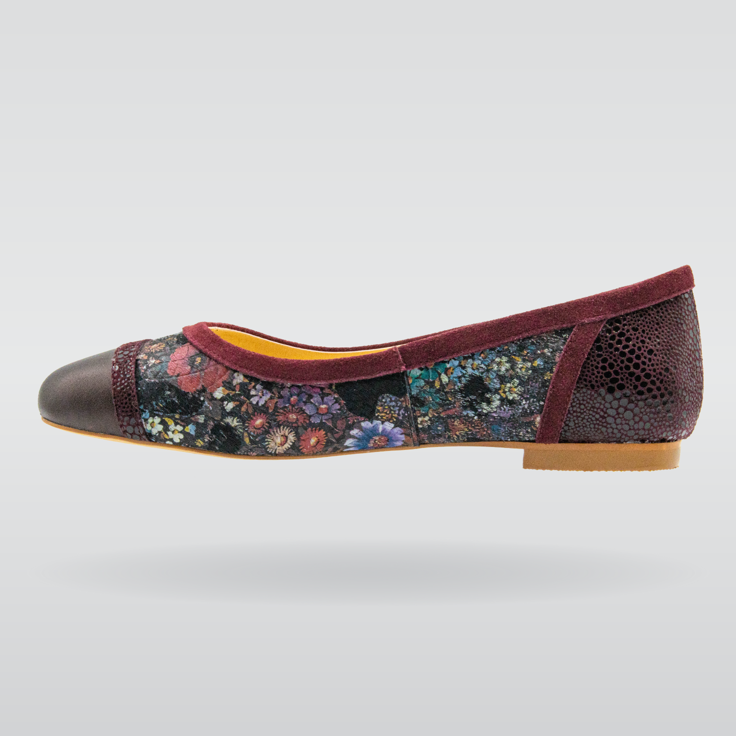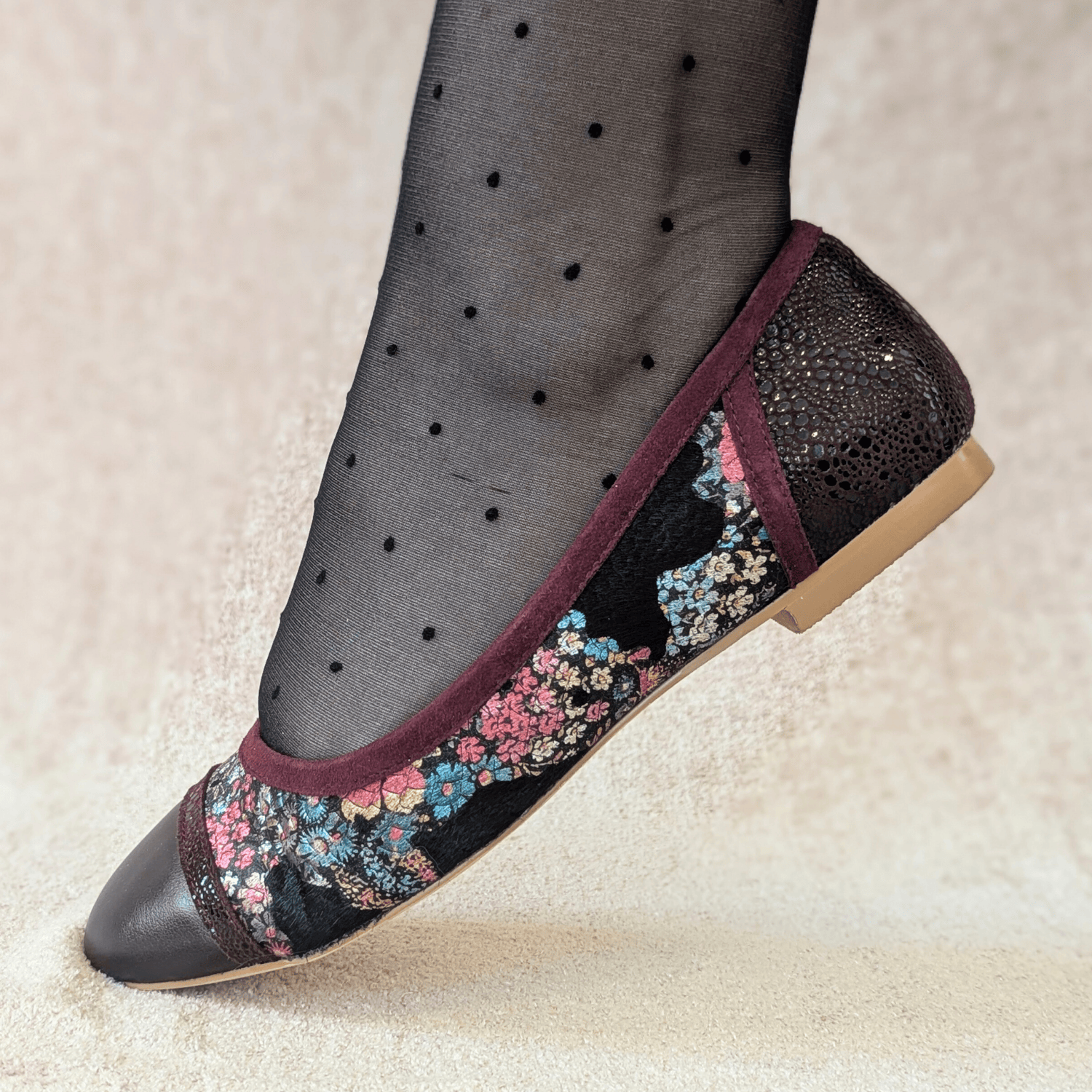 Stunning leathers and a printed floral suede give this ballet flat a rich look for a reasonable price.