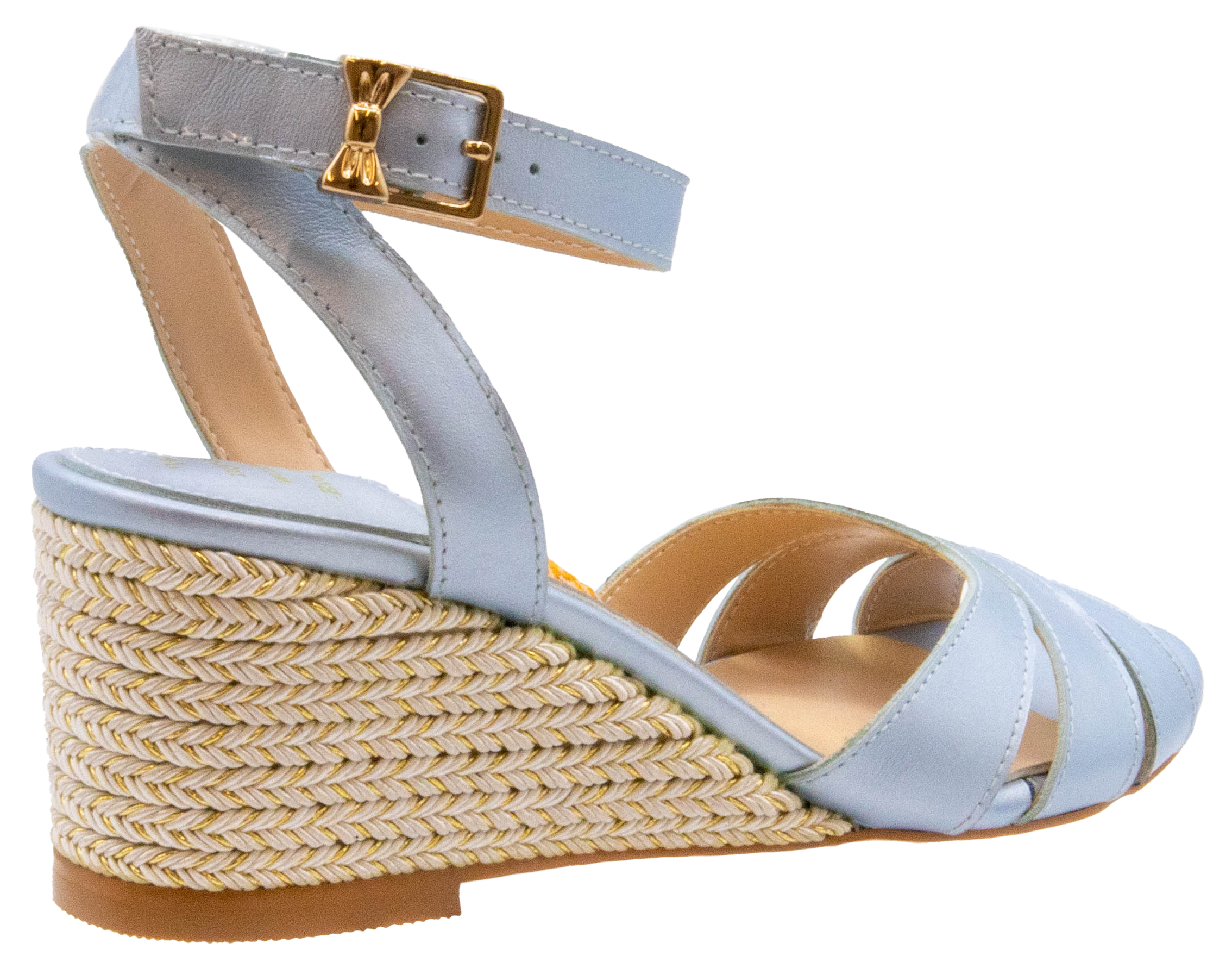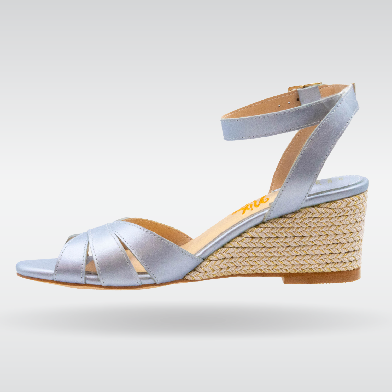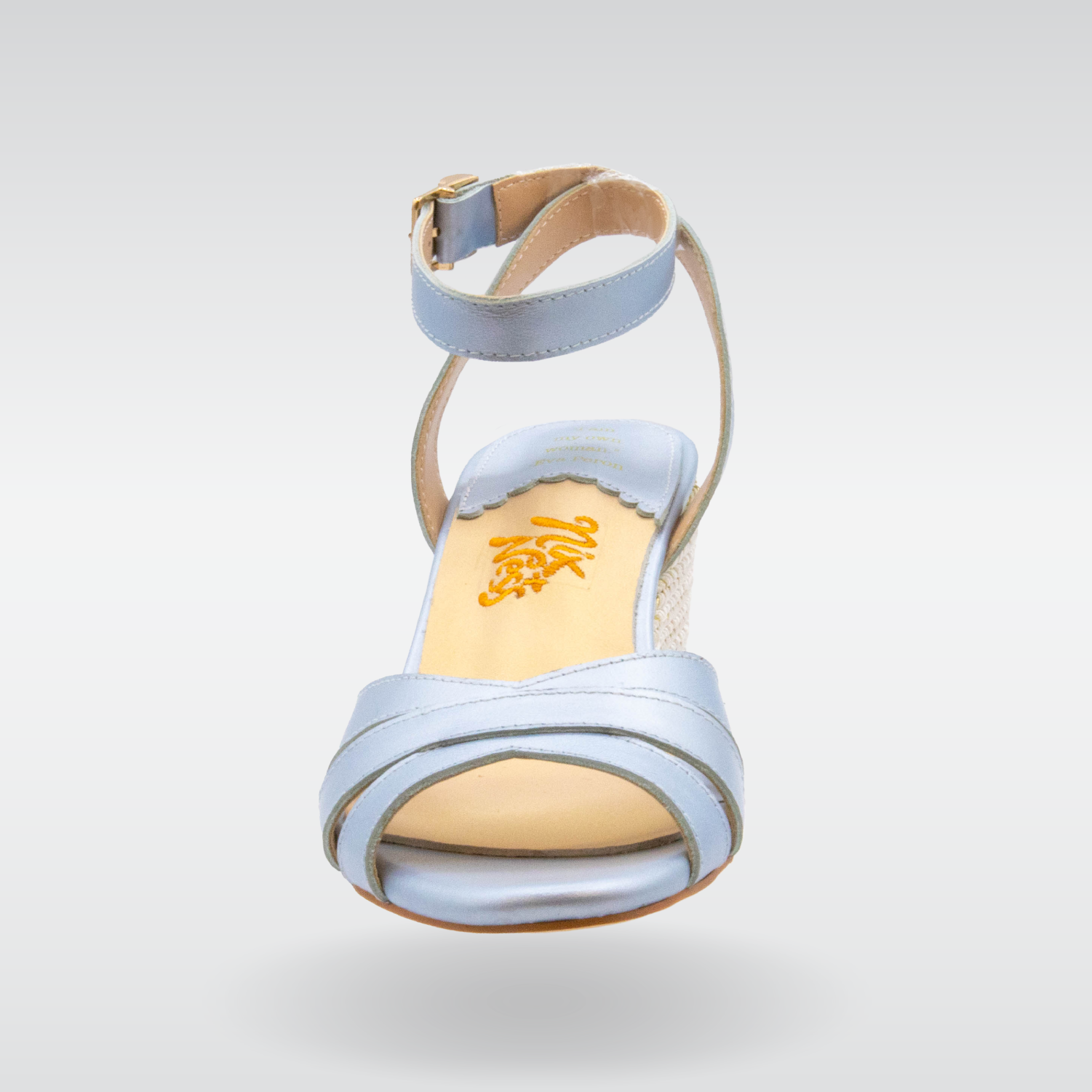 The Eva Perón sandal was fun to design as Eva was a big fan of shoes. The inspiration for the shape of the shoe comes directly from a picture of a shoe Eva actually wore. The blue was chosen as it is the color of the Argentinian flag, and the jute heels are an homage to a traditional Argentinian way of creating shoes.