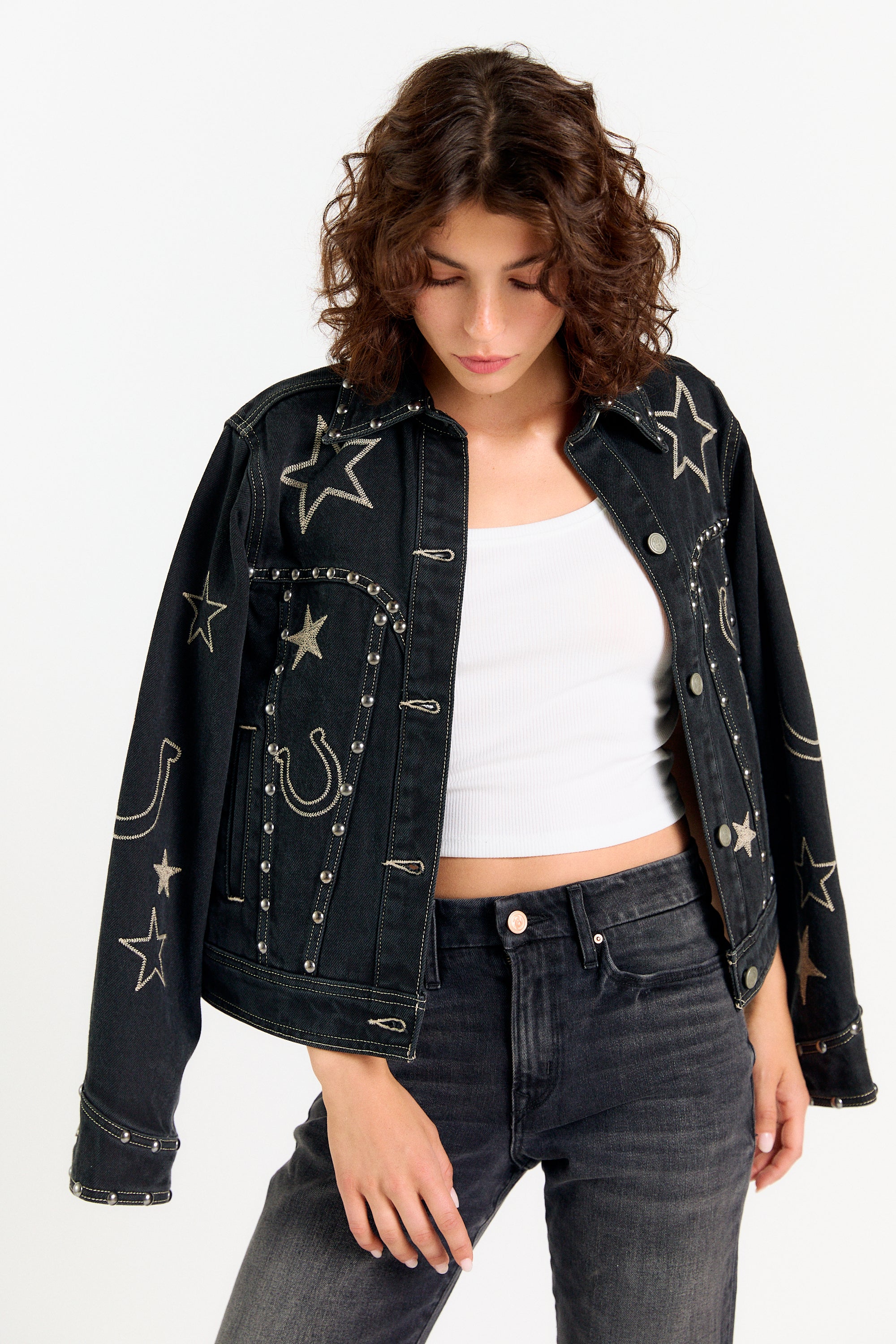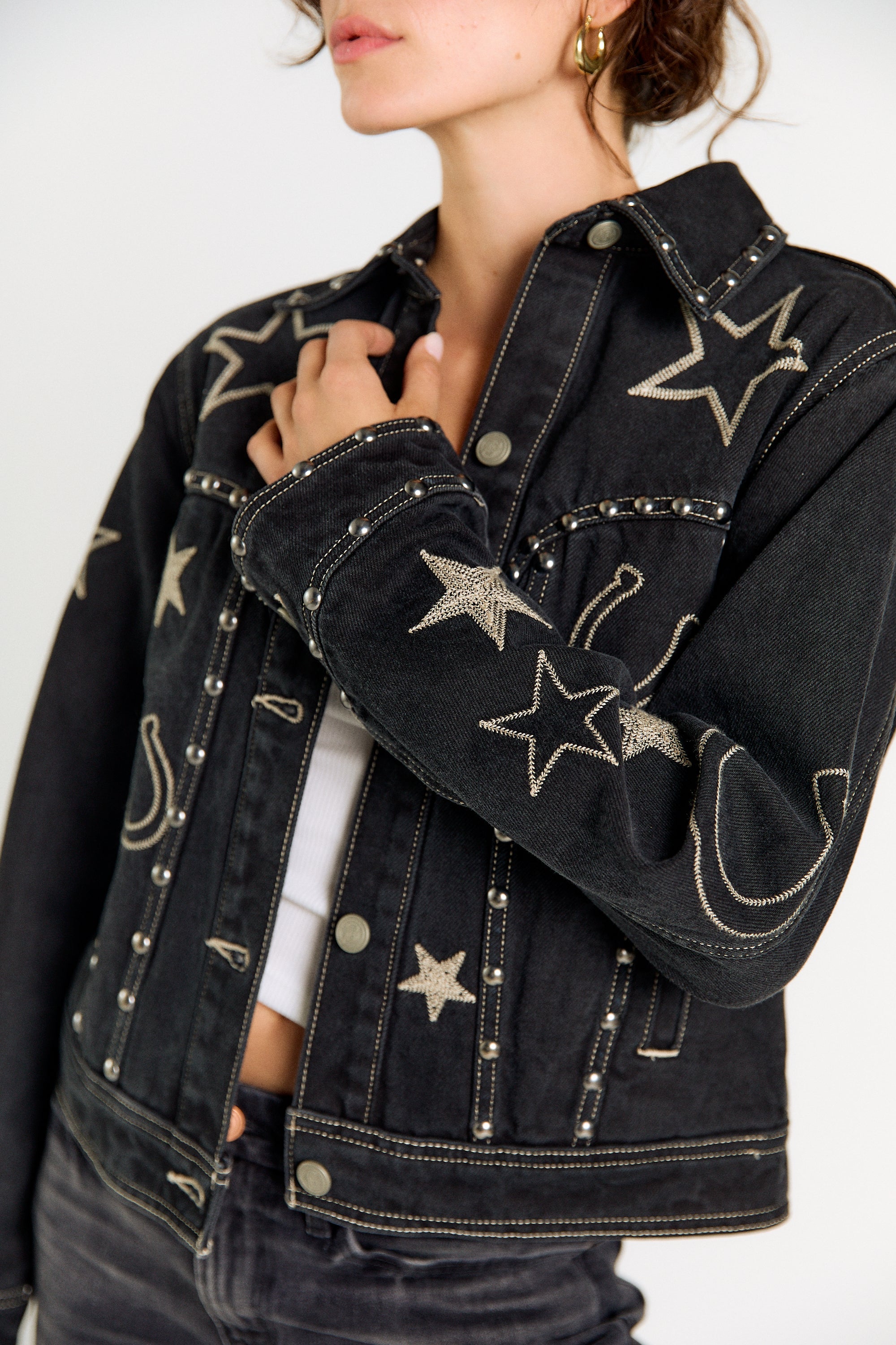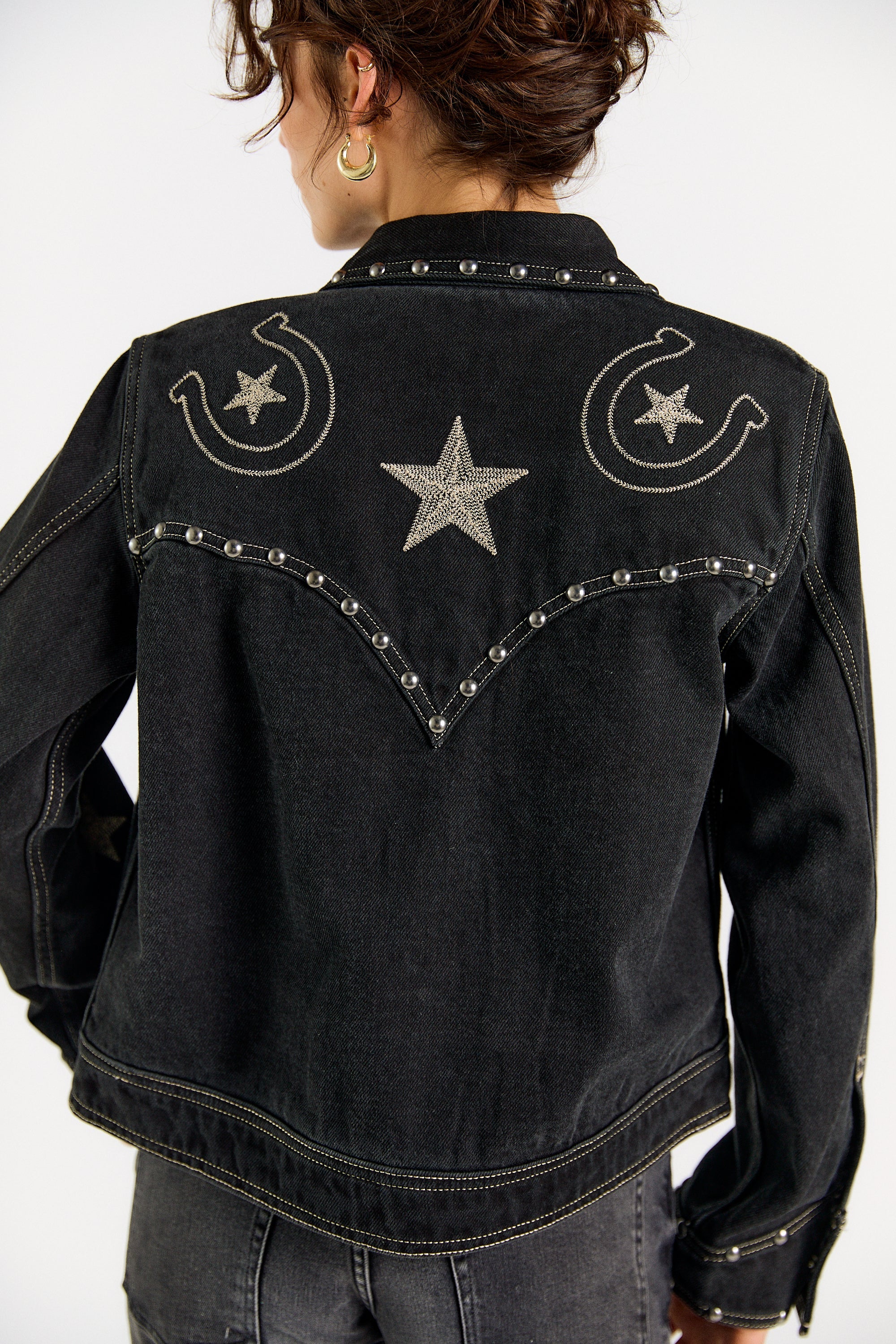 Introducing the Giddy Up Jacket, a standout piece crafted for the modern cowgirl. This black denim trucker jacket is a true showstopper, meticulously embellished with antique silver studs and detailed embroidery of classic Western icons. Whether you're headed to a rodeo, a country music festival, or just looking to elevate your everyday style, this jacket is the perfect statement piece. SHIPPING NOW