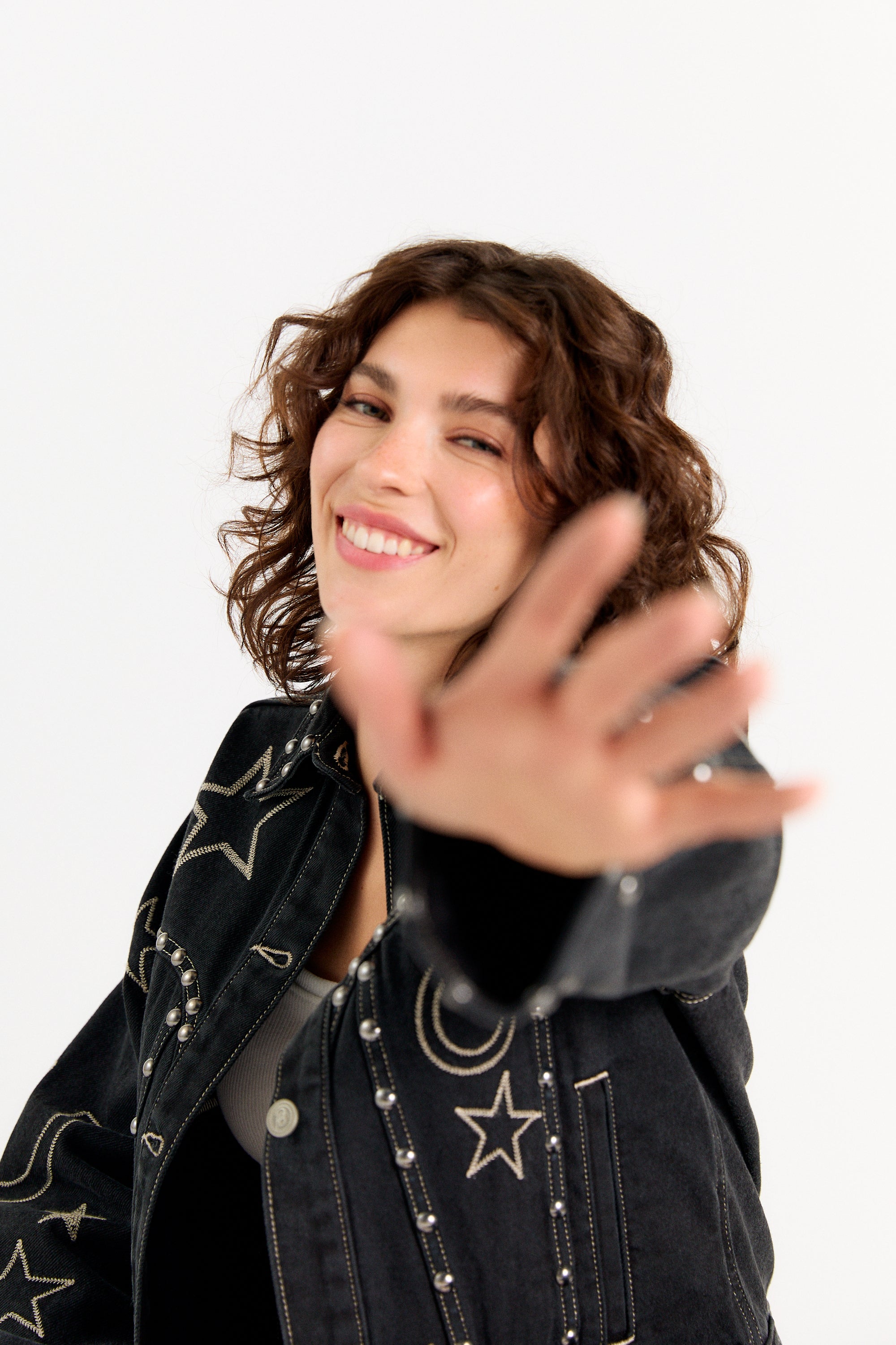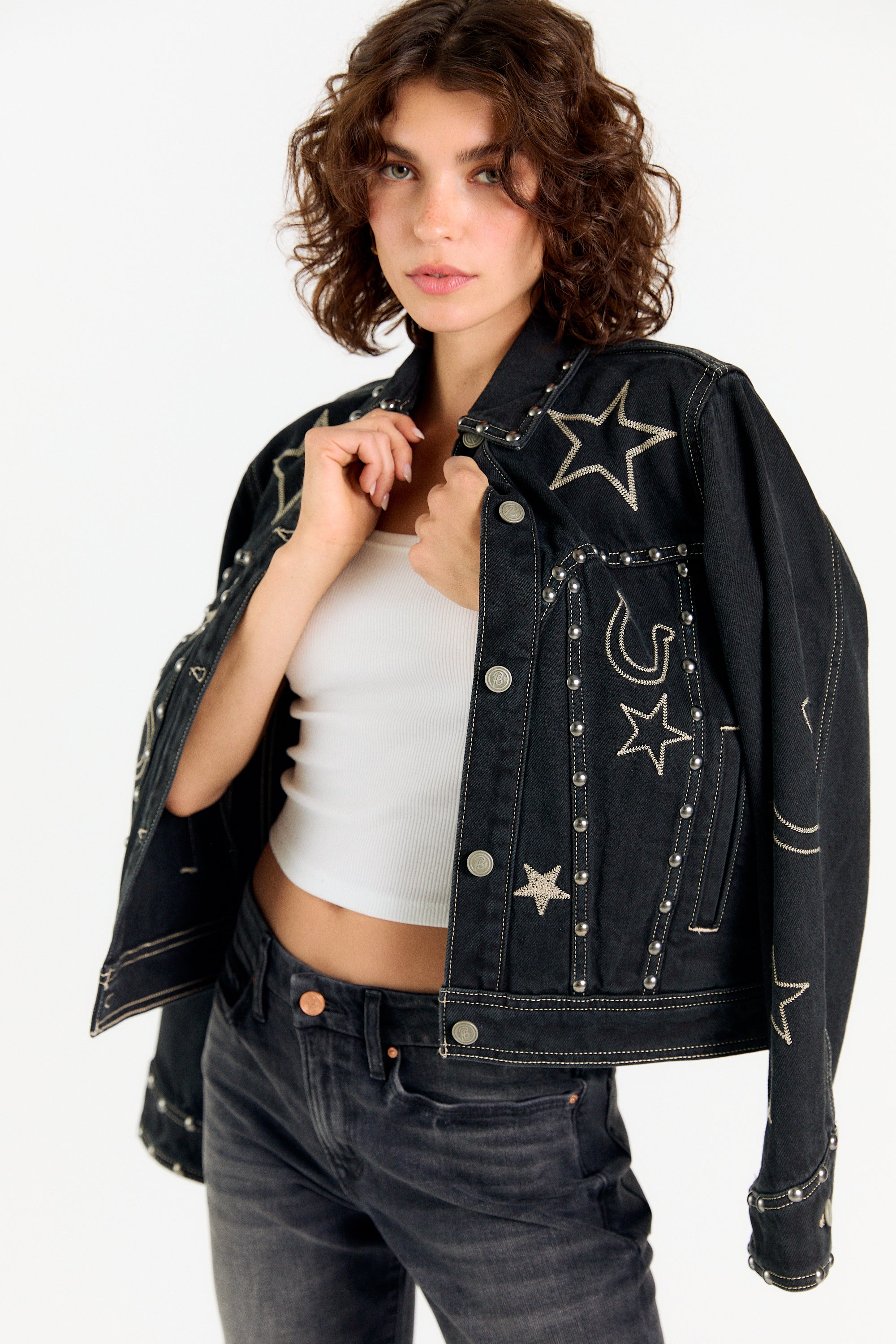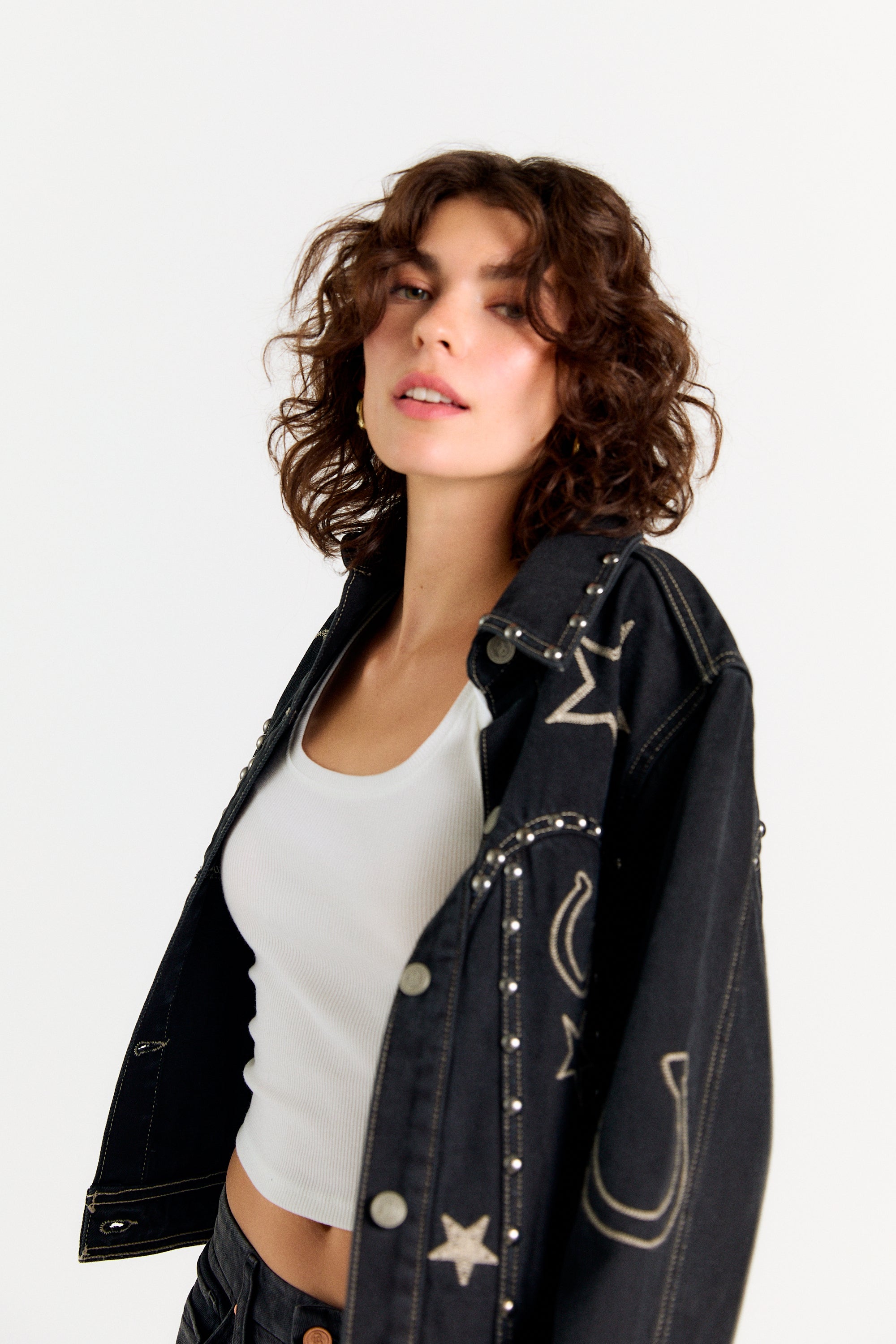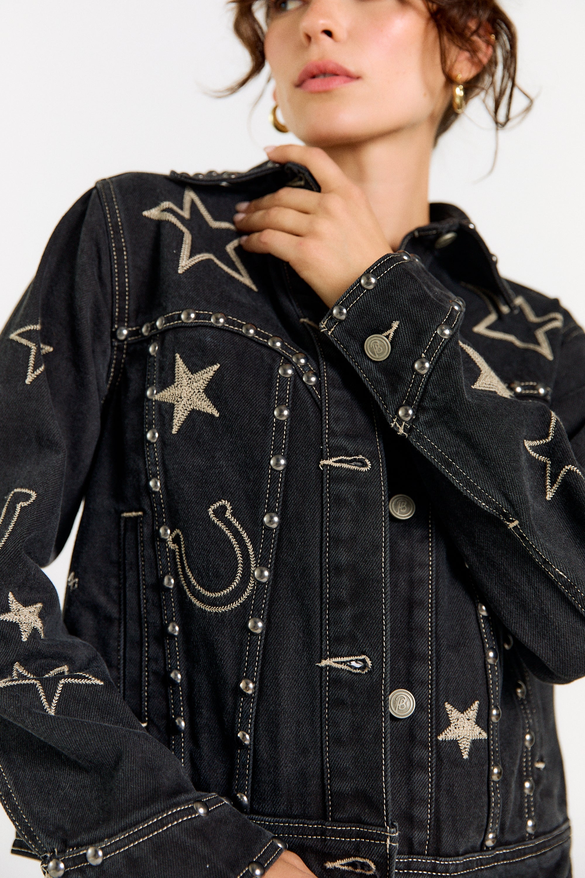 Introducing the Giddy Up Jacket, a standout piece crafted for the modern cowgirl. This black denim trucker jacket is a true showstopper, meticulously embellished with antique silver studs and detailed embroidery of classic Western icons. Whether you're headed to a rodeo, a country music festival, or just looking to elevate your everyday style, this jacket is the perfect statement piece. SHIPPING NOW