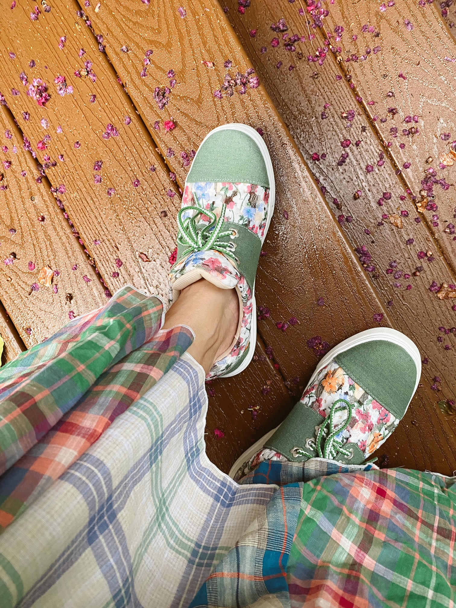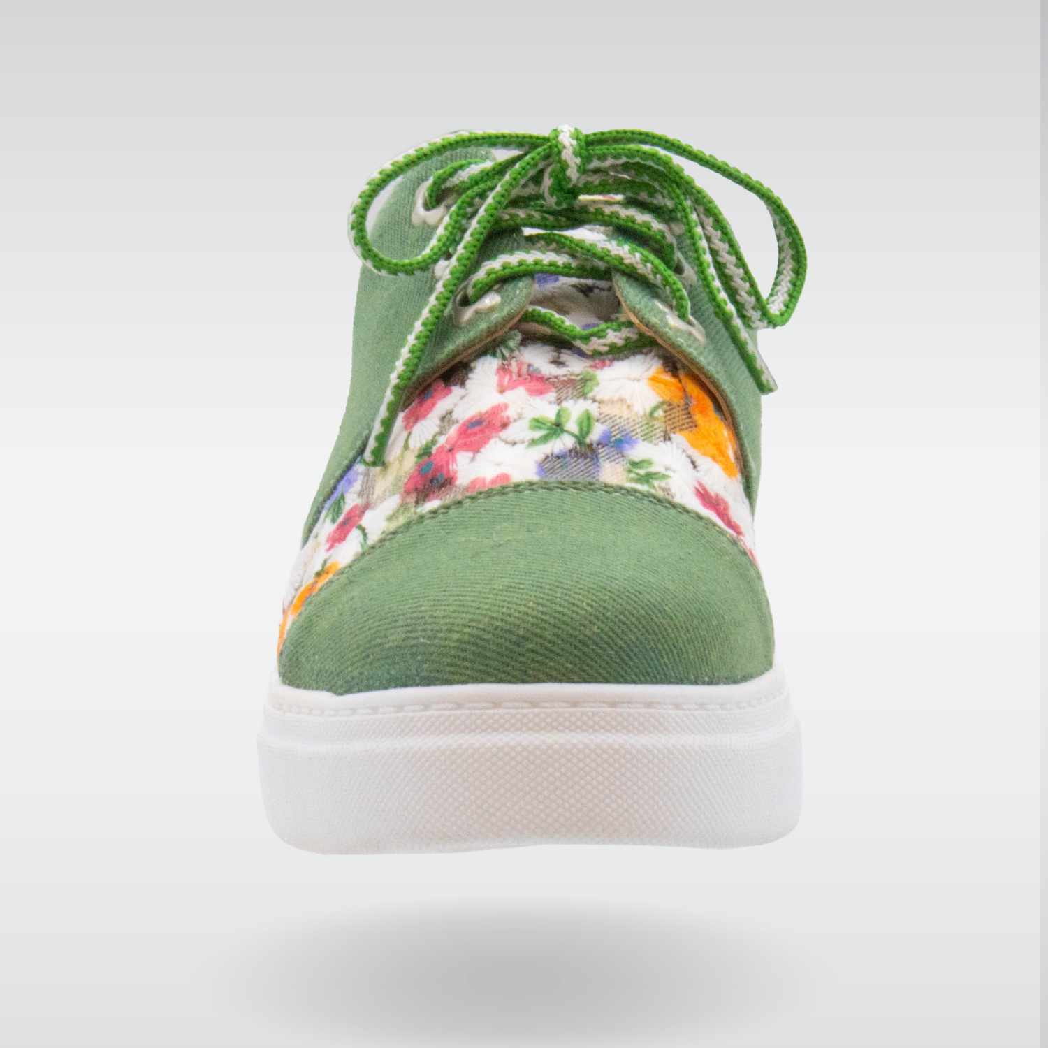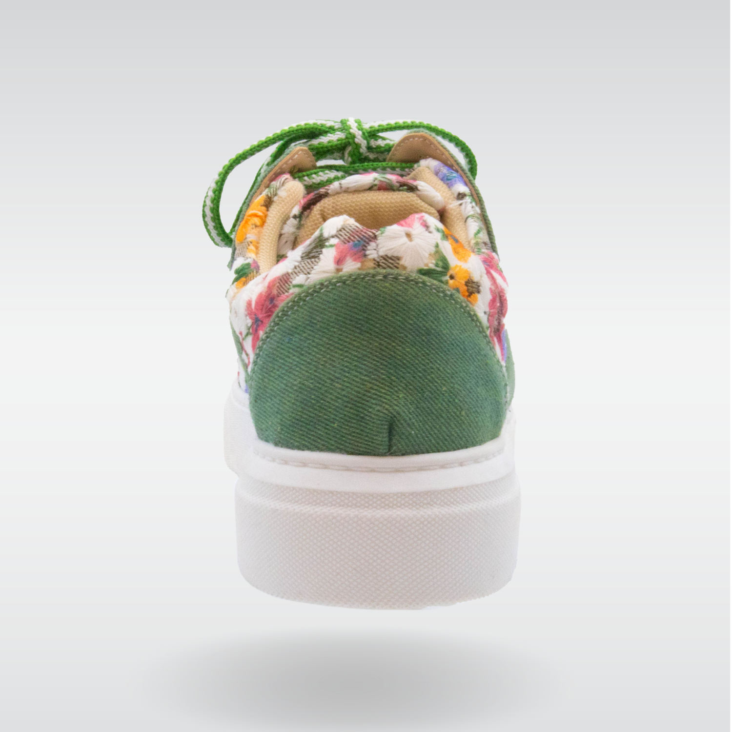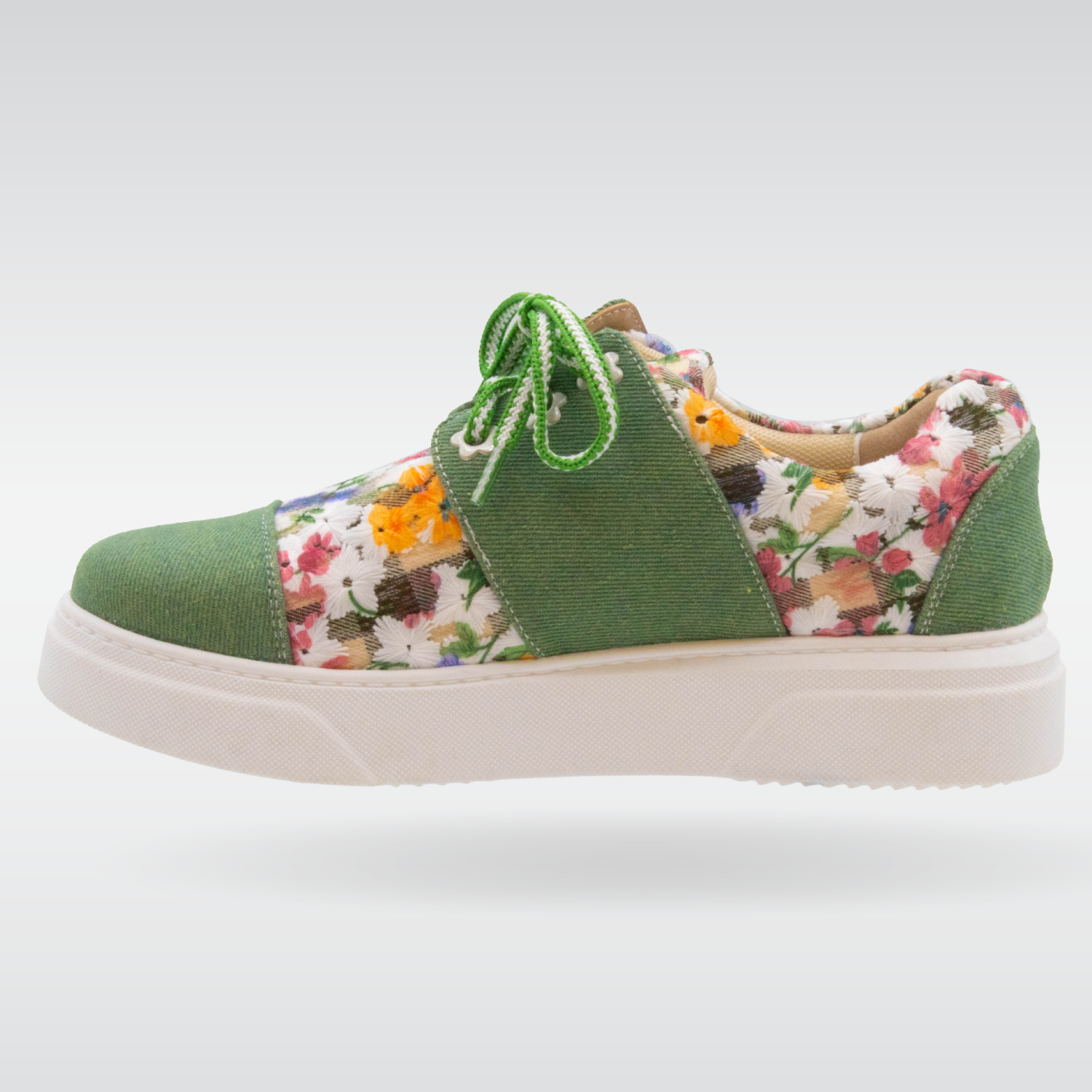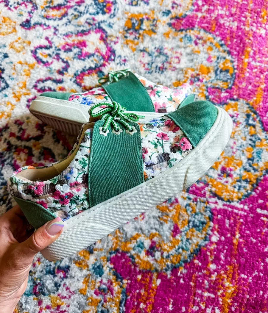 This sneaker is extra comfy with added padding. The floral fabric happily brings you into spring and summer, and the green panels have textured depth. The floral grommets are sure to bring you a smile every time you lace up your shoes.