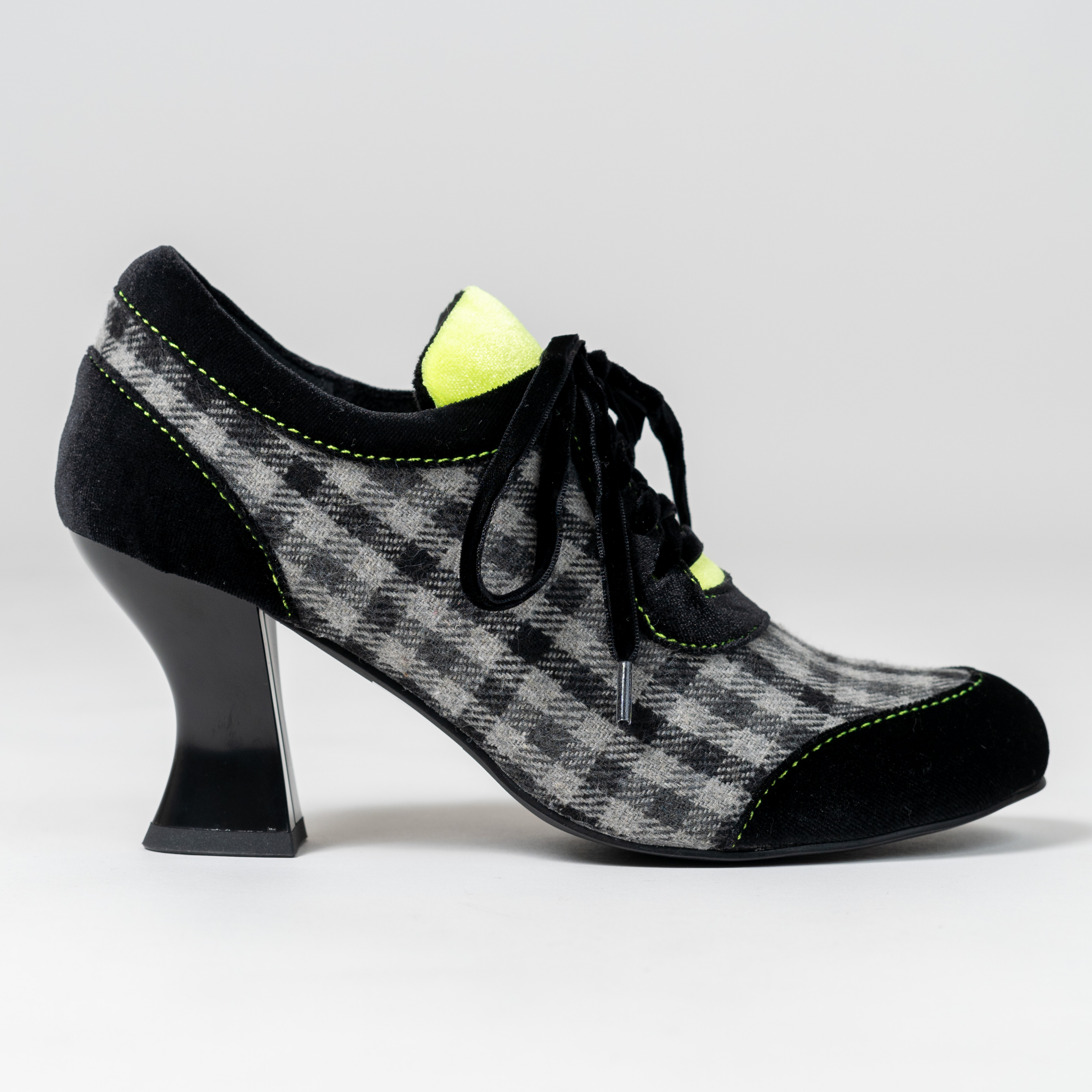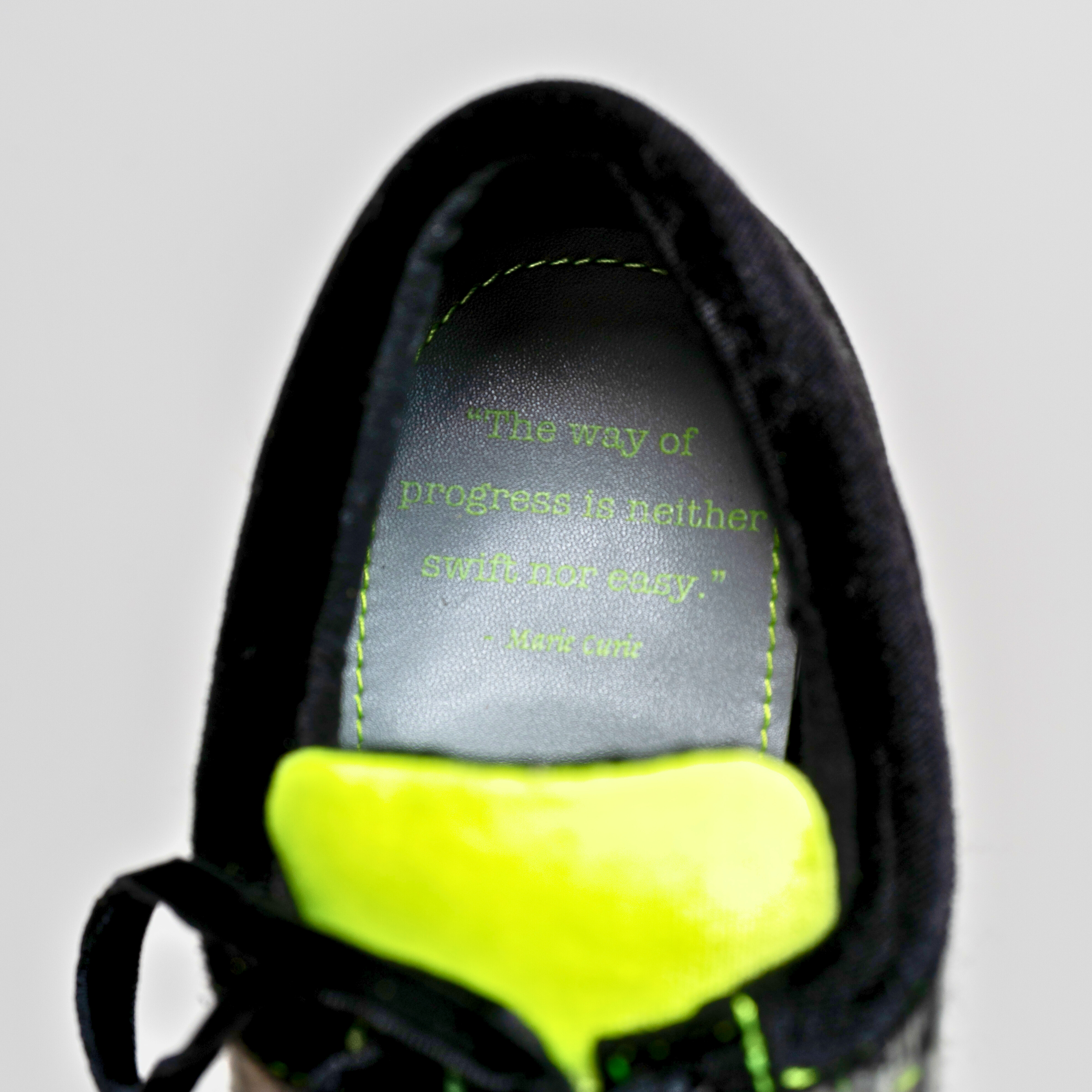 The Marie Curie heel was designed to keep you walking comfortably towards progress, and remind you of what can be accomplished by a motivated woman. The neon accents are the color of one of Ms. Curie’s most important discoveries - radium, and the triangular shape of the shoelace area is reminiscent of the symbol for radioactivity. Wear these heels to work and remind yourself that sometimes progress takes time, but we can always take steps forward.