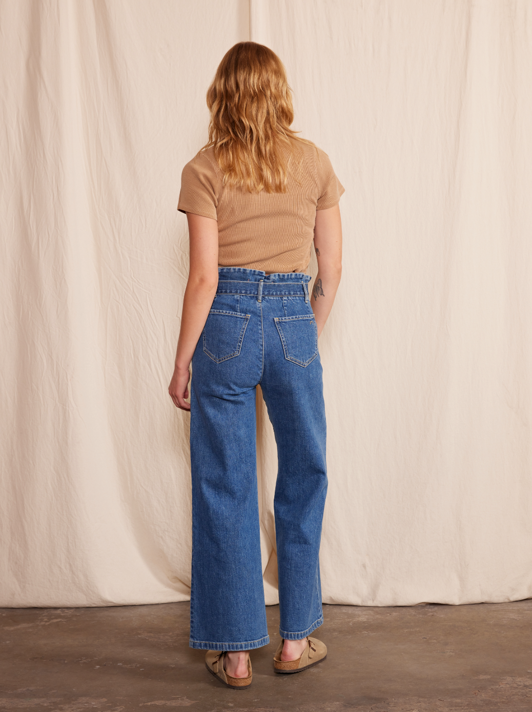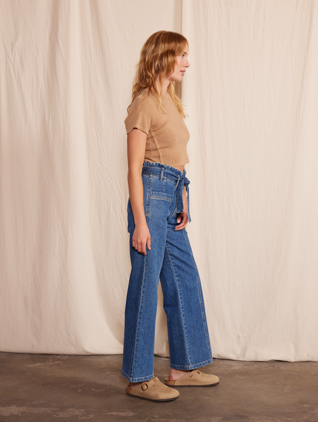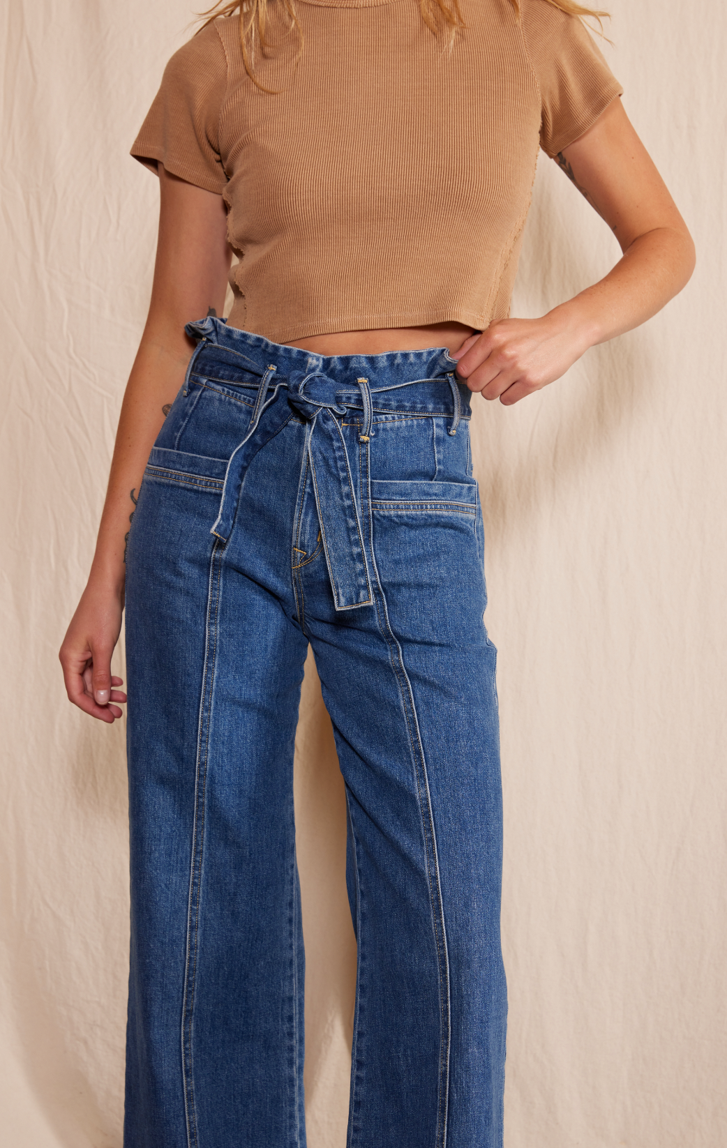 Seam-ingly perfect. The Penny Paperbag is high-waisted, cinched with pleated gathers, and belted—making it flattering on all body types. With prominent front seams and angled welt front pockets, these jeans perfect any outfit.