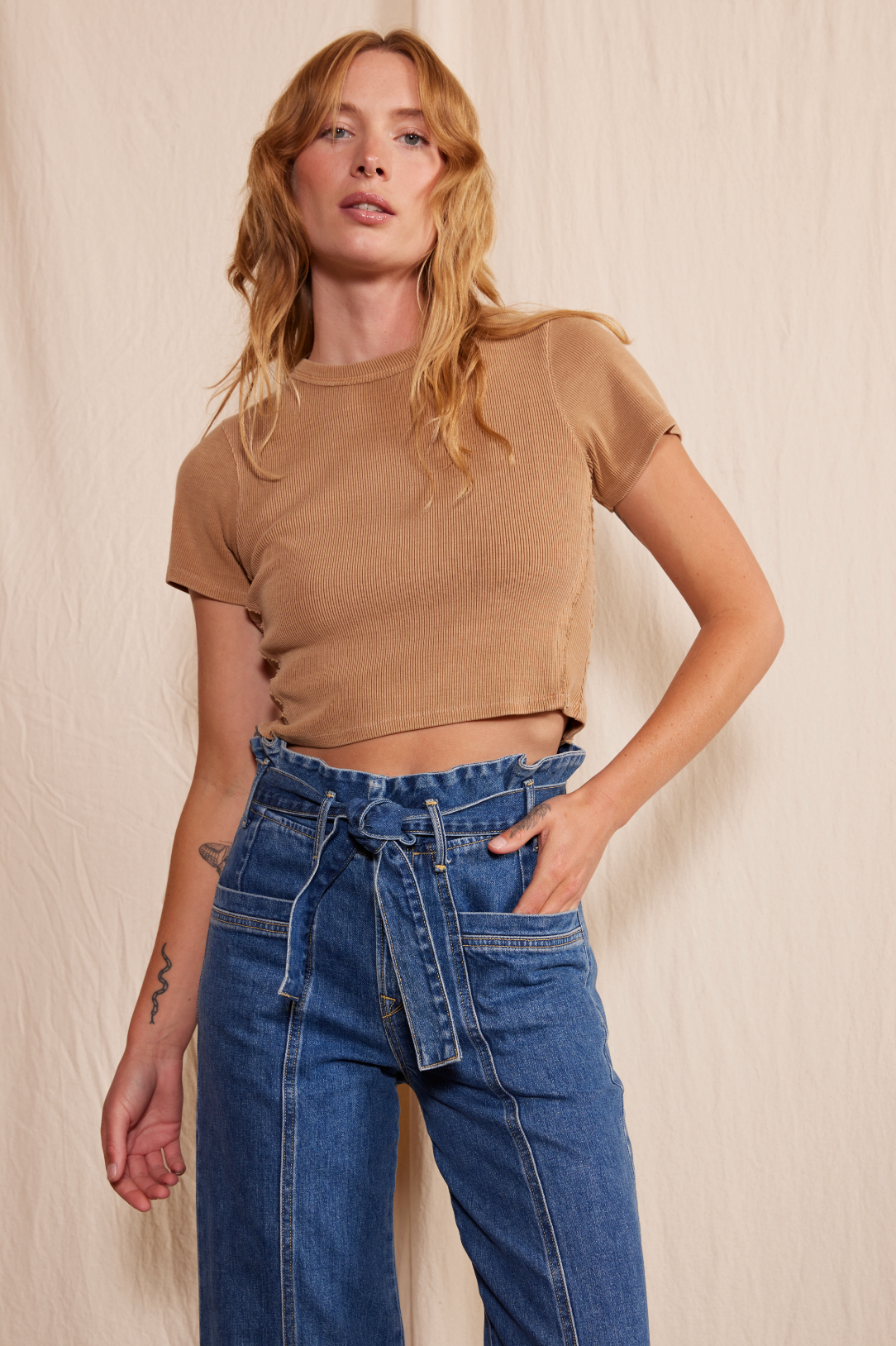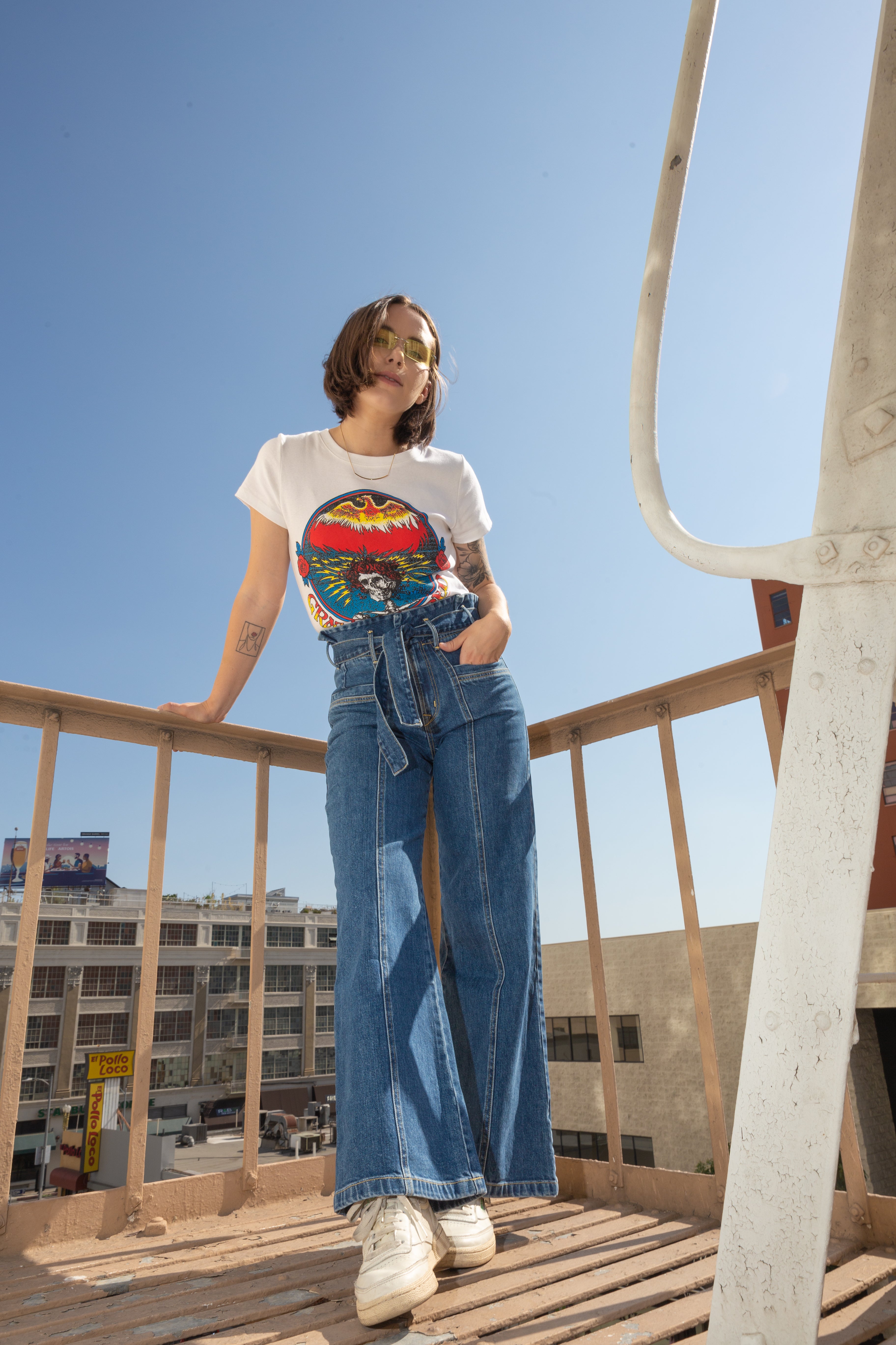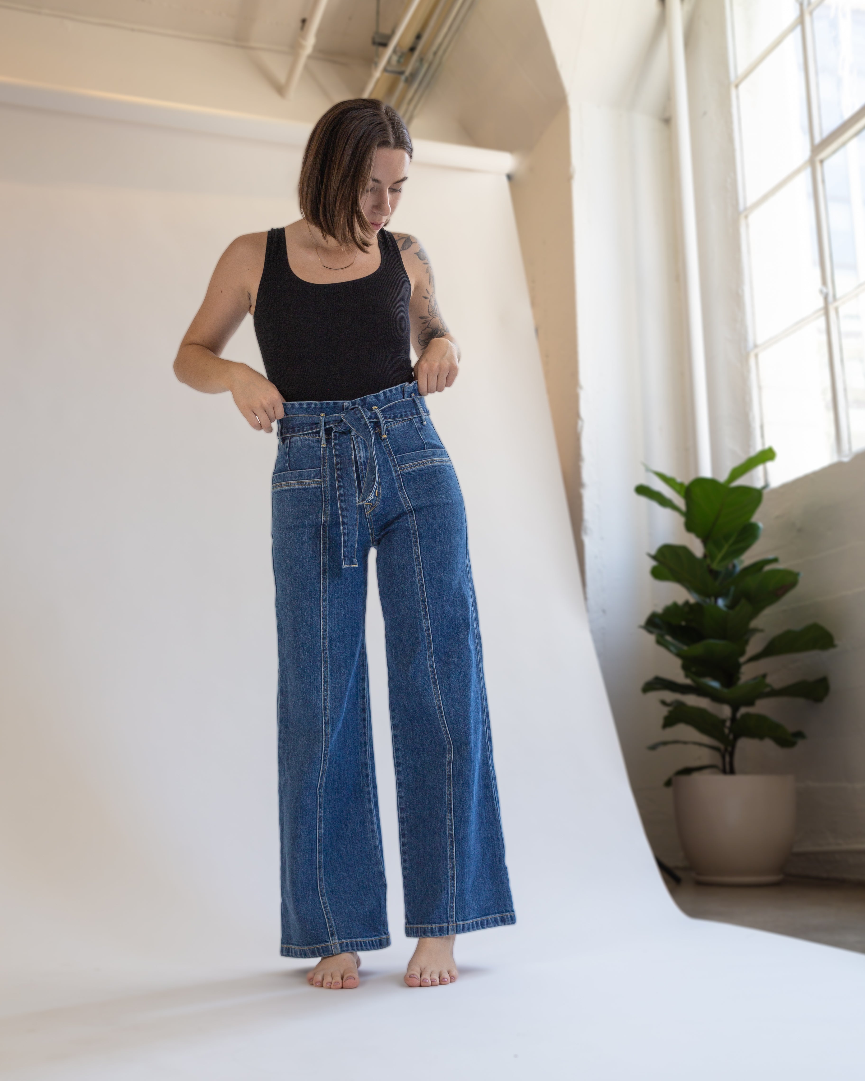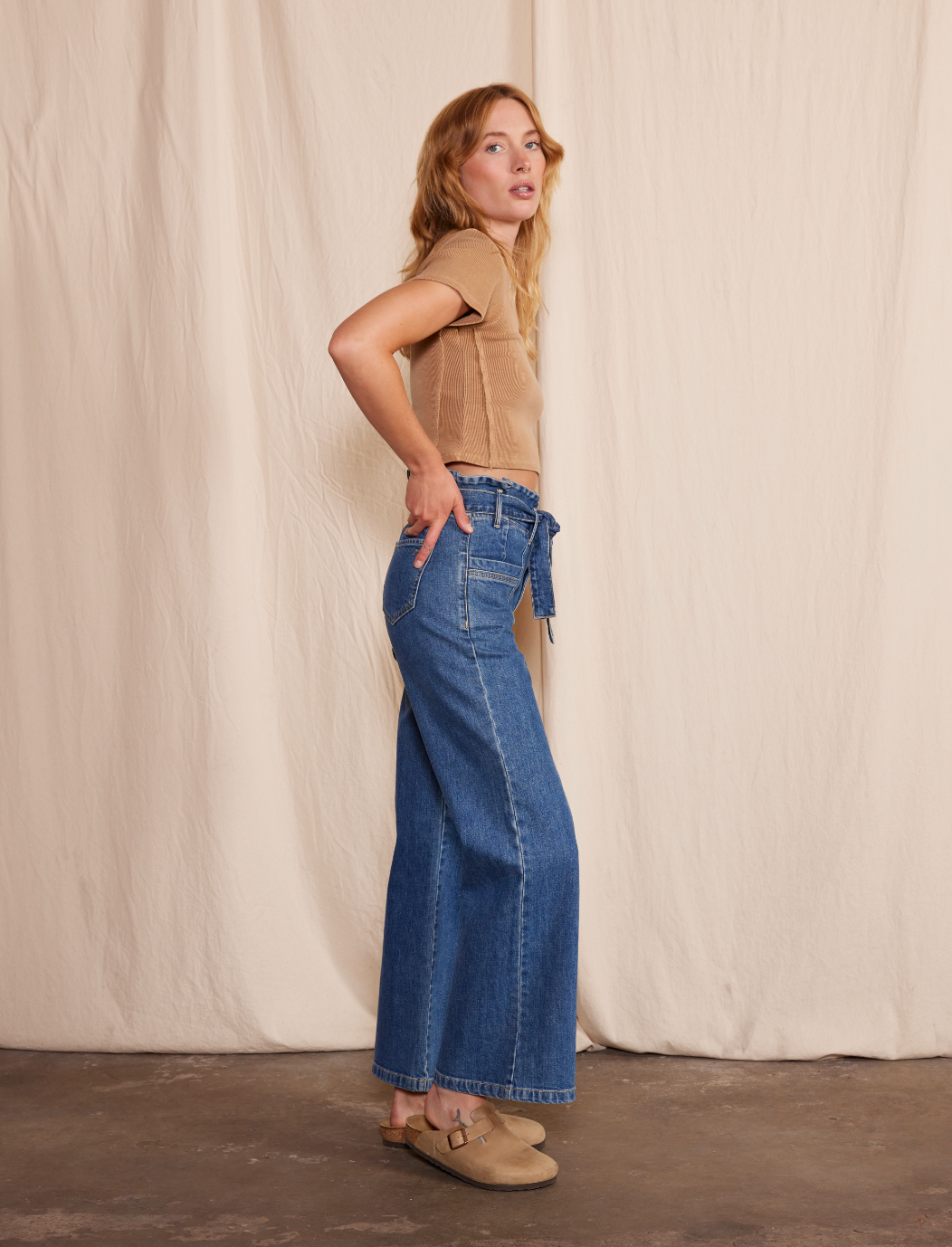 Seam-ingly perfect. The Penny Paperbag is high-waisted, cinched with pleated gathers, and belted—making it flattering on all body types. With prominent front seams and angled welt front pockets, these jeans perfect any outfit.