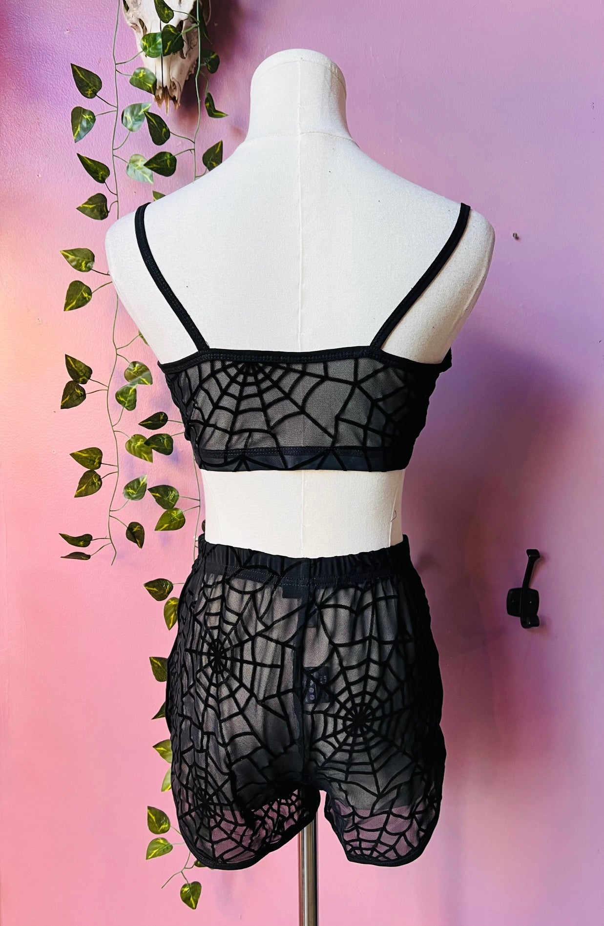 The Sinister Set - WEBS - Sheer Velvet Flocked Spider Web Bra & Shorts Set - READY To SHIP