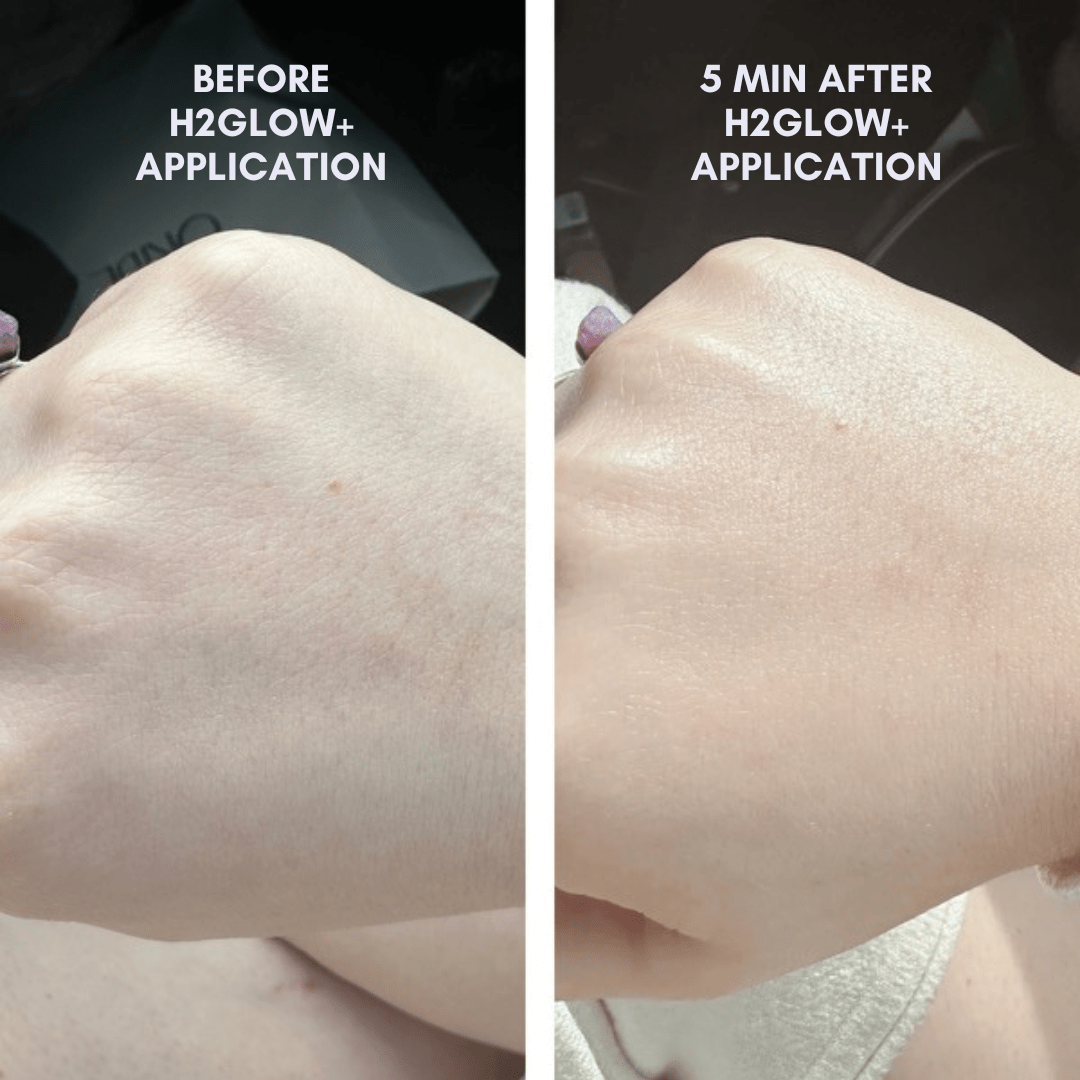 Apply two pumps of H2Glow+. Glycerin, sodium PCA, and vitamin b5 work synergistically to draw moisture deep into your skin without irritation, minimizing transepidermal water loss and skin barrier damage.