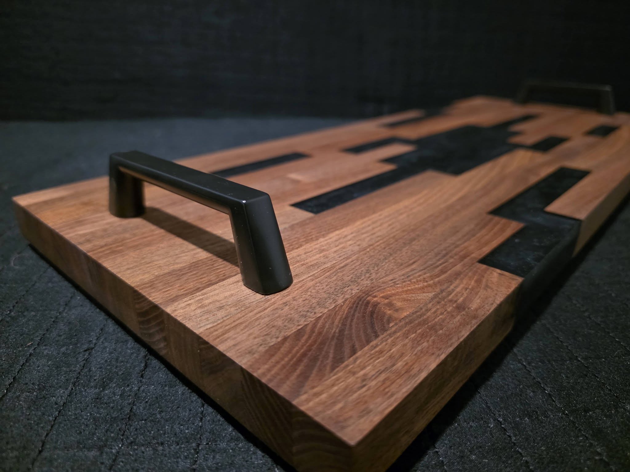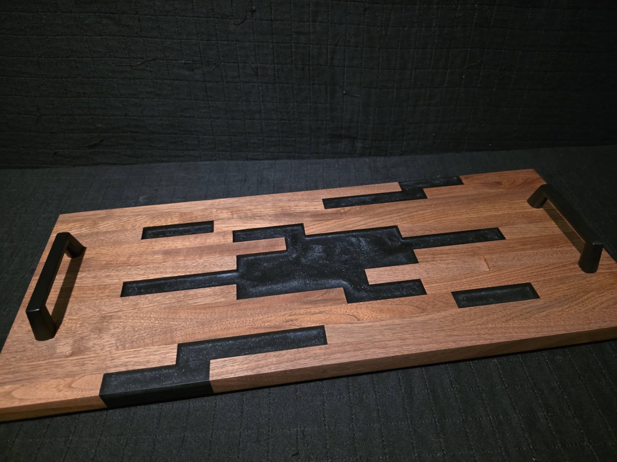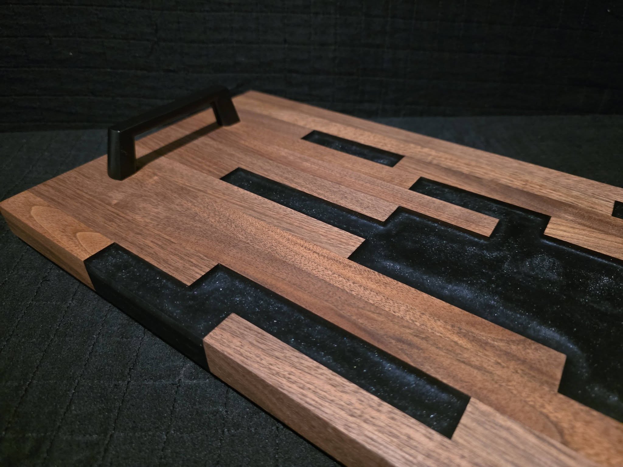 Handmade serving tray / charcuterie board. Dark walnut with black sparkling epoxy. 2 modern black handles. Rubber feet to prevent slipping on counters. Geometrical design - very unique! One of a kind piece of art, makes a beautiful centerpiece on a kitchen table