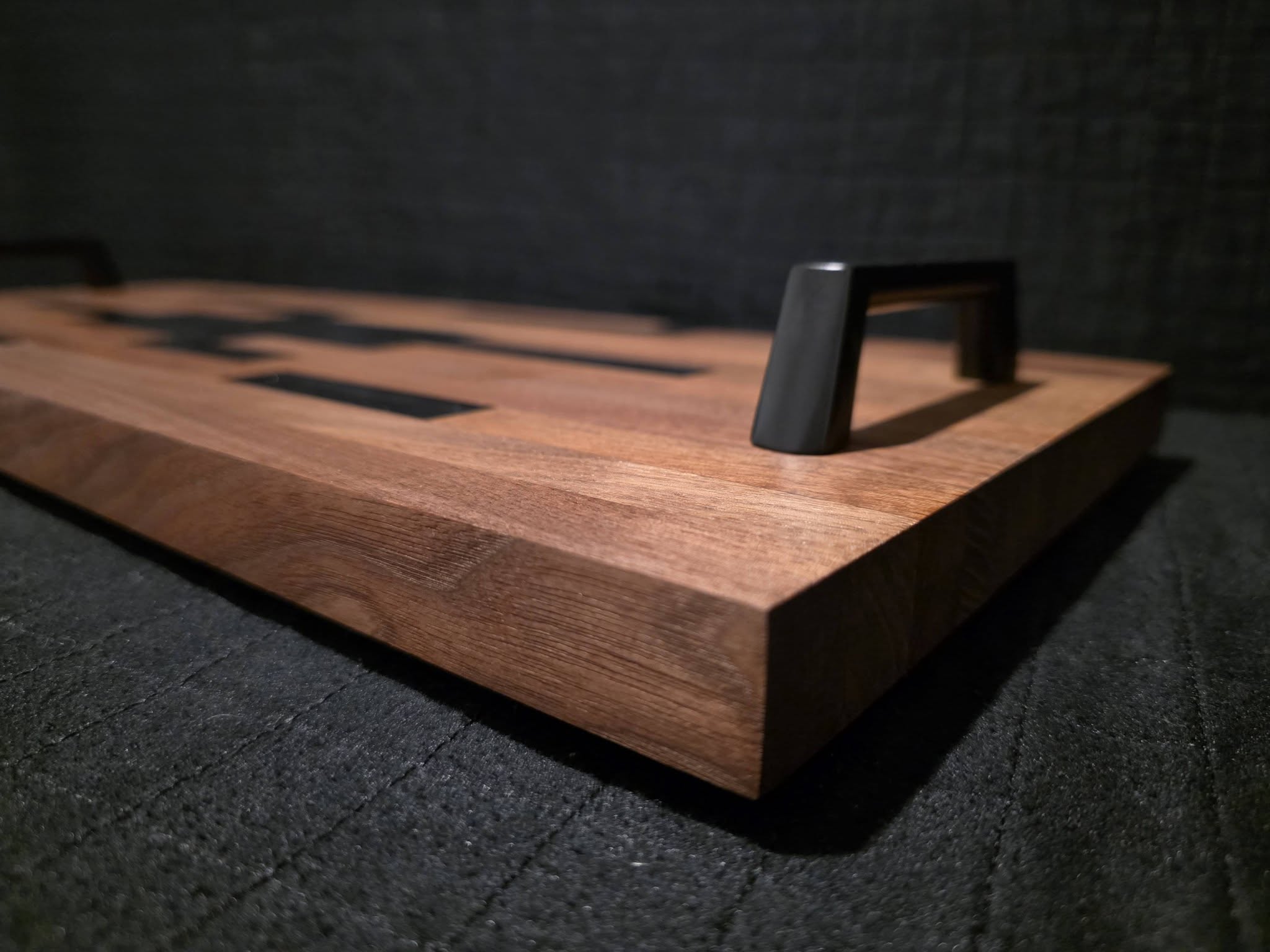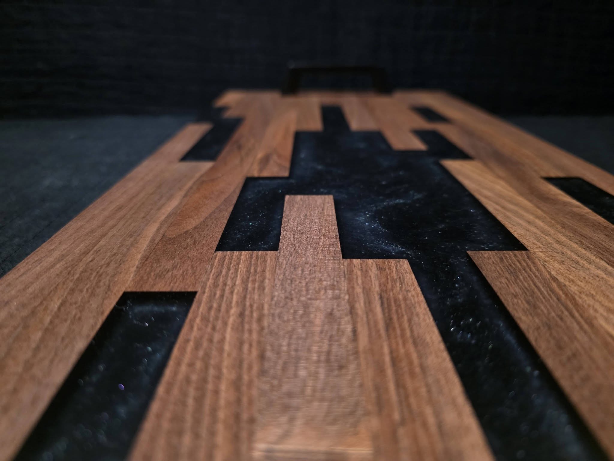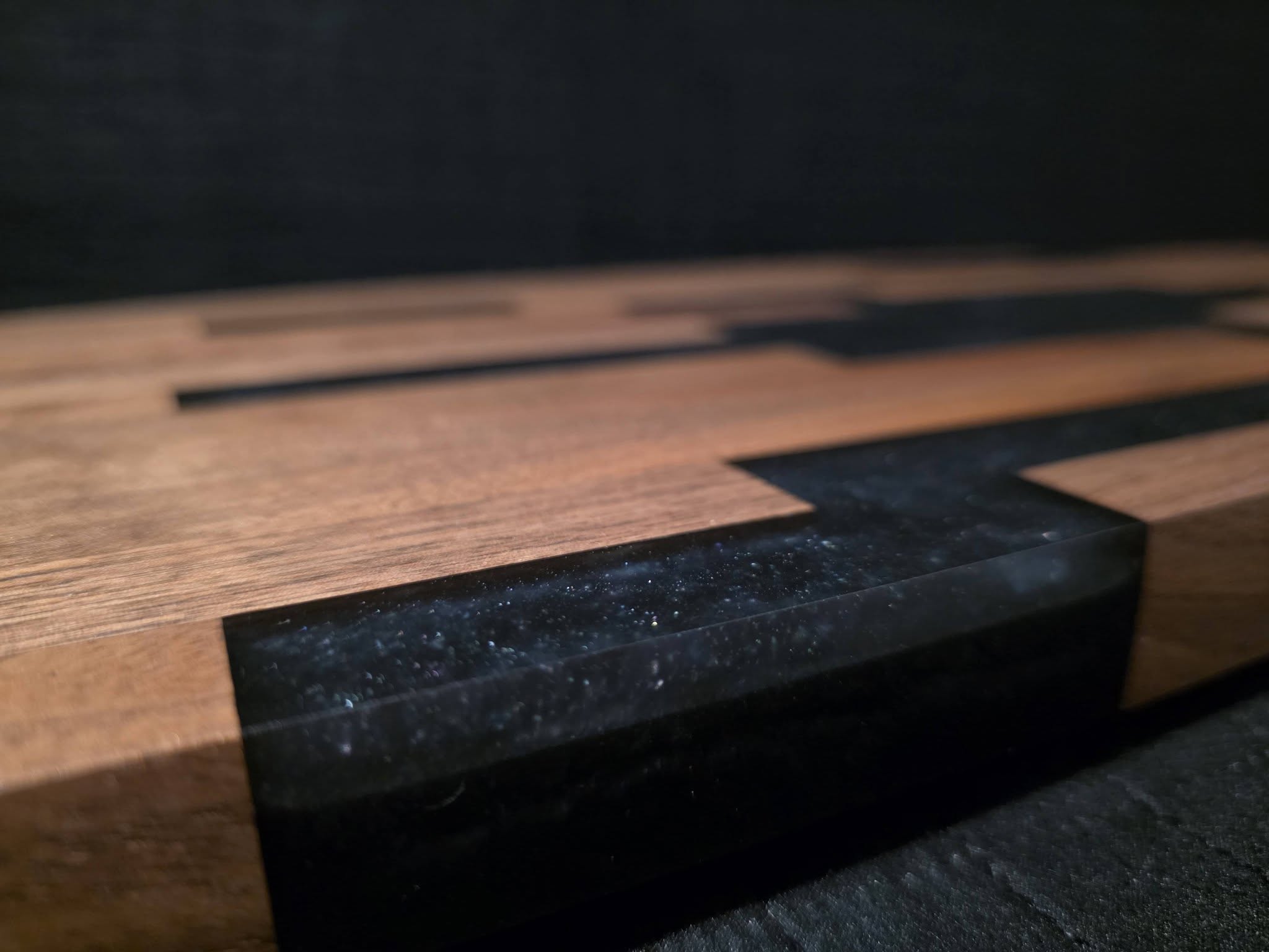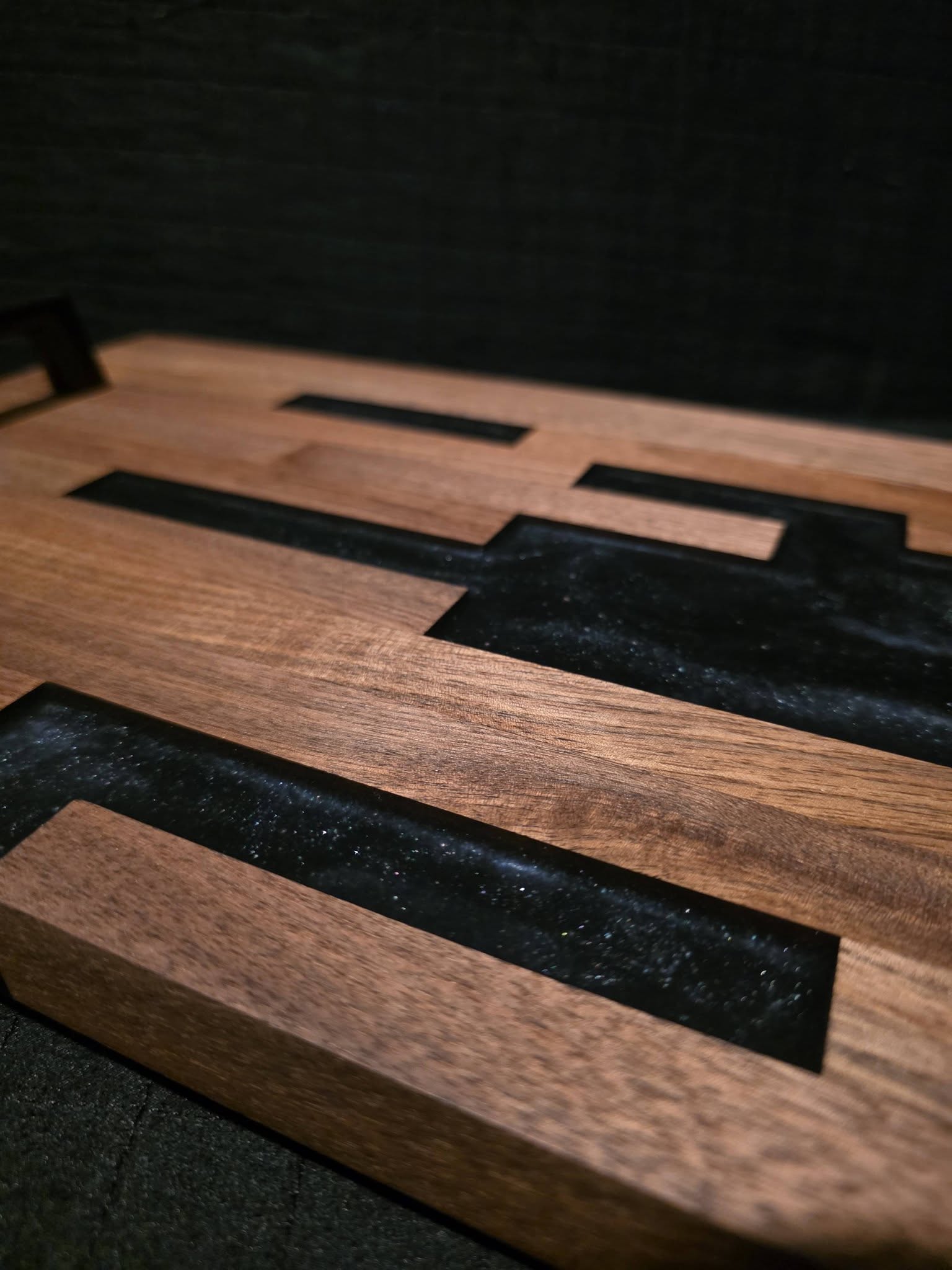 Woods: Dark walnut, black sparkly epoxy, & black handles; finished with Rubio Monocoat