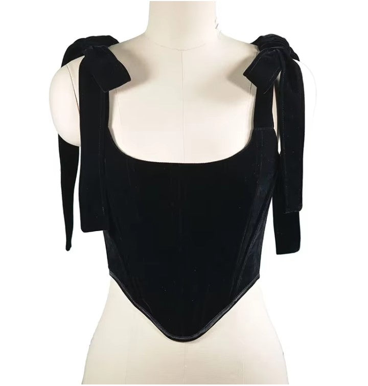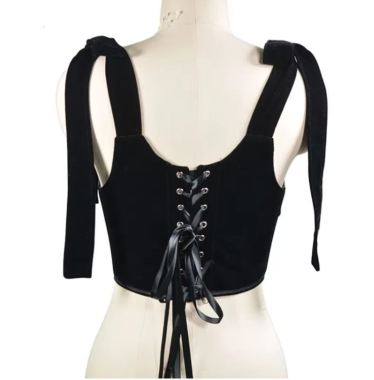 This corset has a super flattering vintage cut and is made from lush deep black velvet. It ties at the shoulders and has a lace up back.
