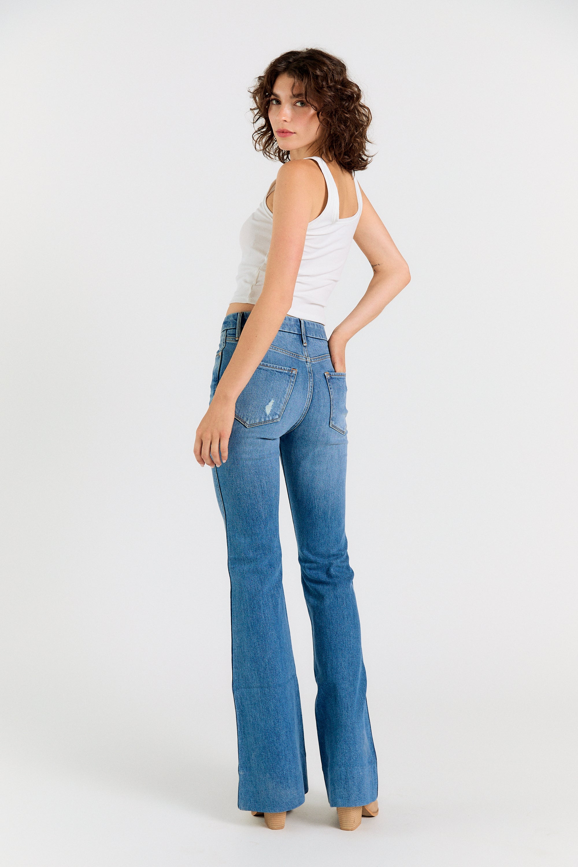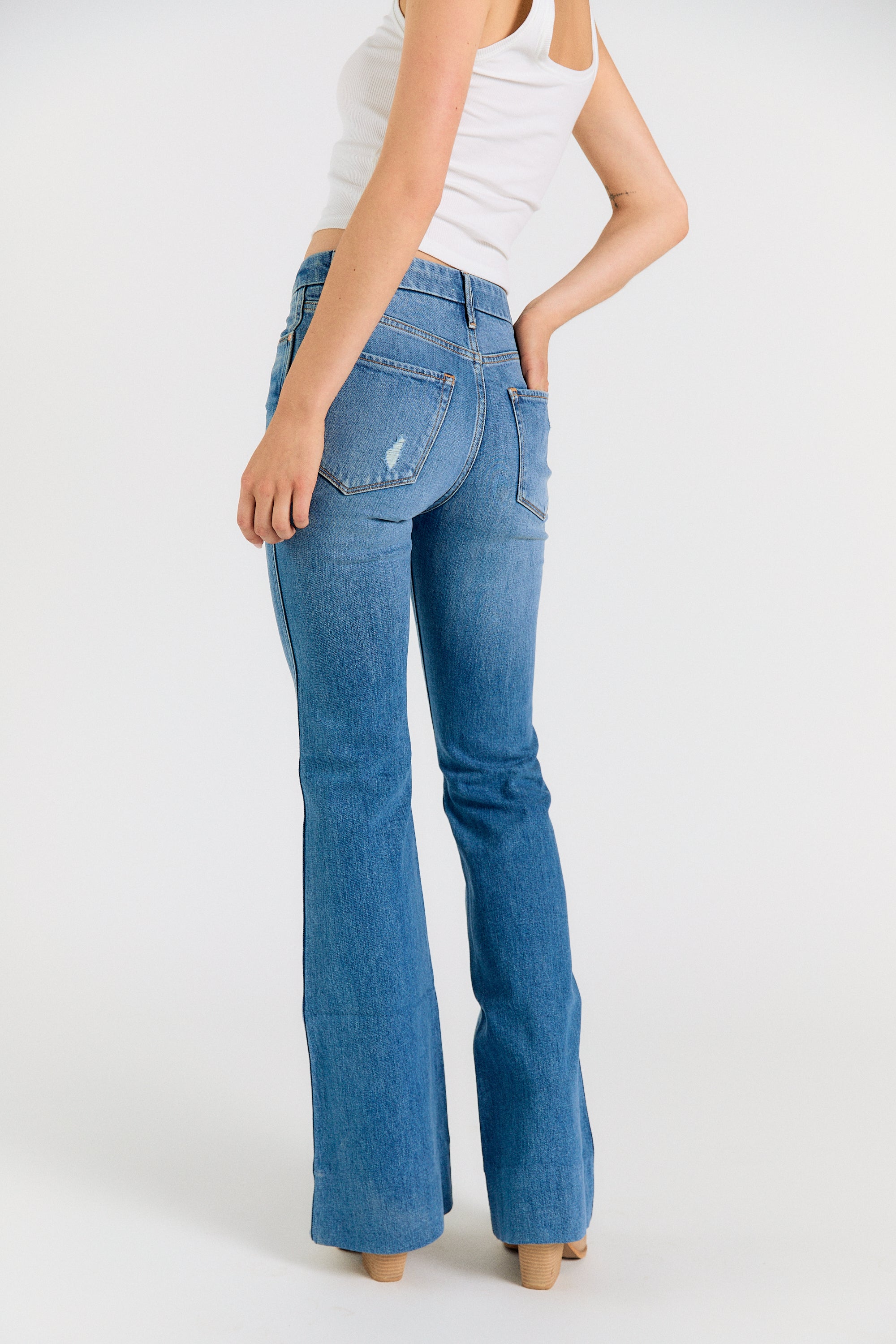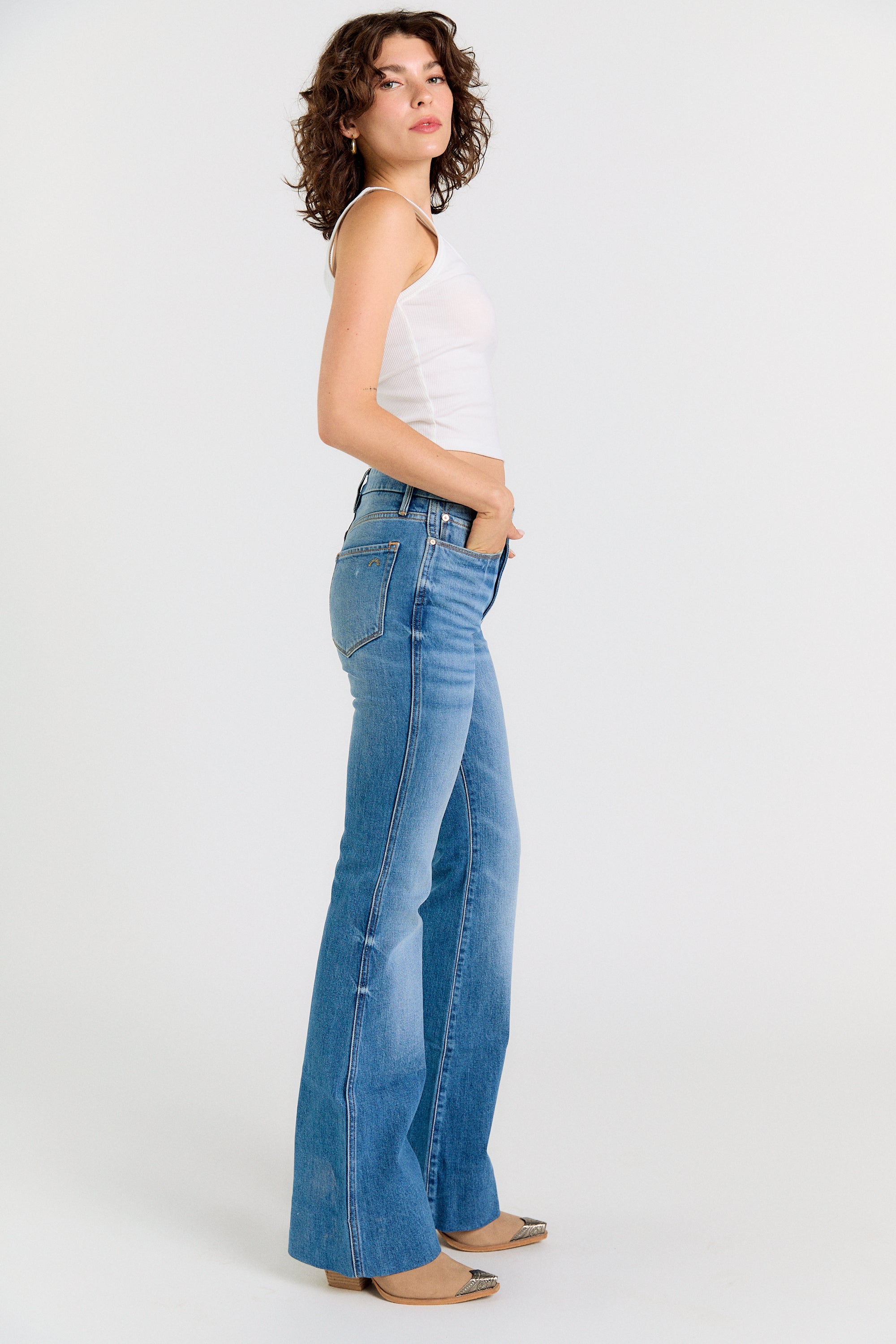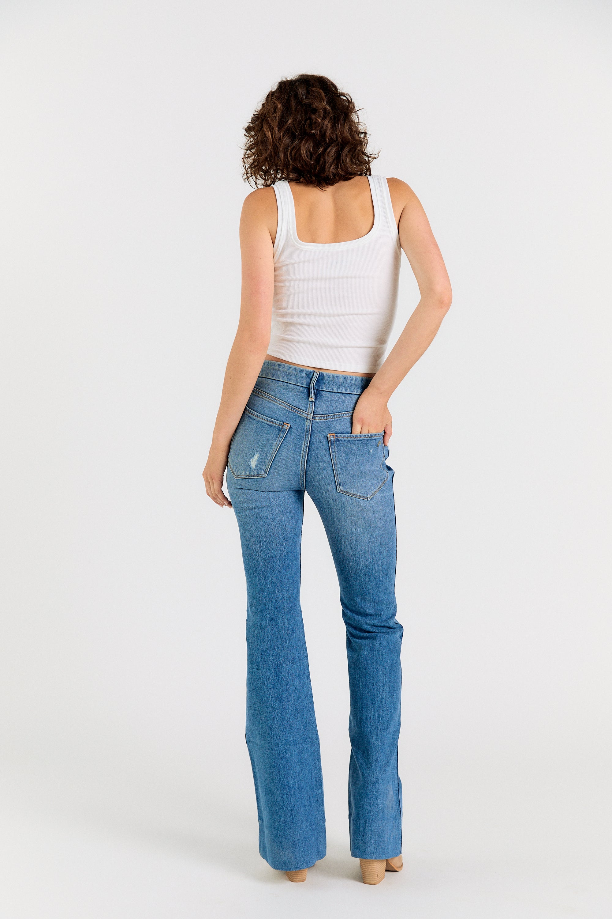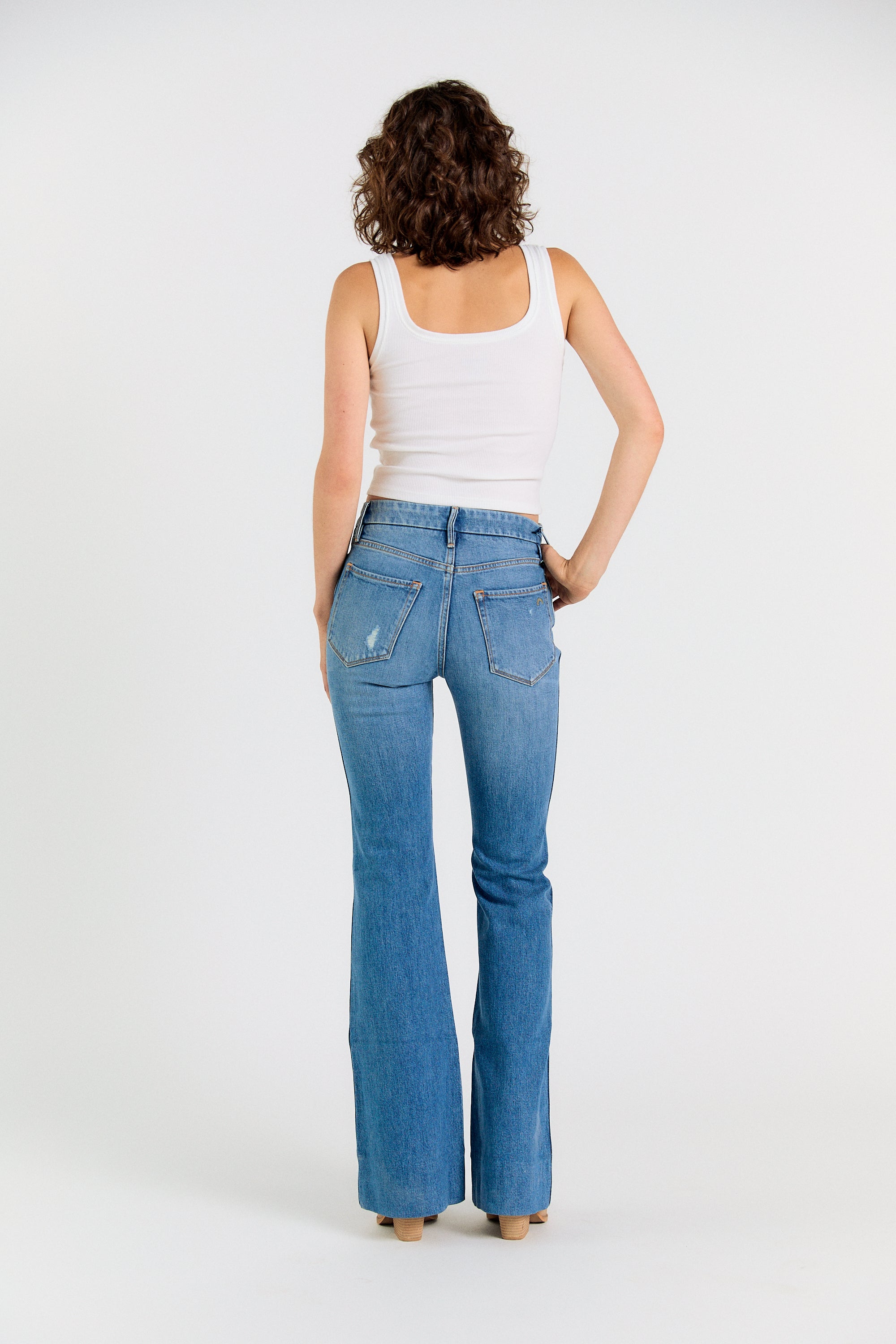 The Wanderer Flare is our spin on the iconic 70's flare modernized for a new decade. This style features a high-rise contour waistband, timeless scoop hand pockets and a belled leg opening with a blind hem stitch detail. The fit is form fitting and snug through the waist and hips then bells out right above the knee. We embroidered our iconic sun logo on the wearer’s back pocket. All of our jeans offer stretch so unlike the 70's classics you can actually breathe in these. Why we love this flare - Its made up of Organic Cotton farmed without any pesticides or fertilizer, and our Mabel Eco wash is created without Water.