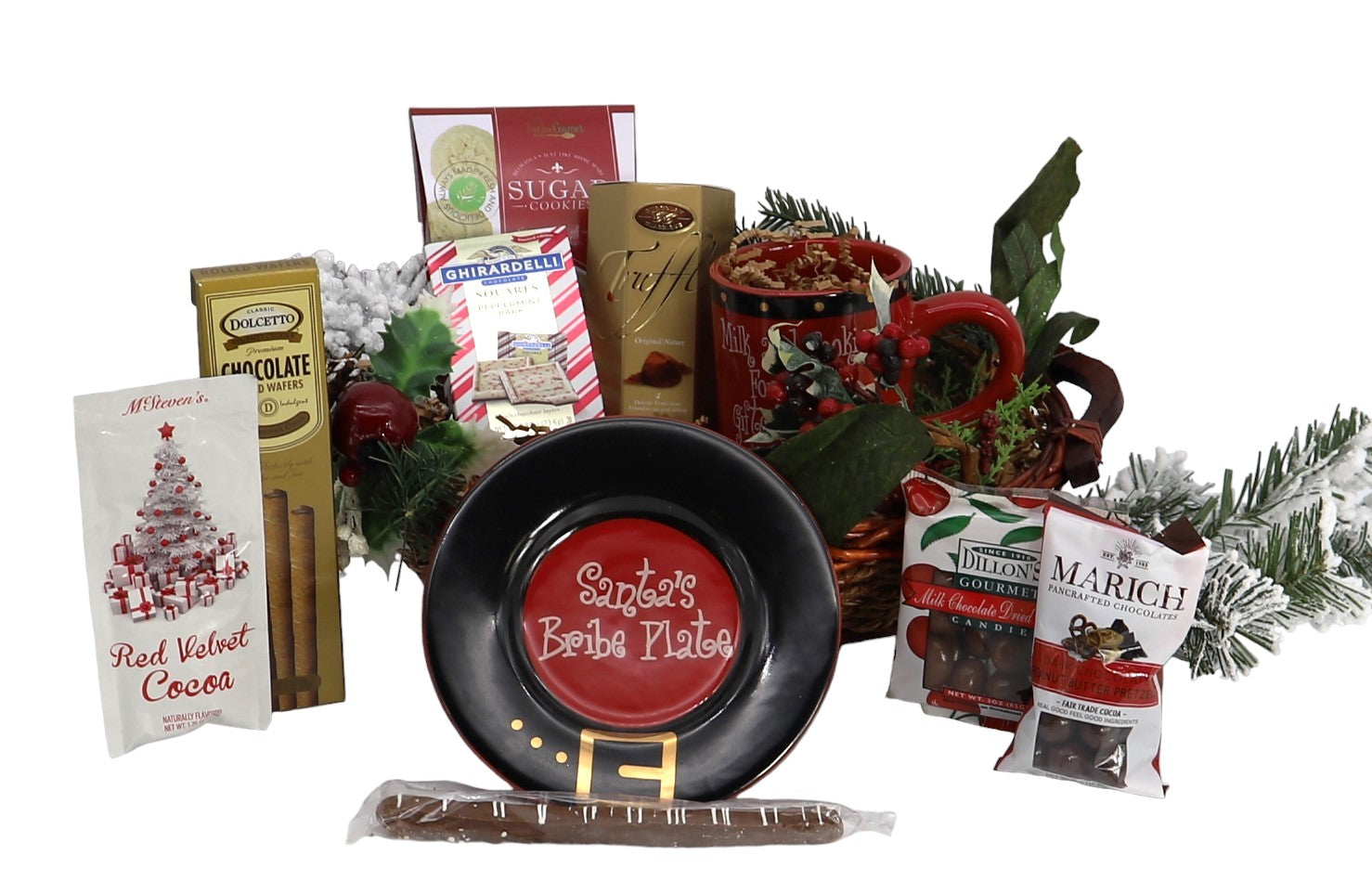 Share joy and sweetness with a festive basket complete with mug and Santa cookie plate.