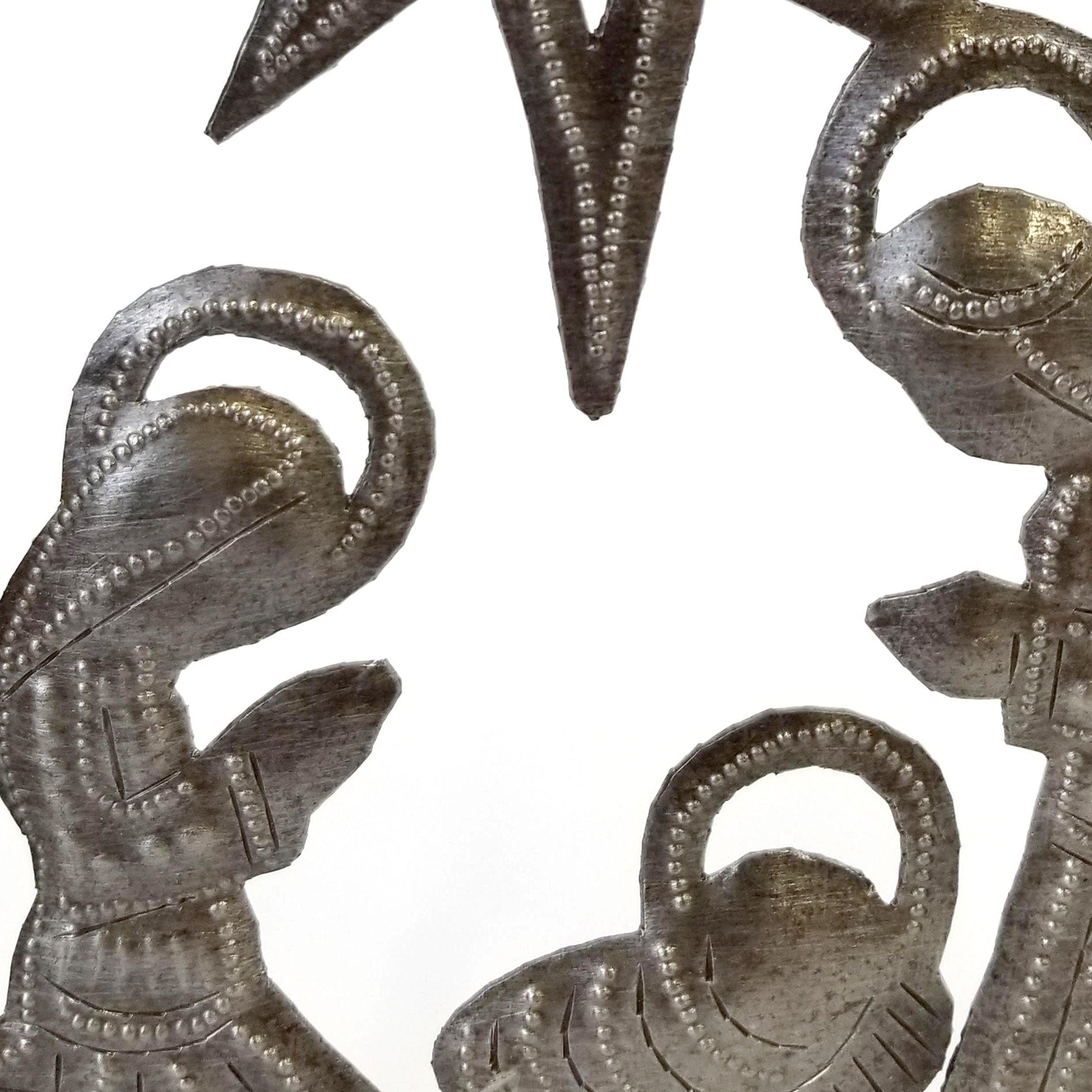 This handmade nativity scene decoration tells the birth of Christ in 3 metal panels: the Holy Family, the Three Kings, and stable animals.