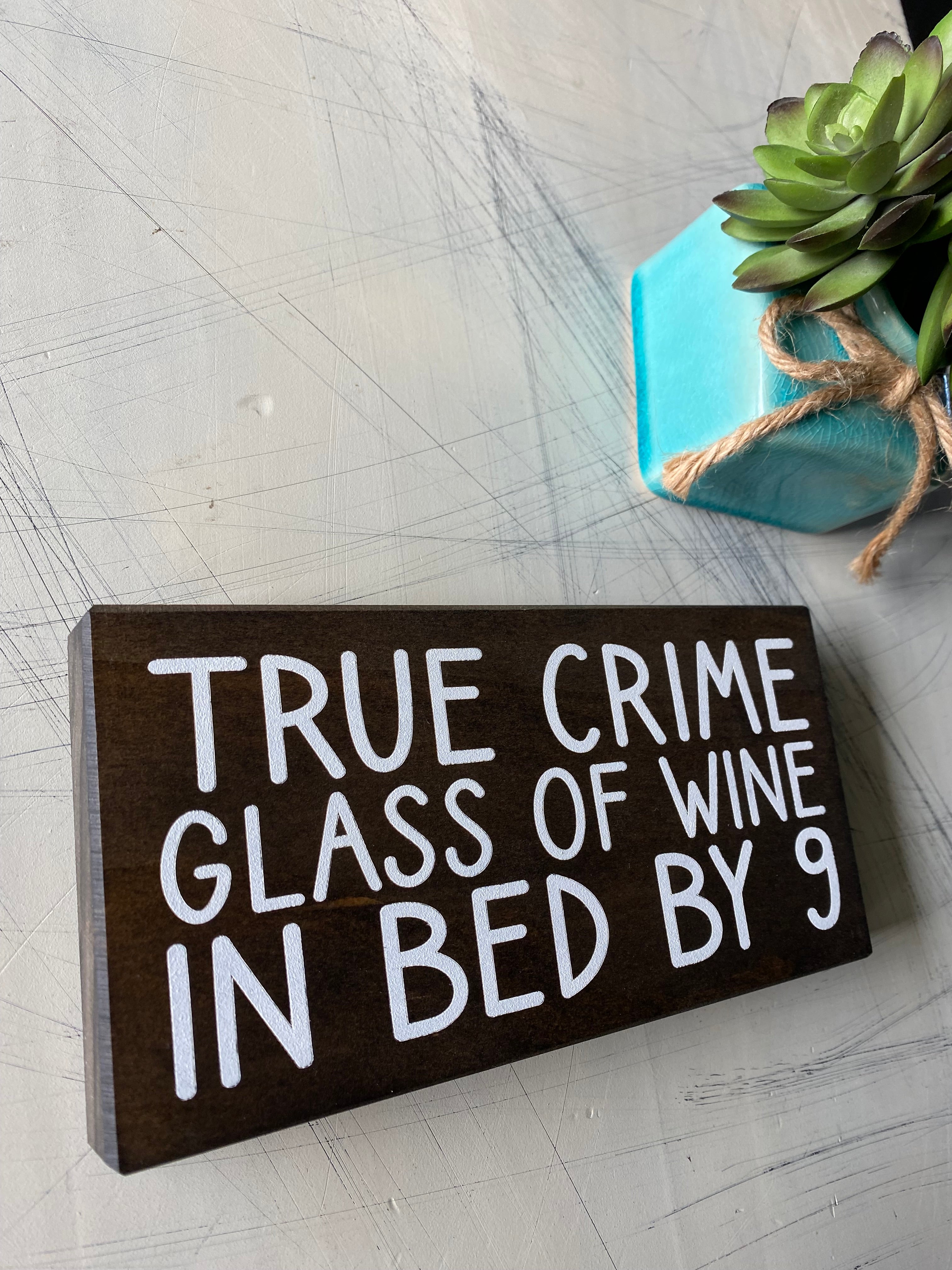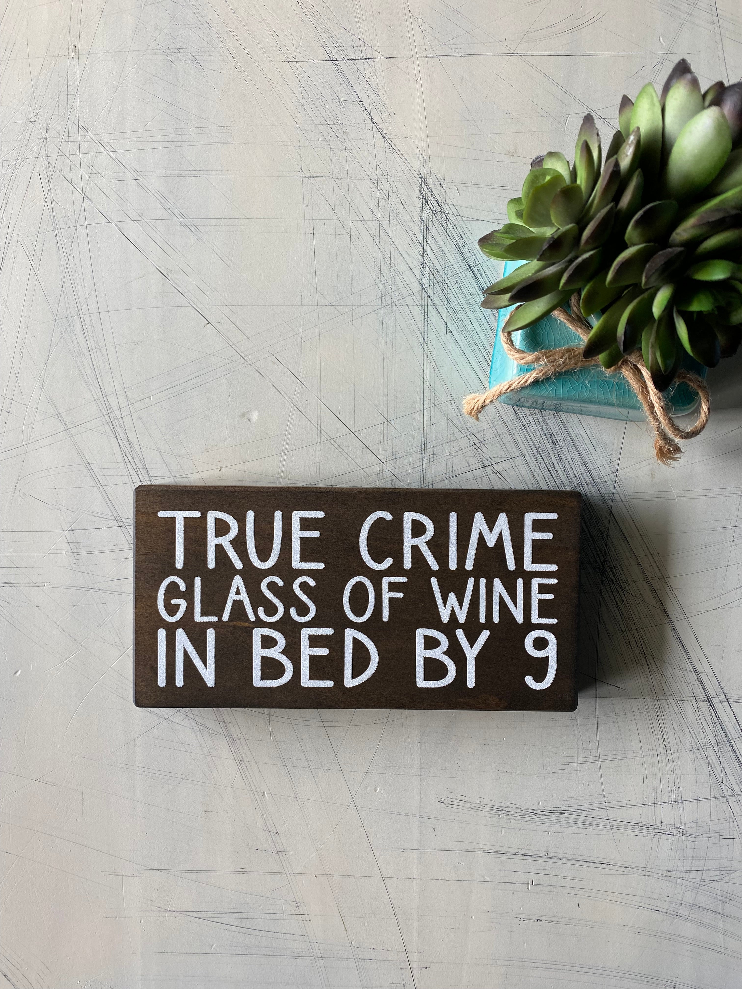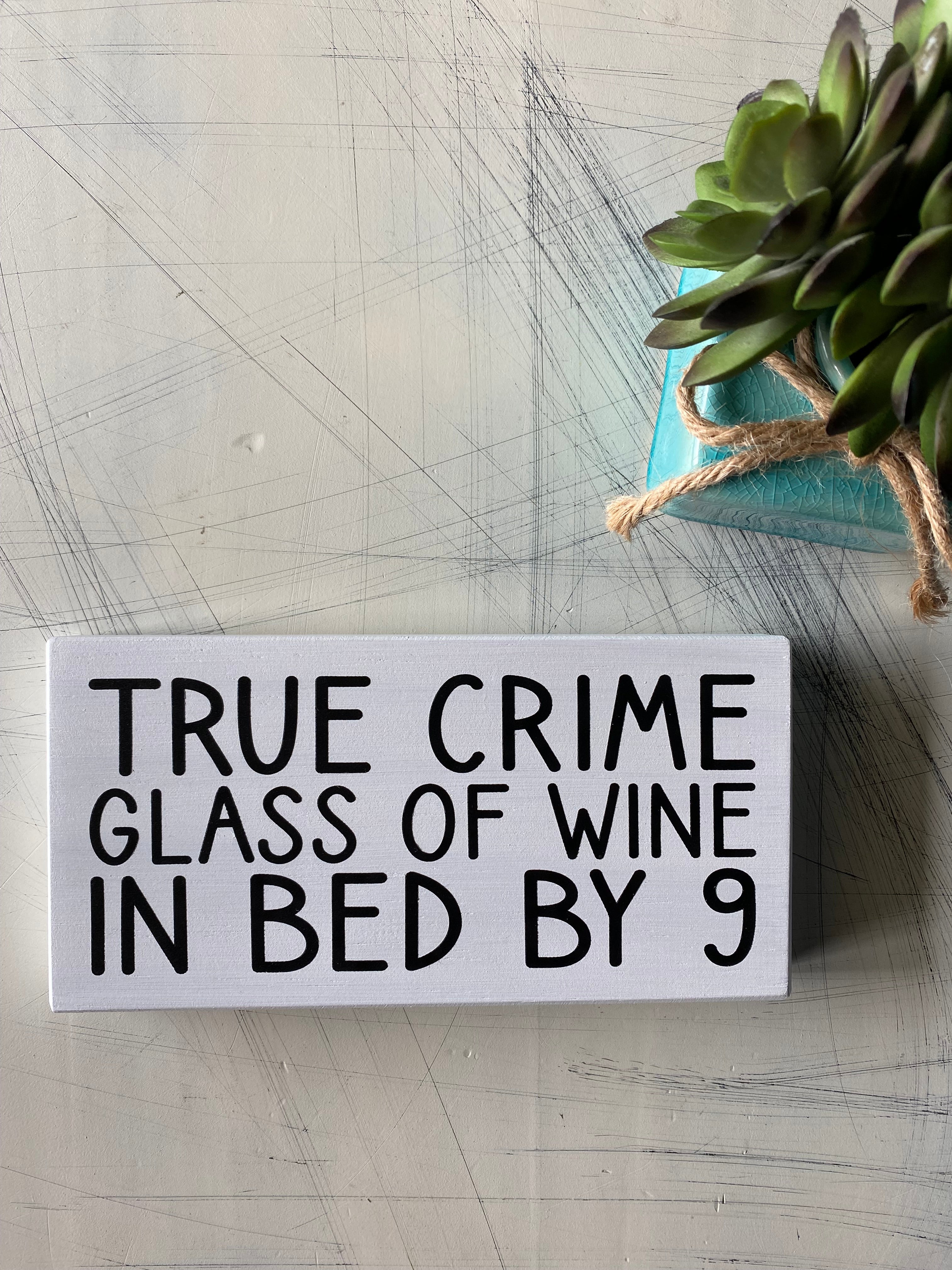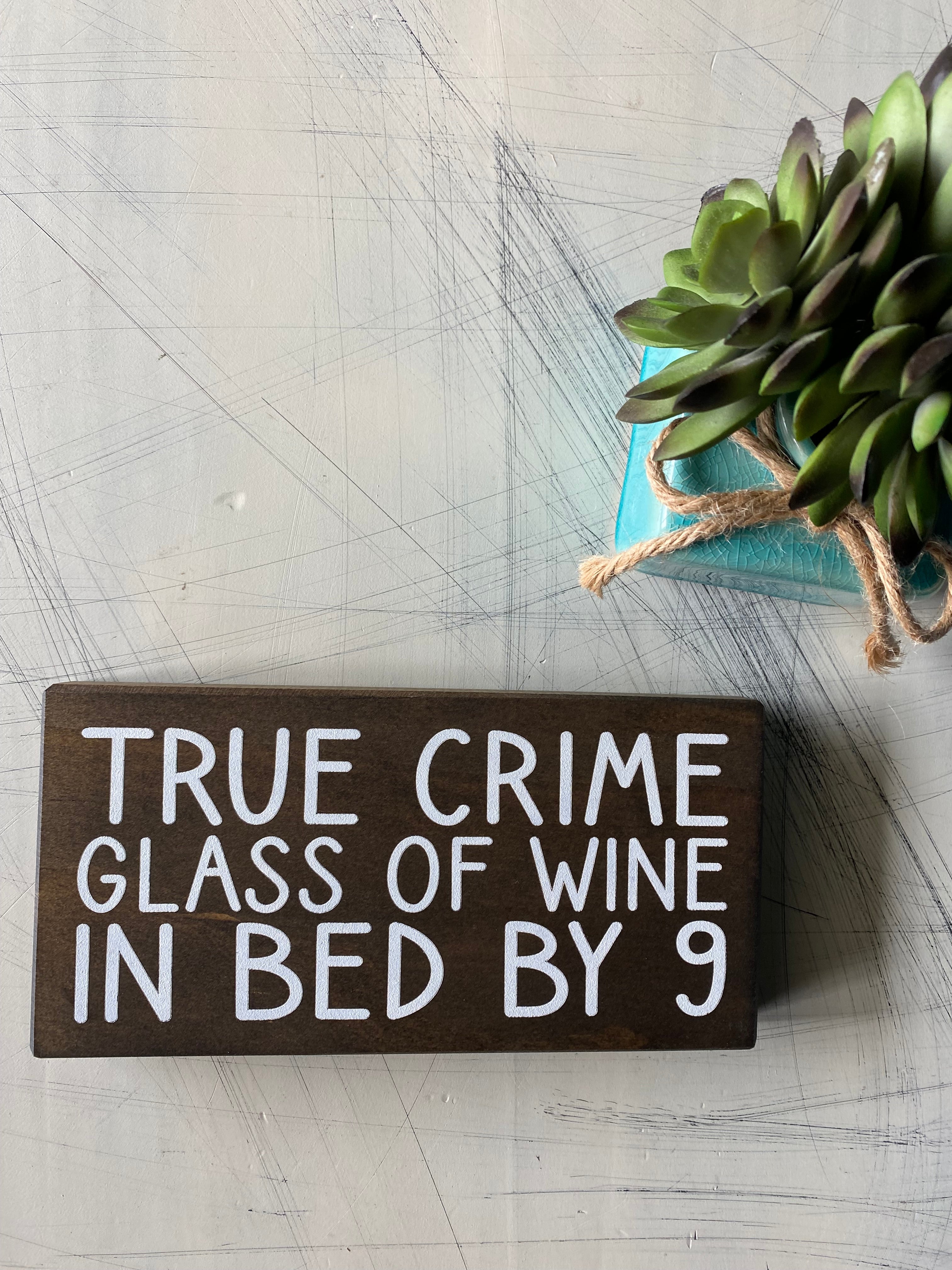 Enjoy a cozy night in with True Crime, Glass of Wine, in Bed by 9. This stylish sign is made from wood, perfect for any true crime fan's space. Enjoy your favorite glass of wine and relax with other true crime lovers in the comfort of your own home. Who said crime doesn't pay?
