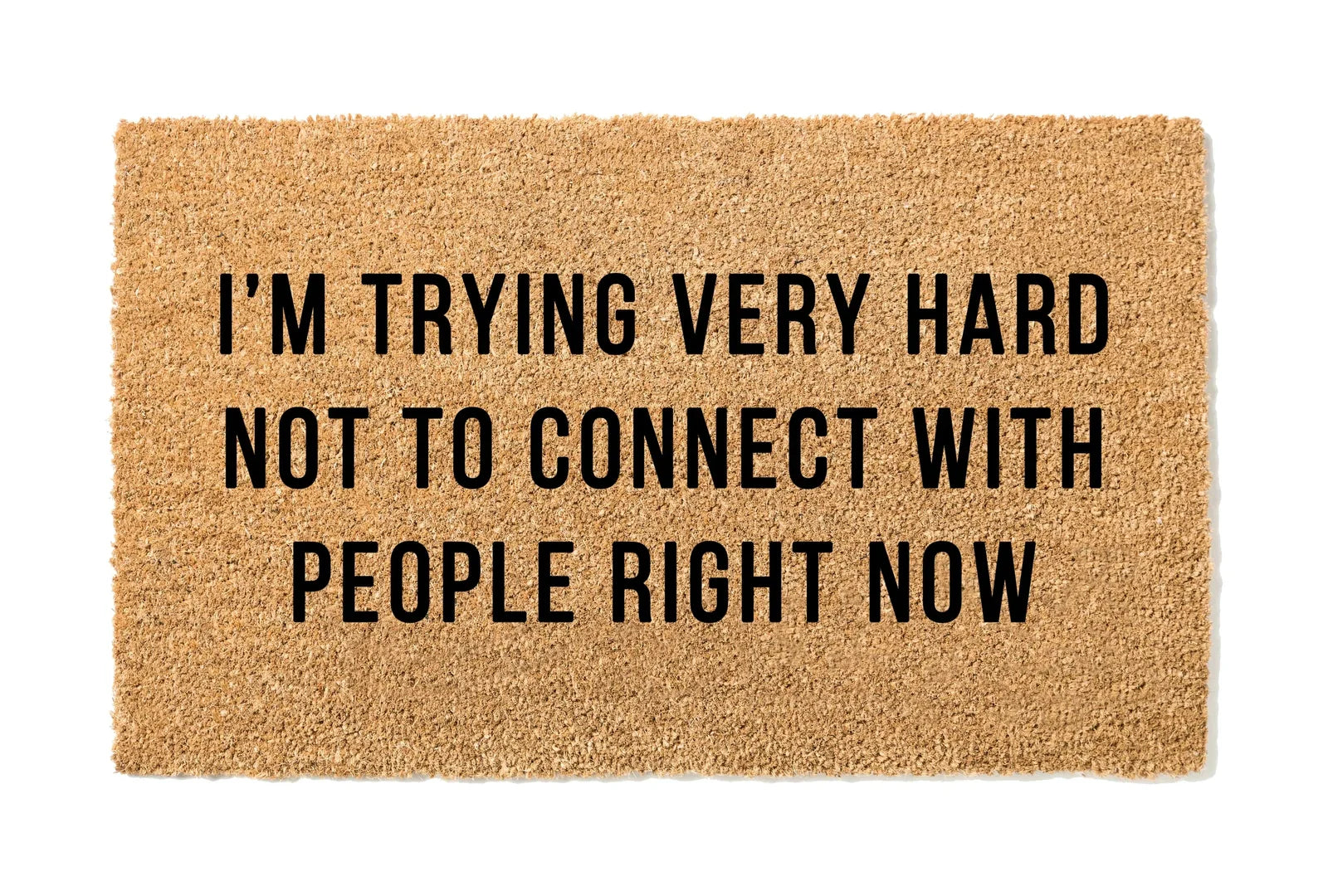 Elevate the charm of your front door with the well-craftedTrying Very Hard Not To Connect With People Right Now outdoor coir doormat by Homebound Society. Crafted with meticulous attention to detail, our custom personalized doormats add a delightful touch to any entryway. Each mat is lovingly handpainted with UV-resistant paint and features a non-slip PVC rubber backing for enhanced stability.