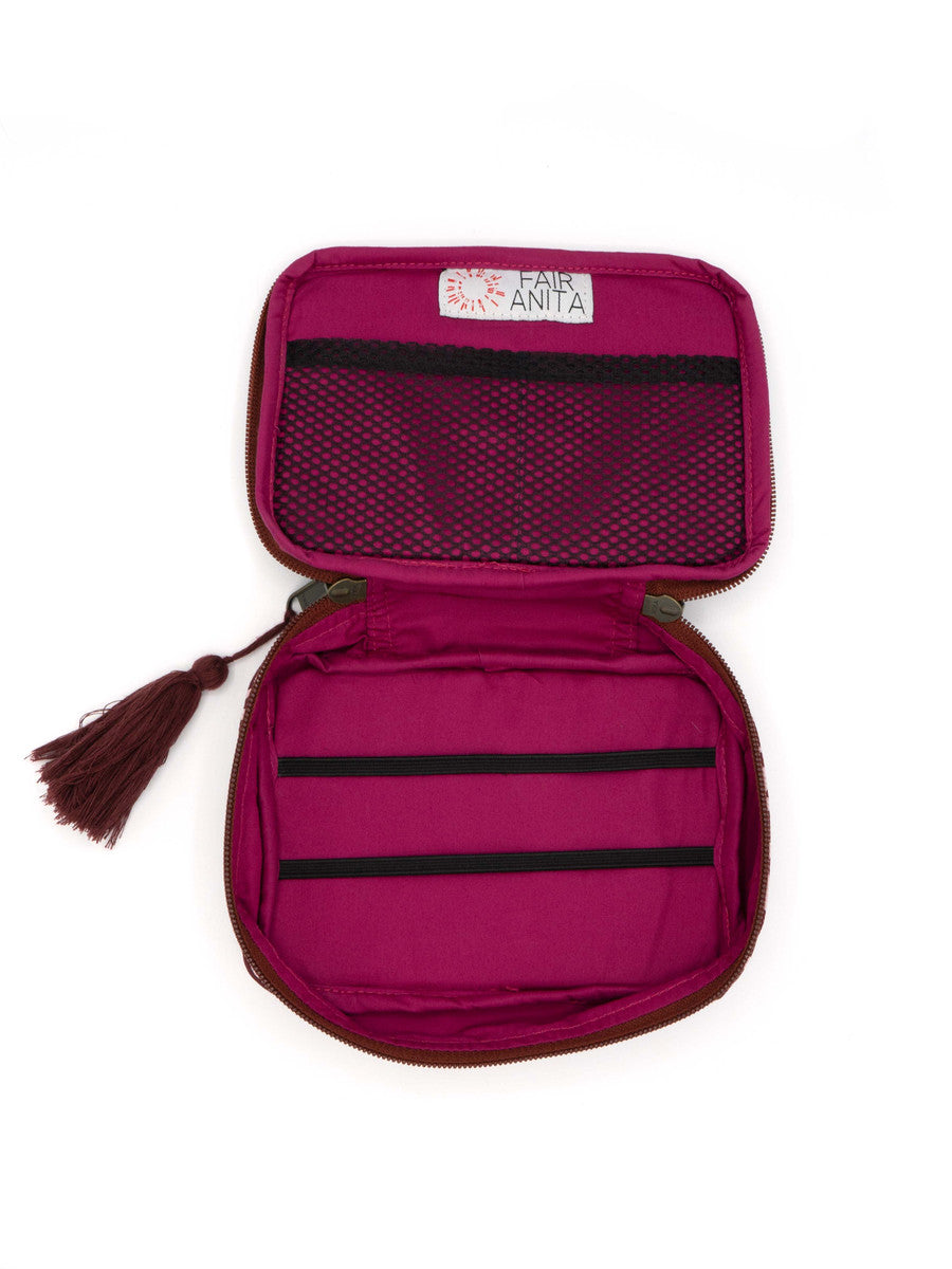 This fair trade jewelry case measures 7" long x 5.5" high x 1" wide. Screen printed in Cambodia.