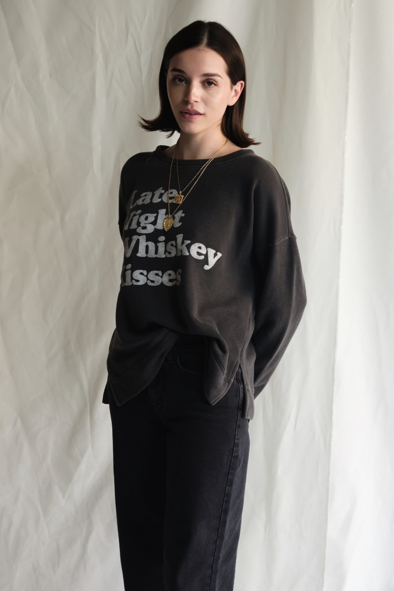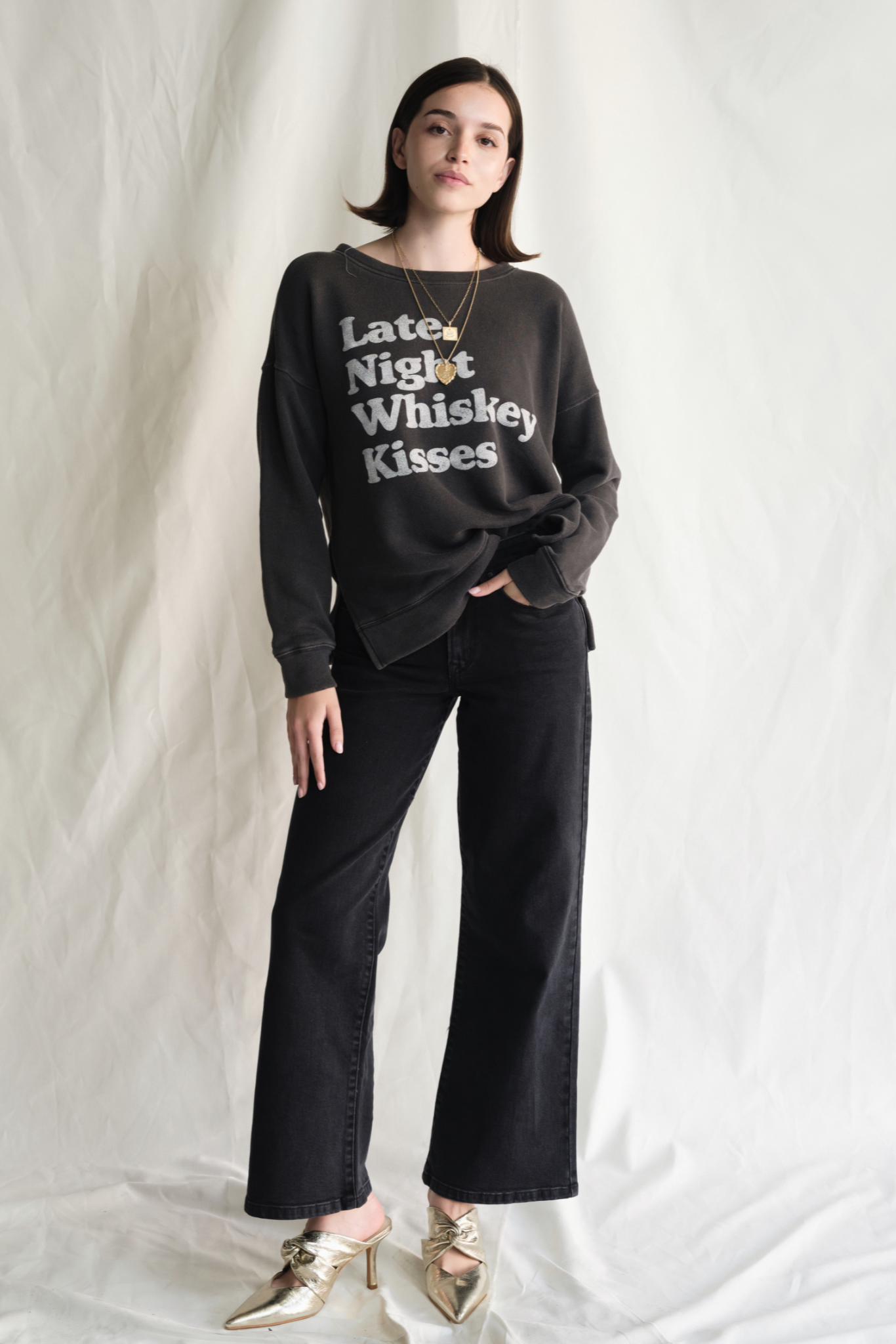 Ready for those late nights and sweet moments? This vintage black pullover sweatshirt is for the romantics and the rebels. Made for ultimate comfort, this crewneck features a bold, vintage-inspired "Late Night Whiskey Kisses" print. The classic black wash gives it a lived-in, effortless feel that's perfect for cozy nights in or daring nights out.