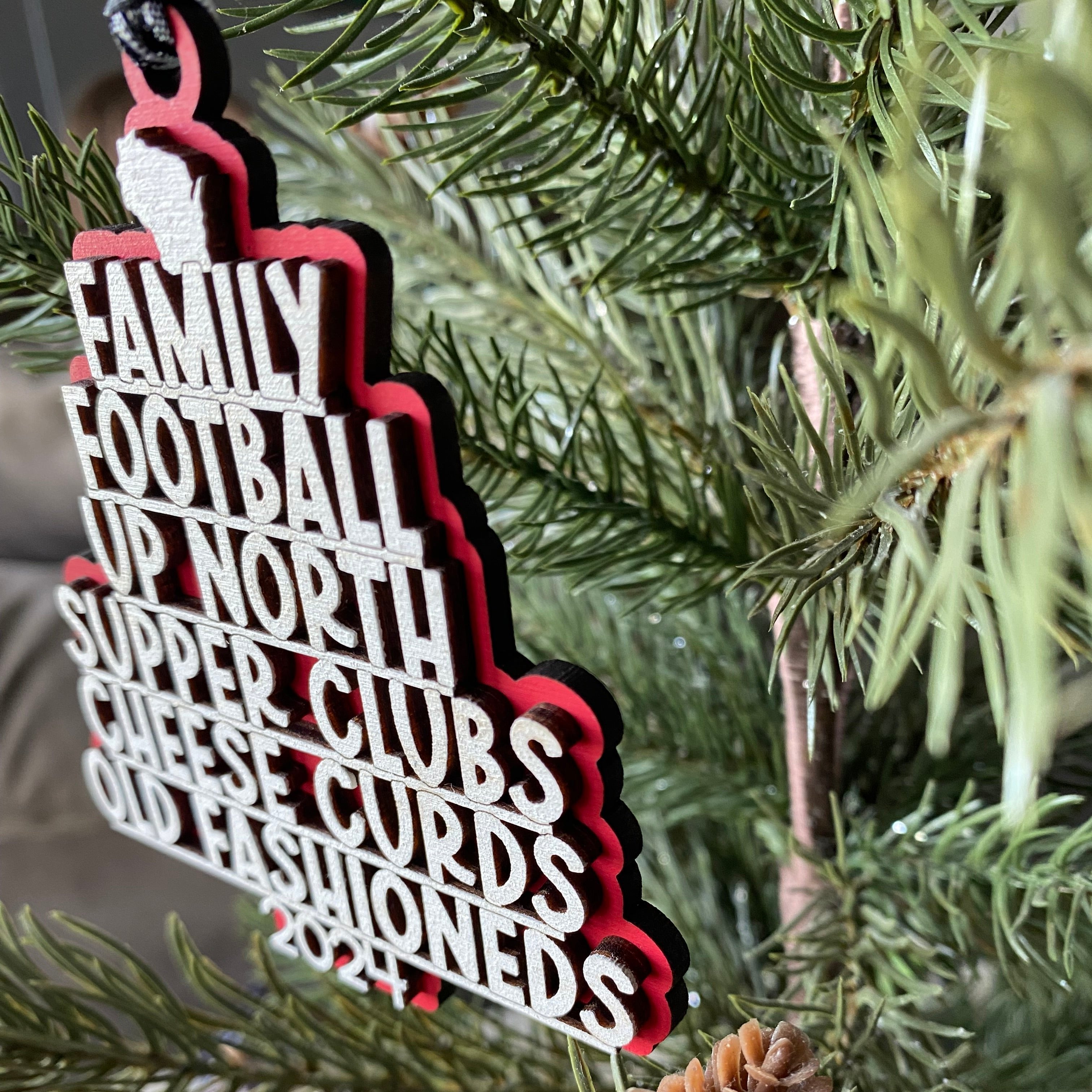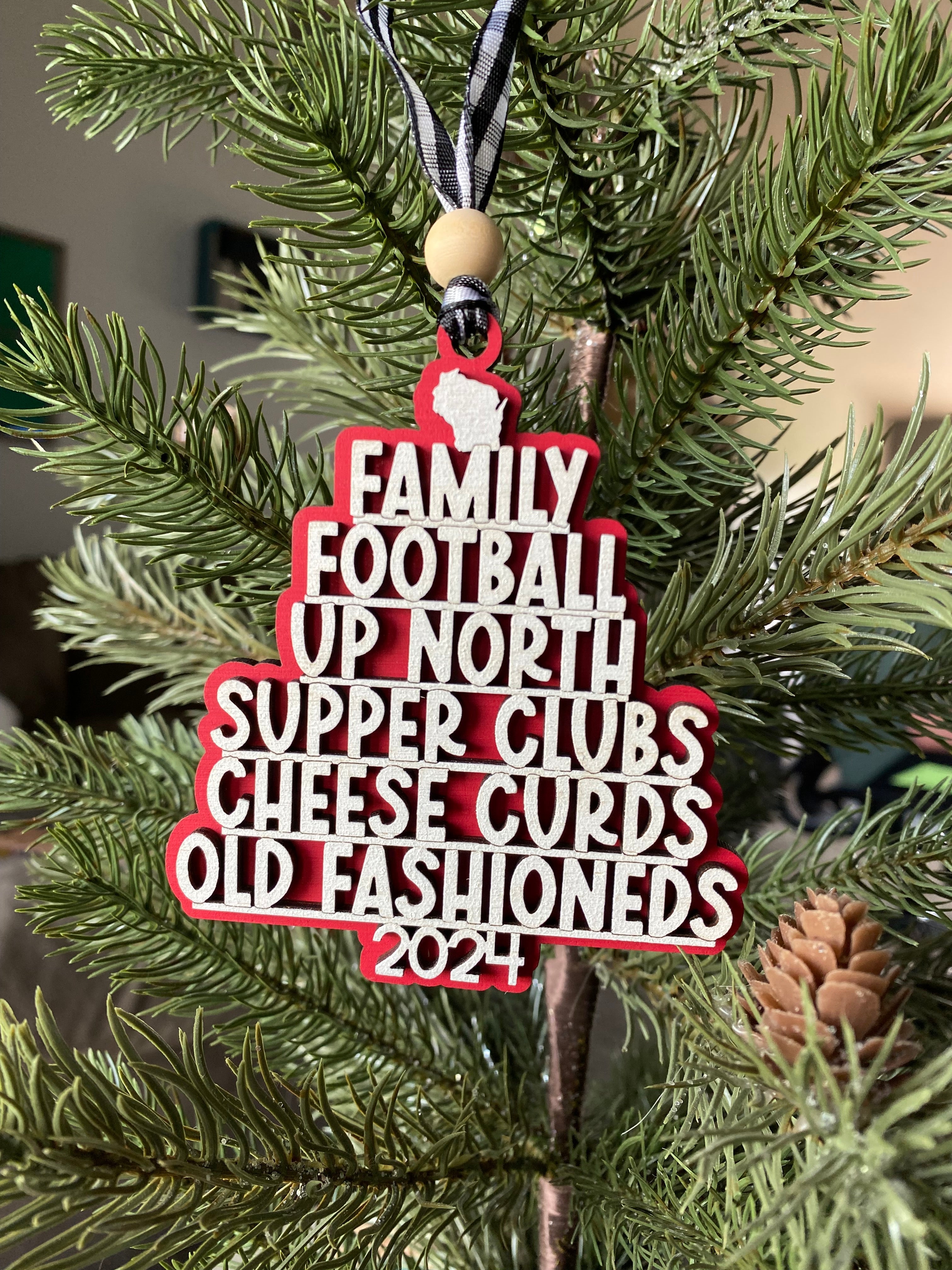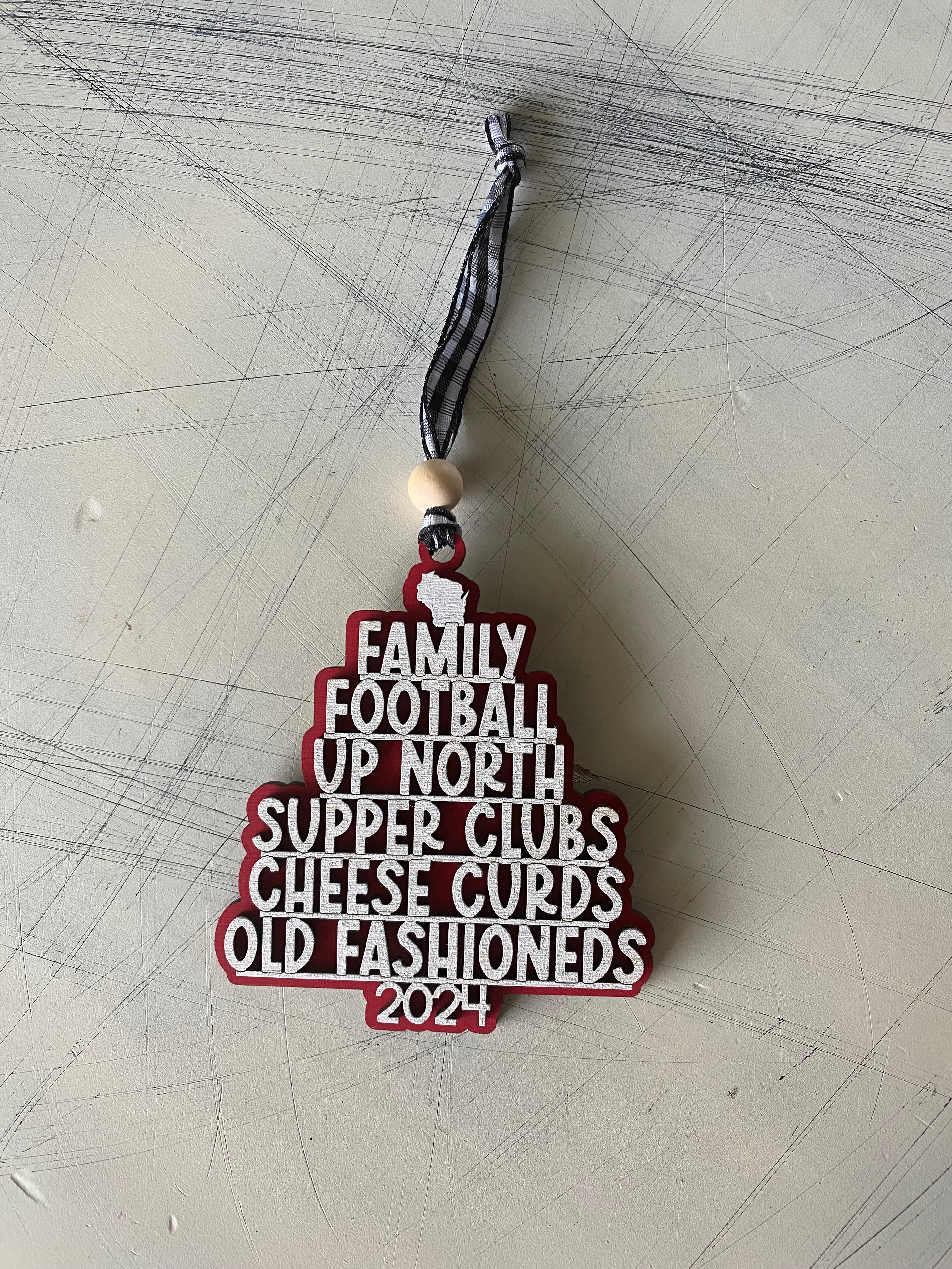 4-inch tall tree-shaped ornament features some Wisconsin favorites in white with a Wisconsin “tree topper” and a red hand-painted backer. Natural wood bead and black and white buffalo plaid ribbon attached.