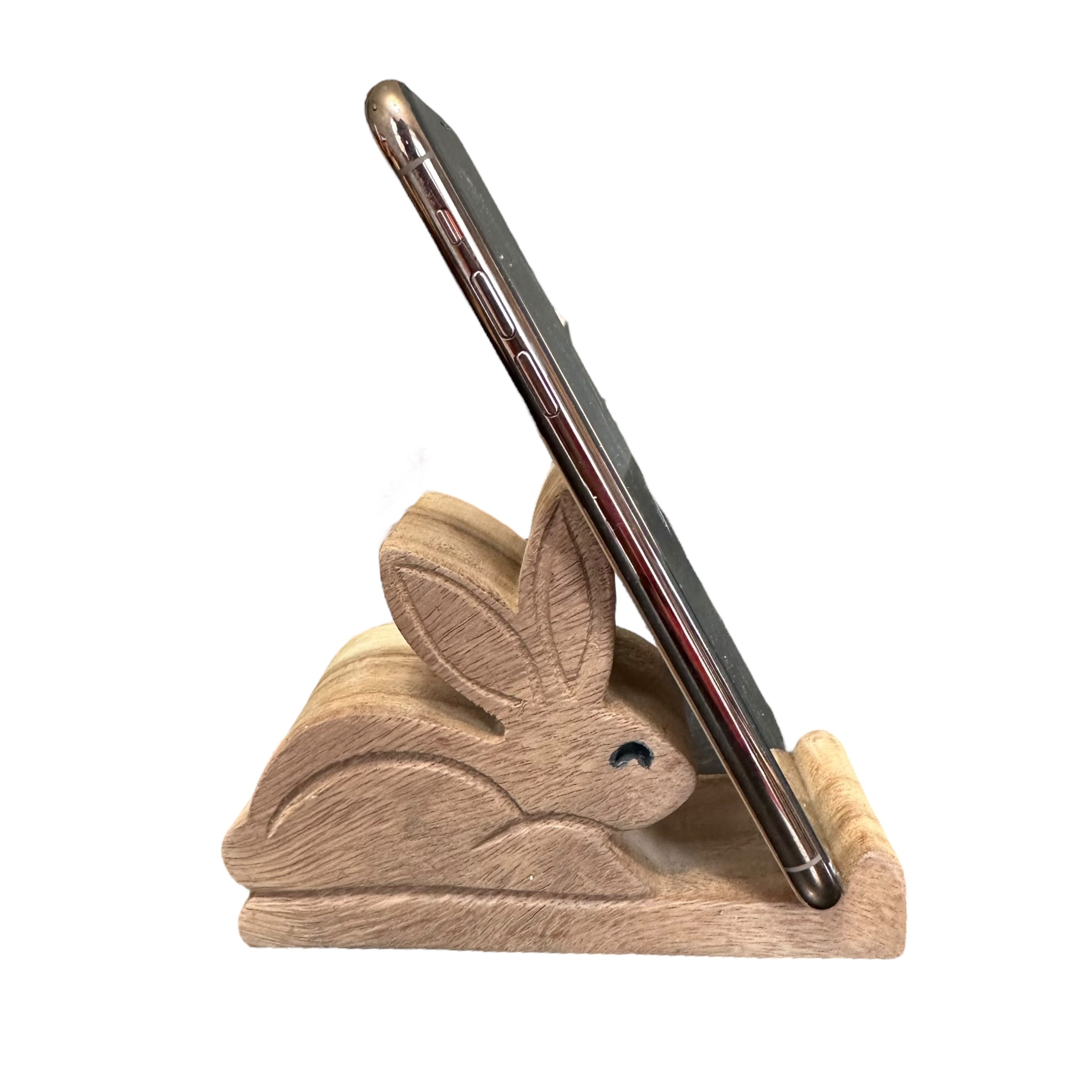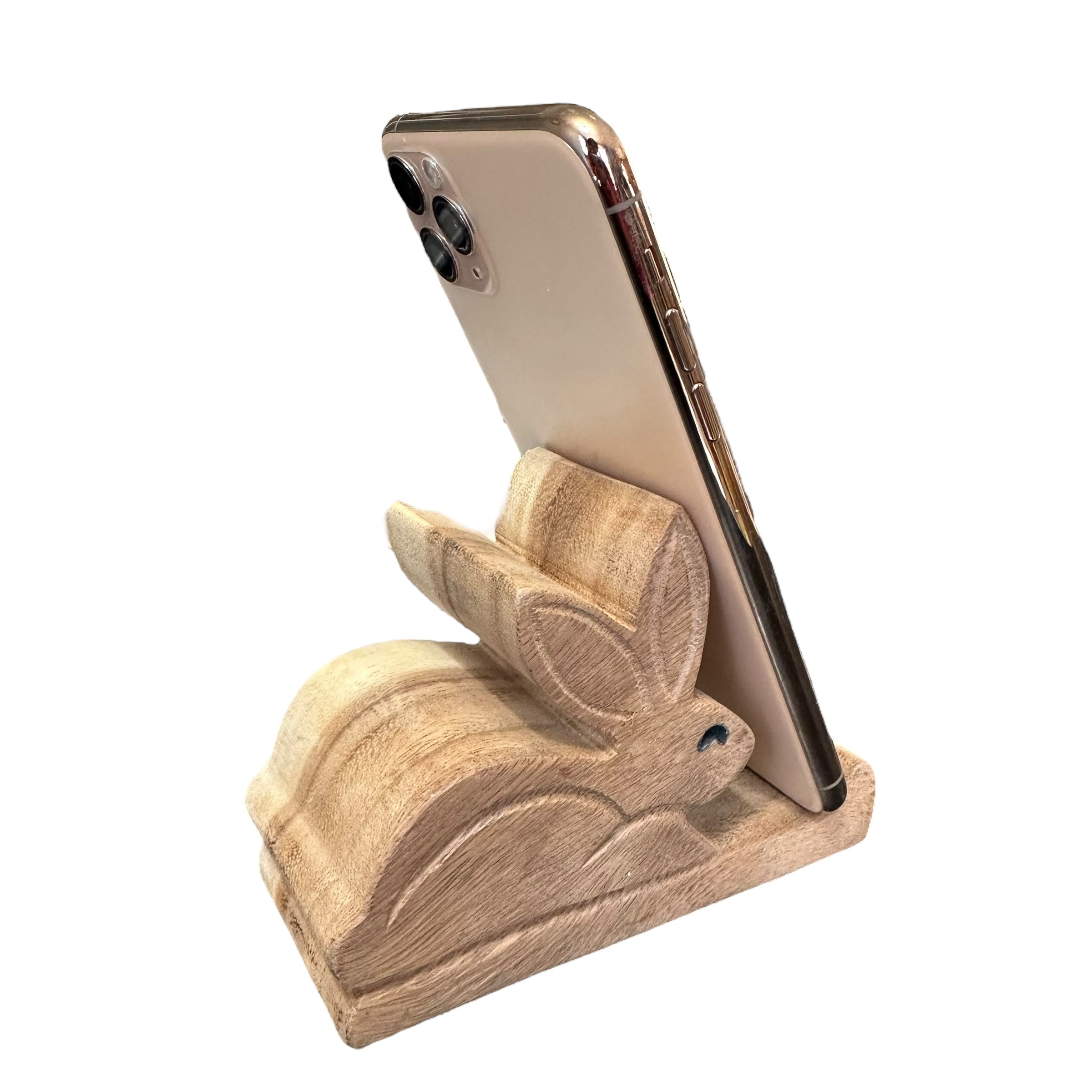 a delightful blend of functionality and charm. Crafted from natural wood, this adorable stand securely holds your phone in portrait or landscape mode. Perfect for rabbit lovers or as a unique gift, it adds a touch of whimsy to any desk or nightstand.