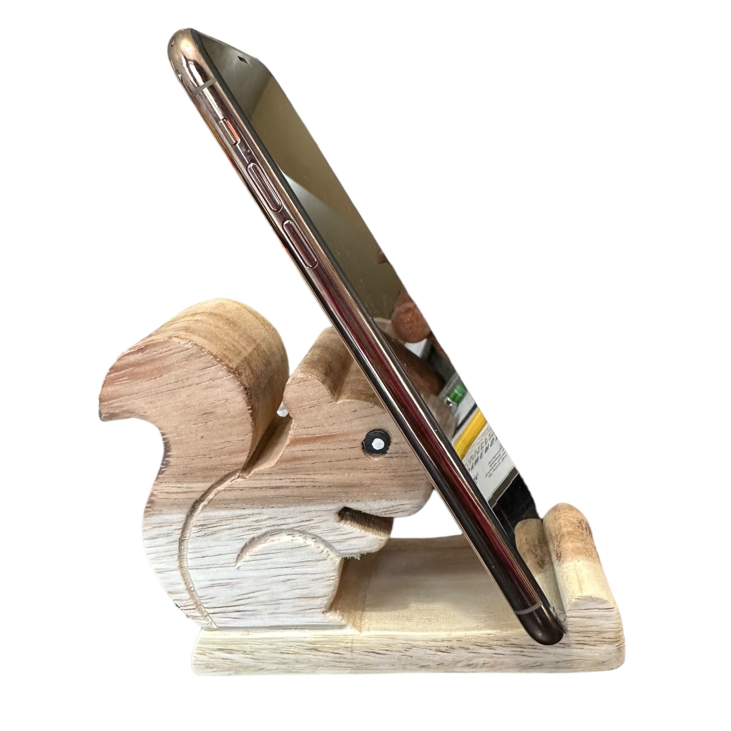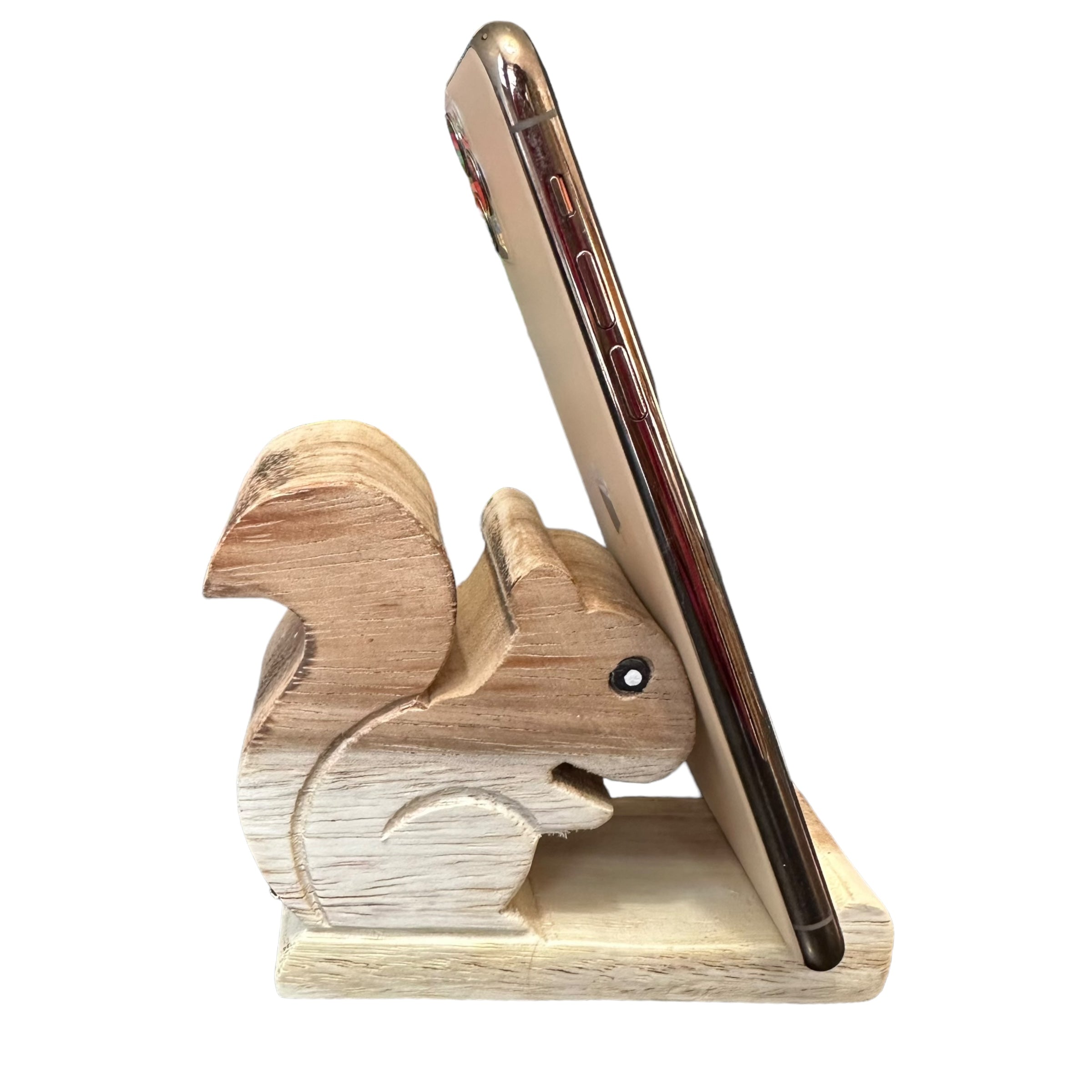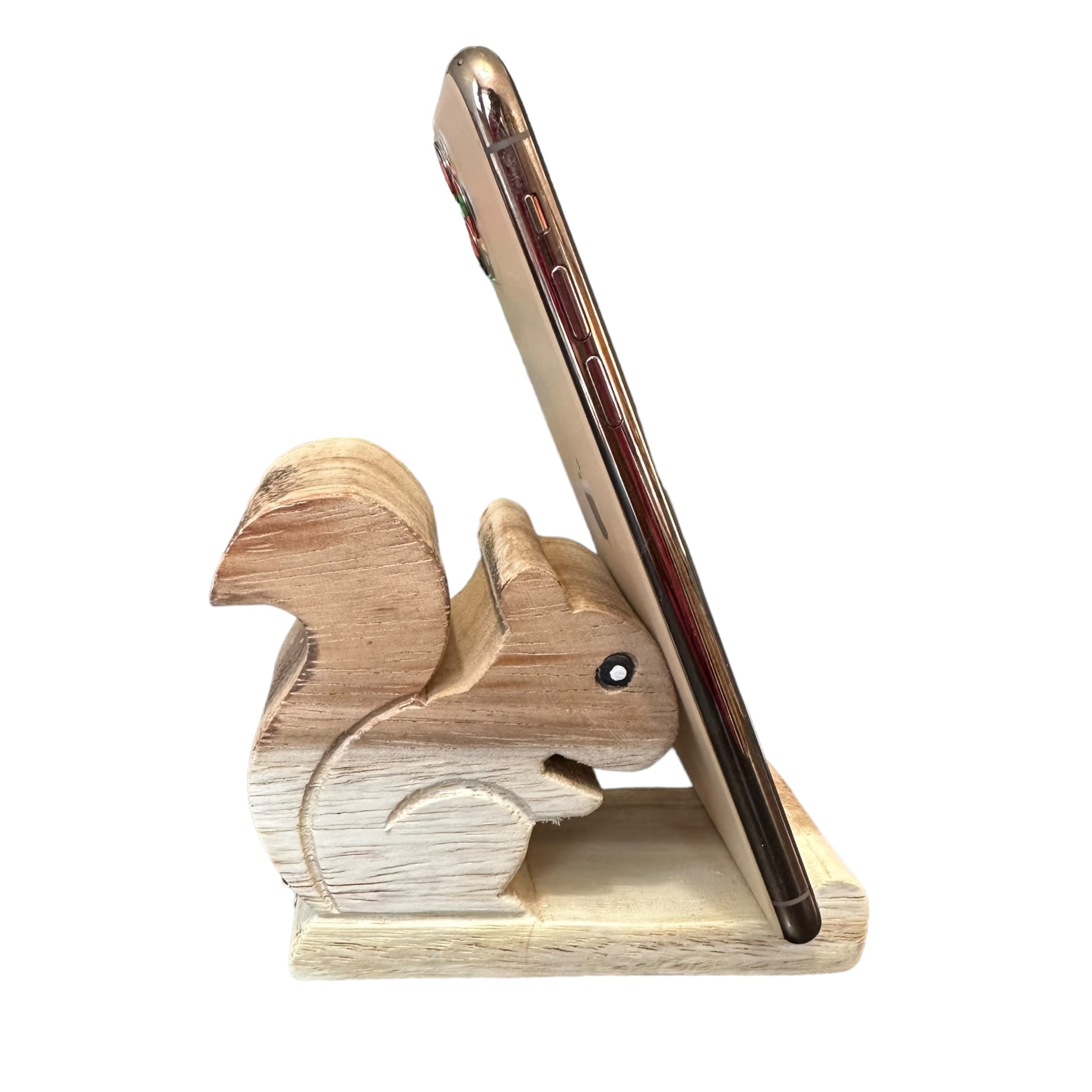 a delightful blend of functionality and charm. Crafted from natural wood, this adorable stand securely holds your phone in portrait or landscape mode. Perfect for squirrel lovers or as a unique gift, it adds a touch of whimsy to any desk or nightstand.
