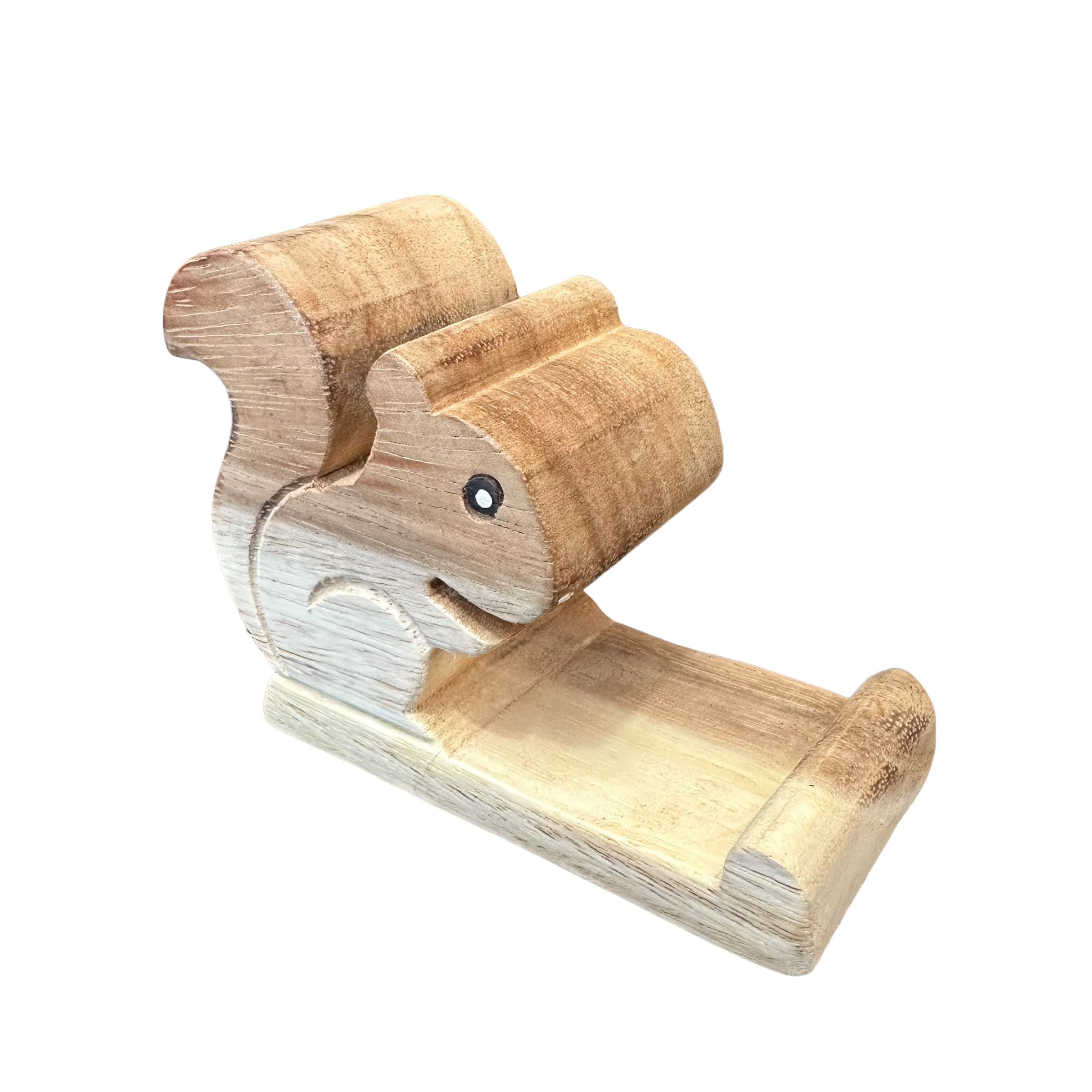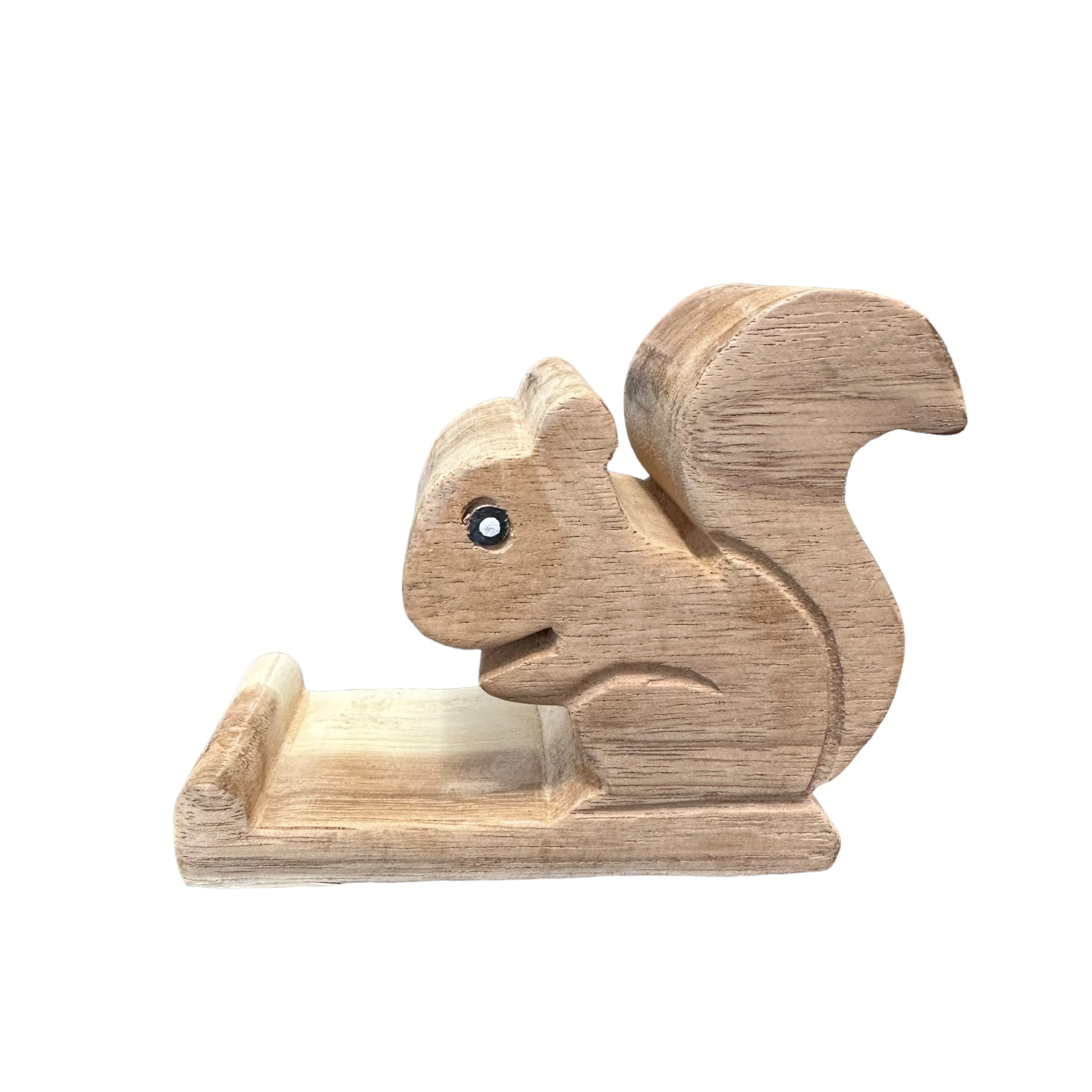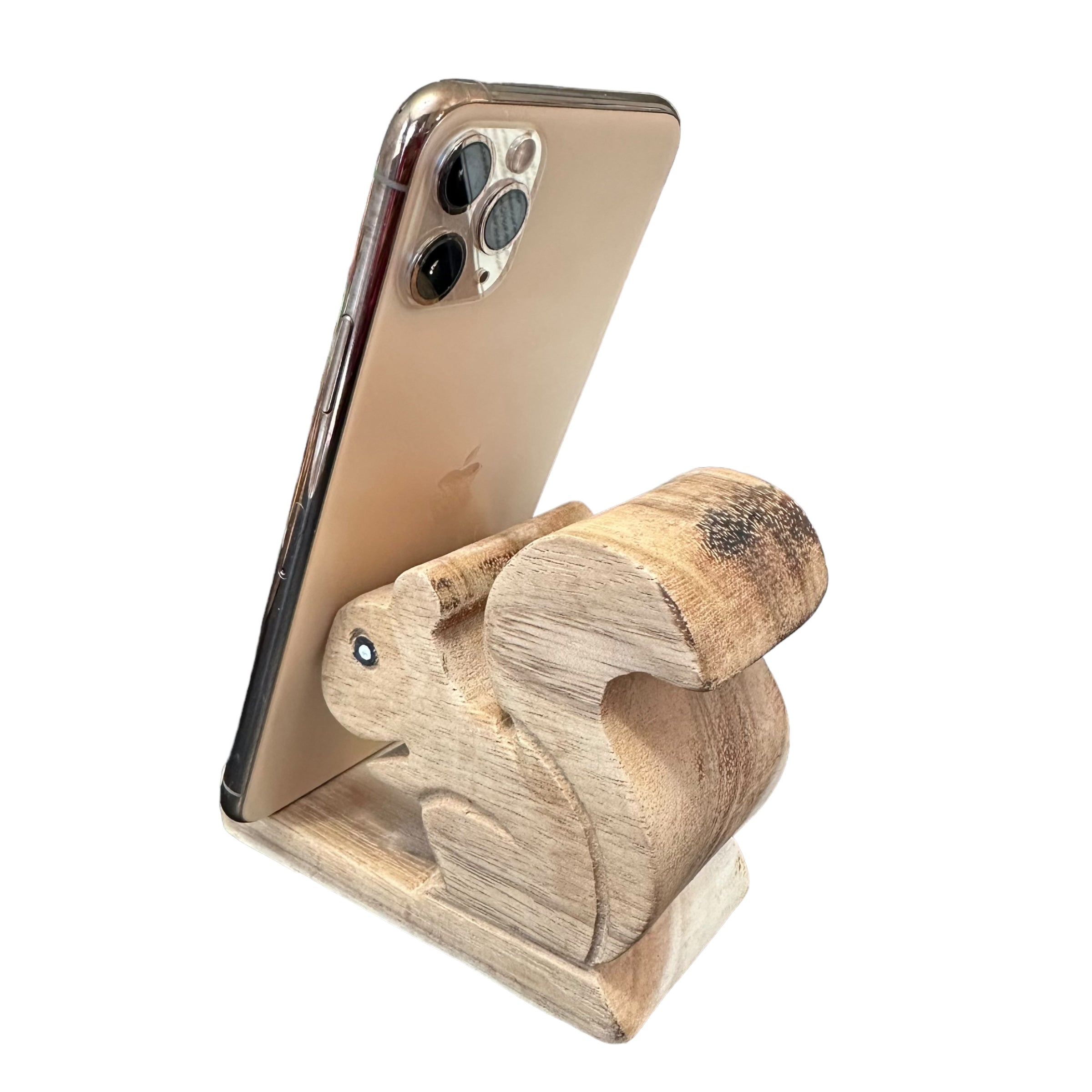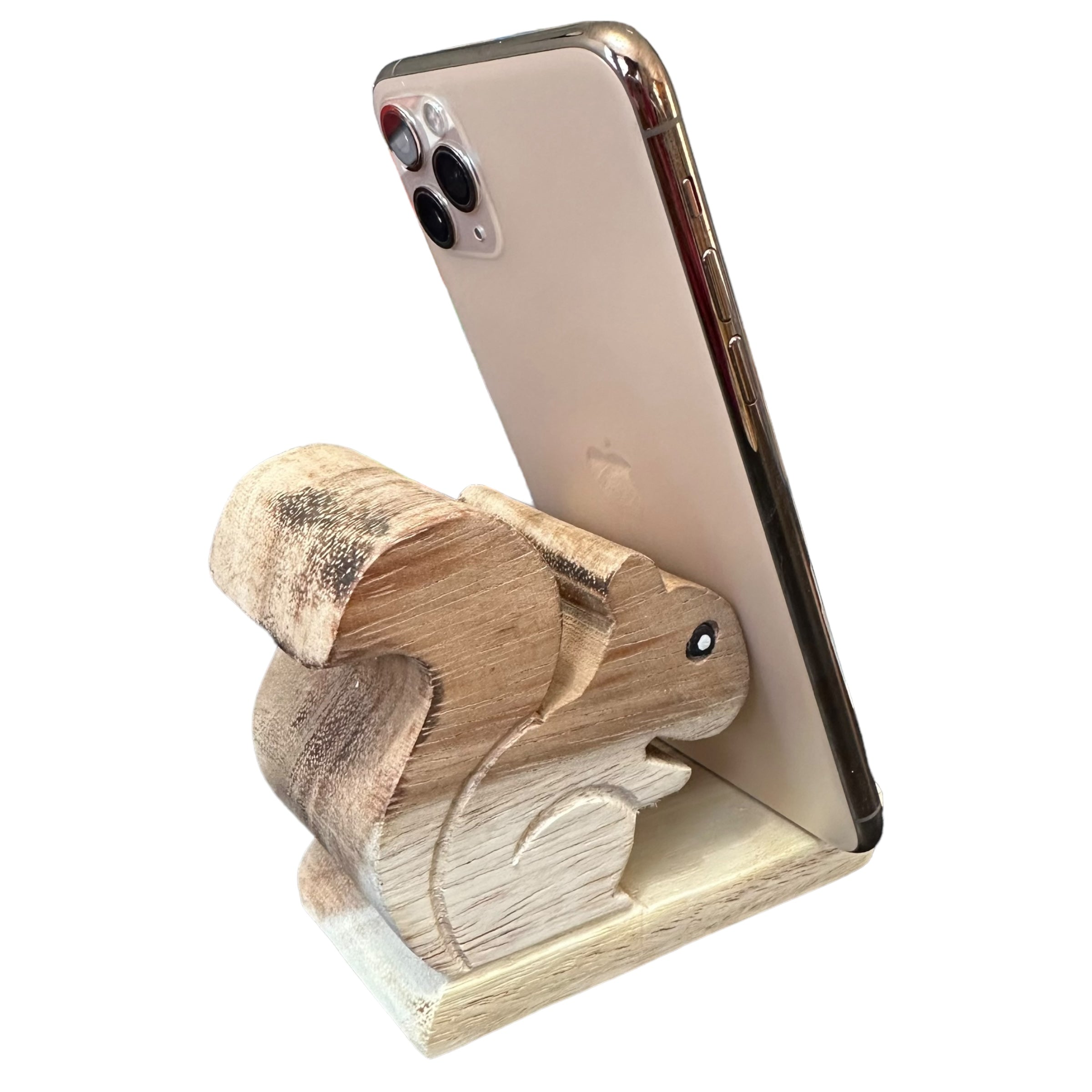 a delightful blend of functionality and charm. Crafted from natural wood, this adorable stand securely holds your phone in portrait or landscape mode. Perfect for squirrel lovers or as a unique gift, it adds a touch of whimsy to any desk or nightstand.