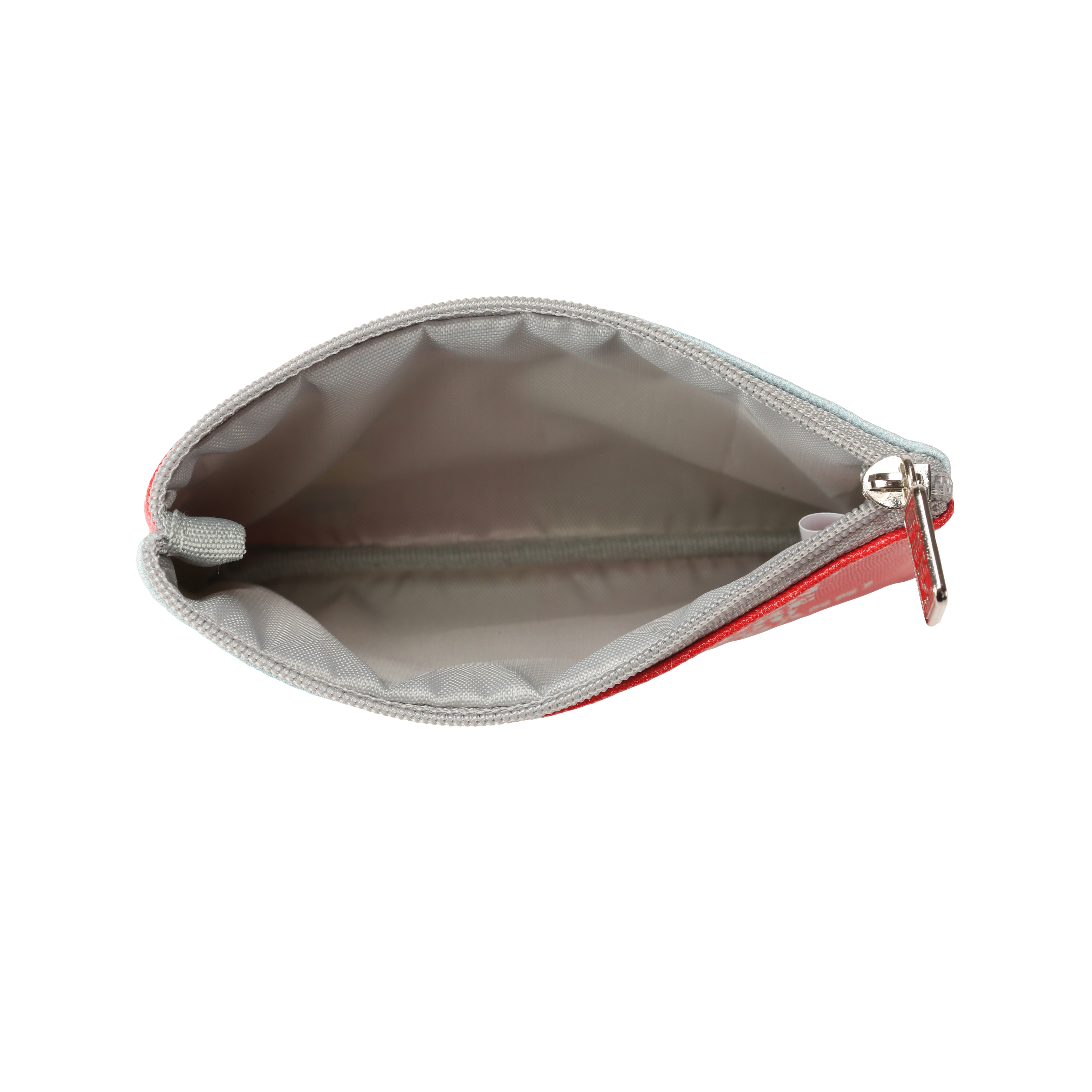 This coin bag with art on both sides, measures 3.5 inches tall x 5 inches wide. The outside is made of pleather. The inside lining is made of recycled polyester. Zippered closure with a logo stamped pull.