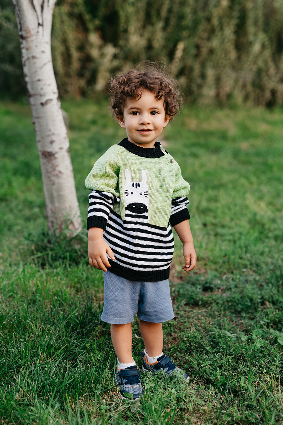 This adorable sweater features a friendly zebra design, with a cute 3D face and stripes that seamlessly blend into the lower half of the sweater, creating a fun and eye-catching contrast. The bright green top half adds a splash of color, while the bold black and white striped bottom makes it an instant favorite for little animal lovers.